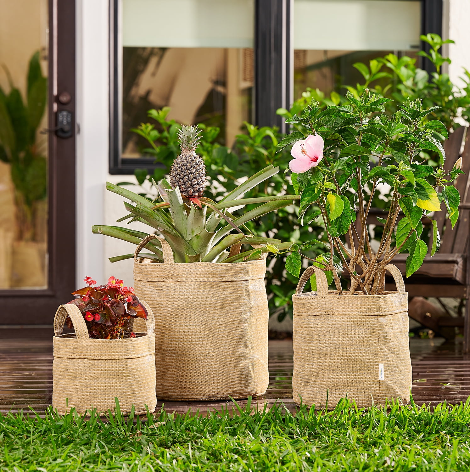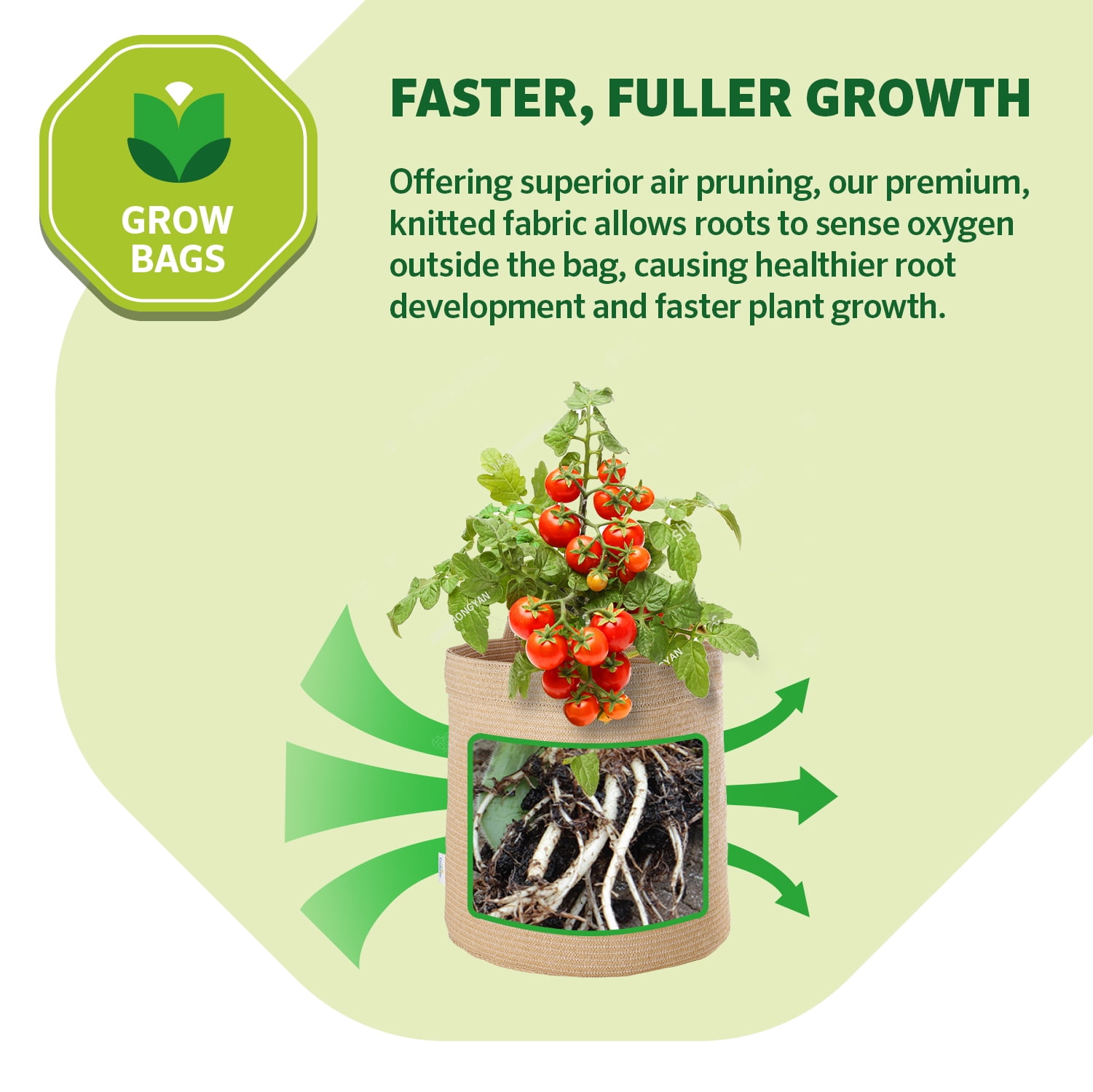 Durable HDPE breathable knitted fabric is lightweight and permeable allowing your garden to sprout more fibrous roots, accelerating growth and increasing plant yields The construction of the fabric increases water drainage and aeration to help protect your vegetables, fruits and herbs from overwatering as well as temperature regulation With heavy duty reinforced handles, these transportable grow bags make planting, moving and nurturing your garden a breeze These garden bags are easy to clean with water and can be conveniently stored year after year due to their compactable structure 100% Recyclable fabric, these fabric planters are naturally resistant to mold, mildew and are free from BPA, phthalate and lead chemicals