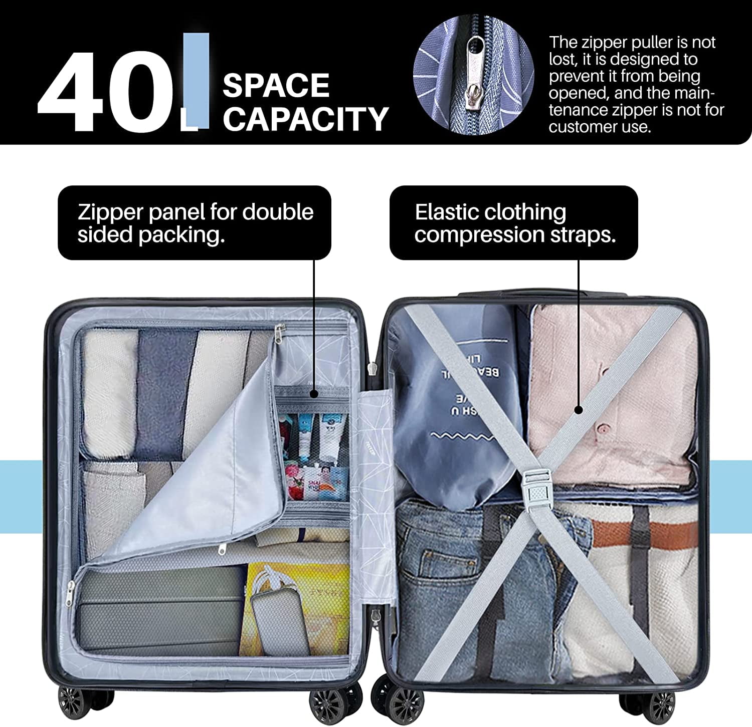 Luggage That Can Be Brought on the Plane: Say goodbye to checking in your luggage with this 20-inch suitcase. It meets the standard size requirements set by airlines, allowing you to bring it on the plane as a carry-on item. Enjoy the ease and efficiency of traveling with your luggage by your side. Dimensions: 22.2″ x 7.6″ x 15.7″. USB Charging Port: Stay connected on the go with the built-in USB charging port. Simply place your power bank inside the luggage and connect it to the built-in interface. This convenient feature allows you to charge your devices anytime, anywhere, without the need to open your luggage. Keep your devices powered up and never miss a beat. Stronger Material: Our luggage is crafted from a golden ratio composite material, combining ABS and PC. This material is approved for its exceptional balance of firmness and flexibility. Rest assured that your belongings are well-protected, as our suitcases are designed to withstand the demands of travel while providing durability and reliability.