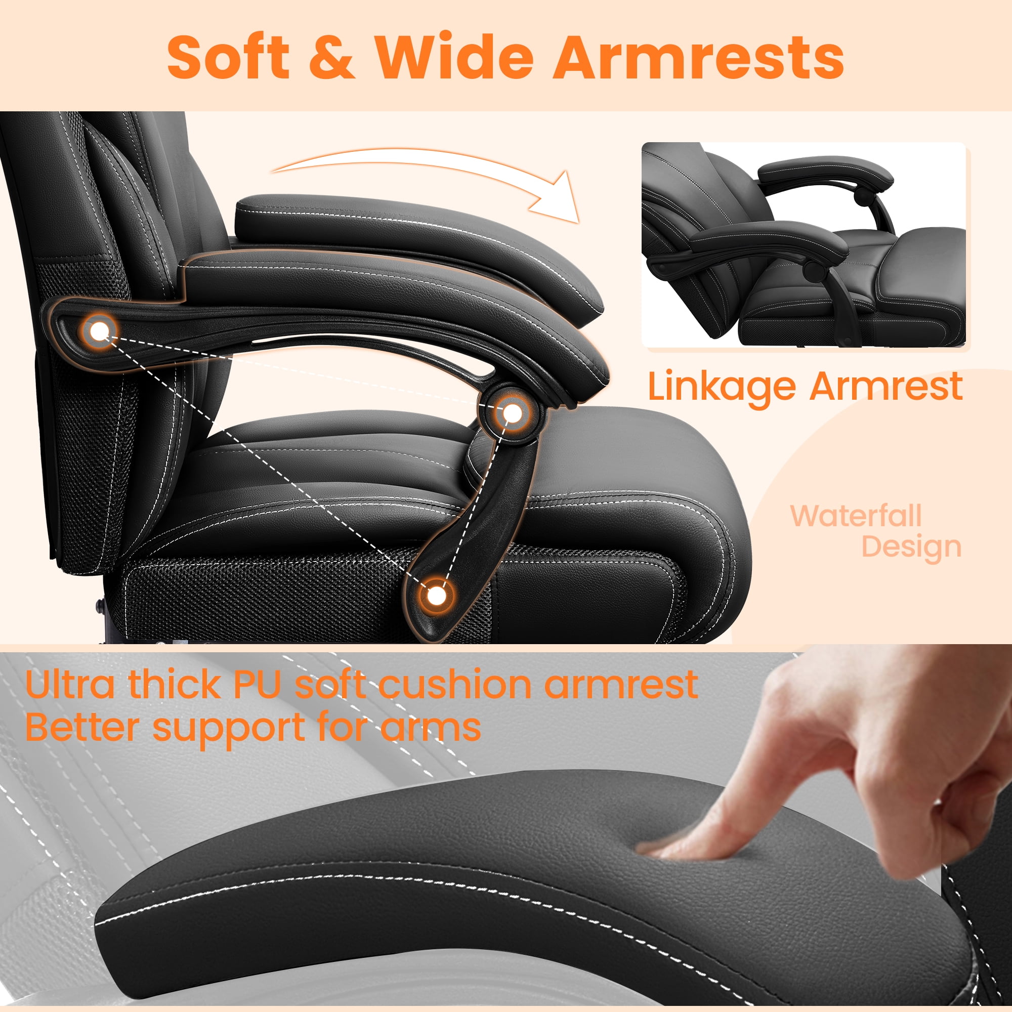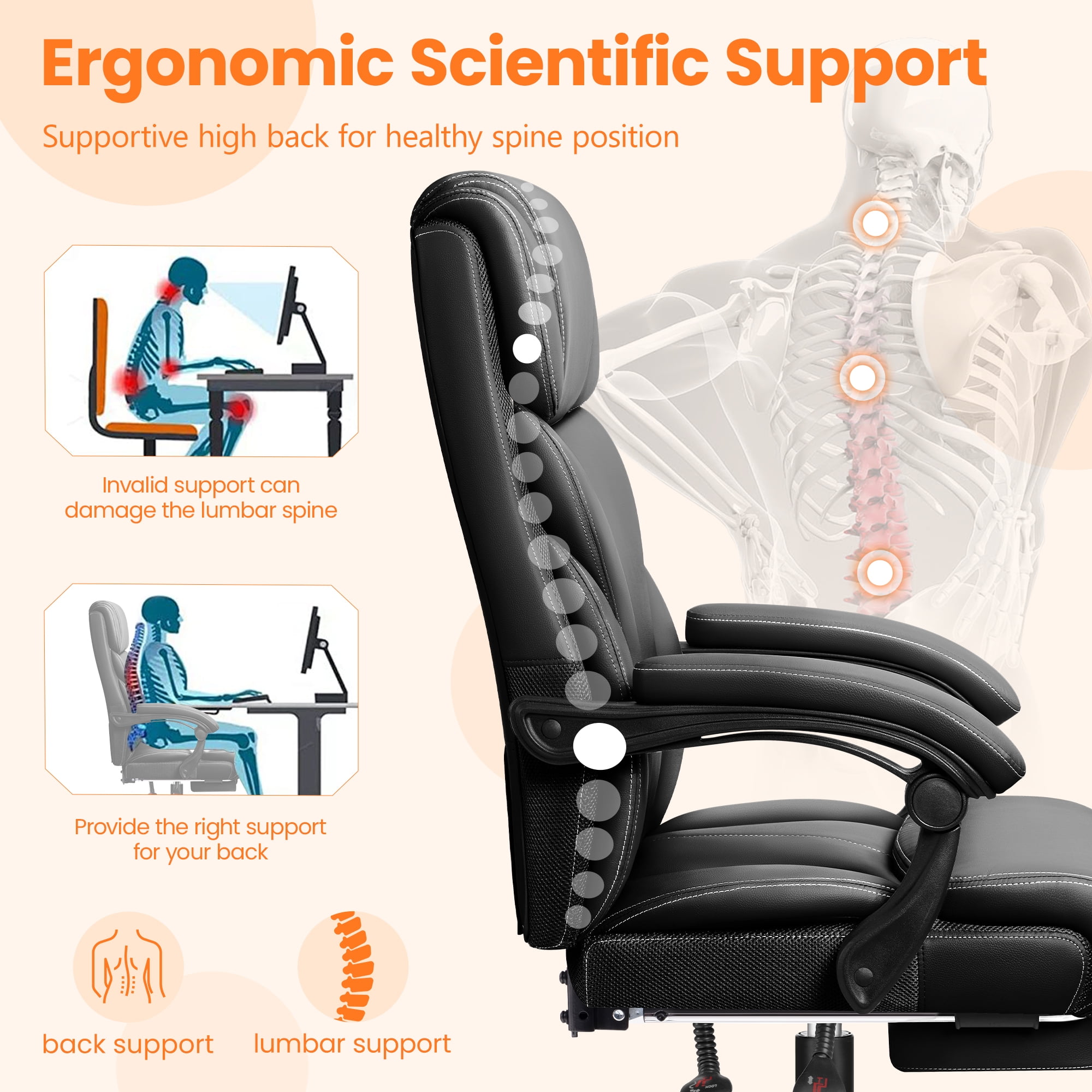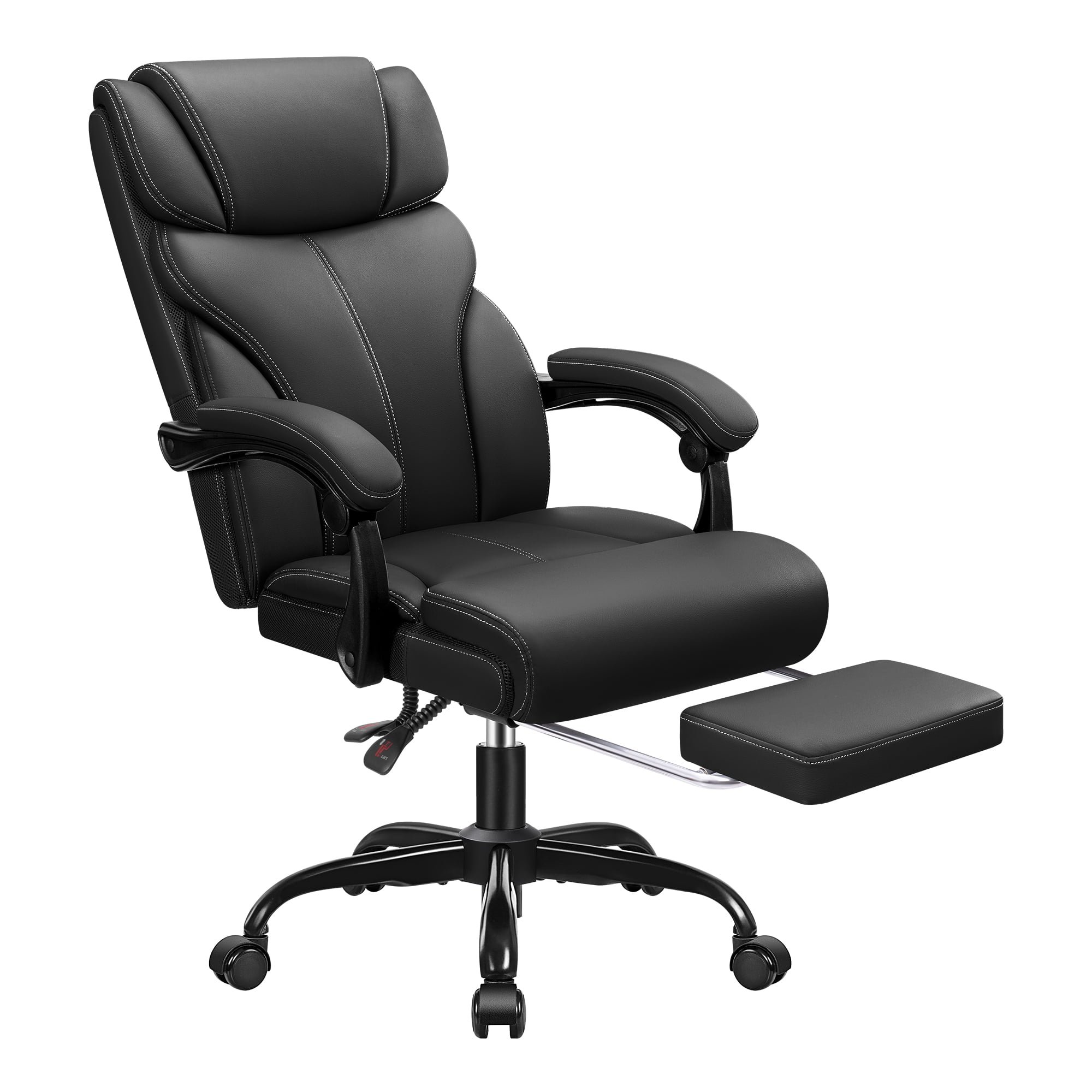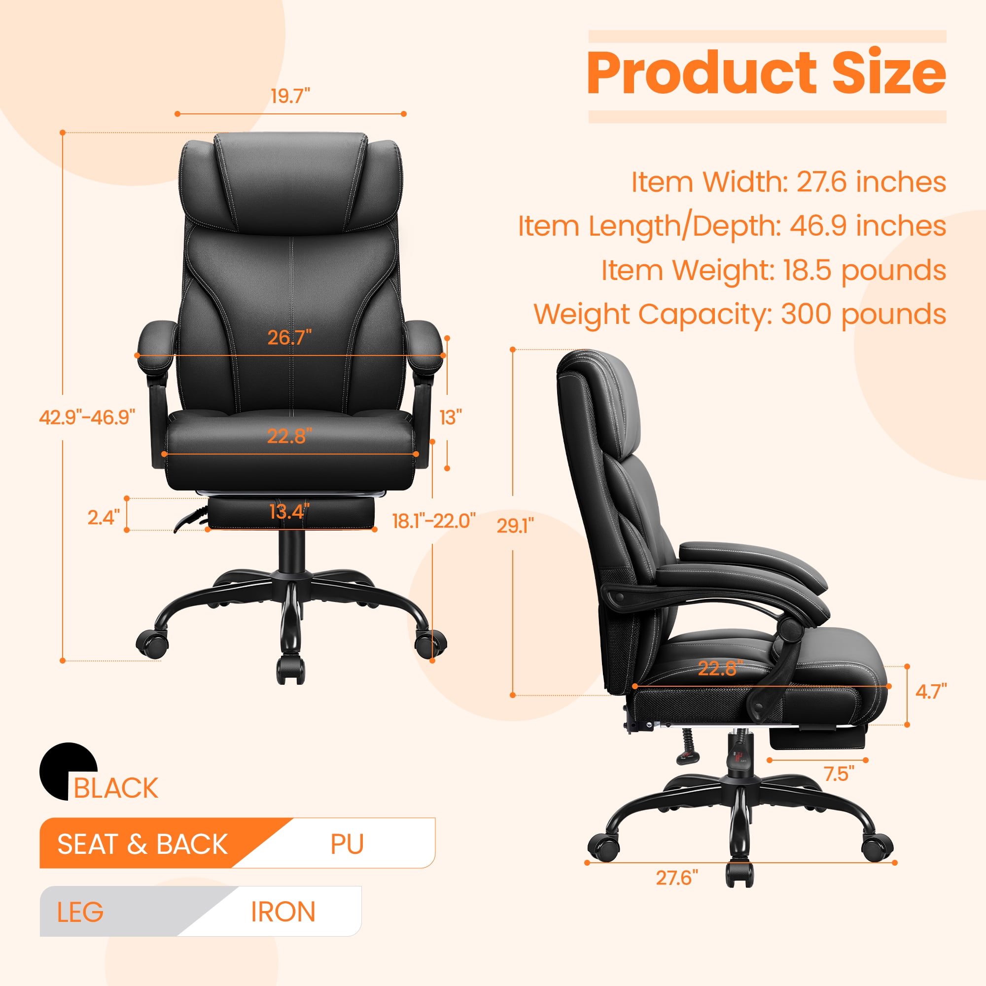 Ergonomic office chair: Coolhut big and tall office chair is designed for sitting for long hours, whose lumbar support and headrest in line with the human waist, neck curve, helping you adjust the sitting posture, relieve the pain of the back and lumbar spine when working for a long time. The cushion adopts an upgraded sponge and 20 independent spring packs, to achieve a balance of support and soft comfort, sedentary not tired. Modern Appearance Design: Executive office chair allow you to enhance your visual enjoyment while comfortable. Wrapped in high-quality PU leather, both soft, skin-friendly and resistant to scratches, stains, peeling, cracking, long time use does not fade and easy to clean, suitable for home, office, conference room, reception room and varieties of colors can be selected according to your needs. Reclining and Adjustable: Make your own chair, the seat height of the high back office chair can be adjusted up and down in the range of 4 inches, the chair backrest can recline between 90° and 135° to meet your different needs for work, relax and rest. Home office desk chairs have a retractable footrest that can be pulled out when your legs feel uncomfortable or you want to take a nap for rest. Easy Installation and Sturdy: The package includes detailed installation instructions and tools so that you can assemble the chair yourself. We have also uploaded the installation video on the product page for your reference. Once installation complete, you will find the leather office chair is sturdy enough, equipped with five stable and durable castors that rotate 360° and slide smoothly and silently across different floors. Worry-free Aftersales Service: If you need help assembling or using our products, please feel free to contact our Customer Service Team by email. We will spare no effort to assist you with any problems. The warranty period is 1 year, we assure to provide you with the highest level of after-sales service.