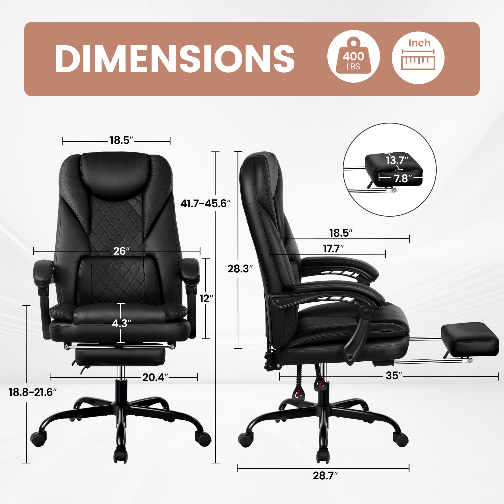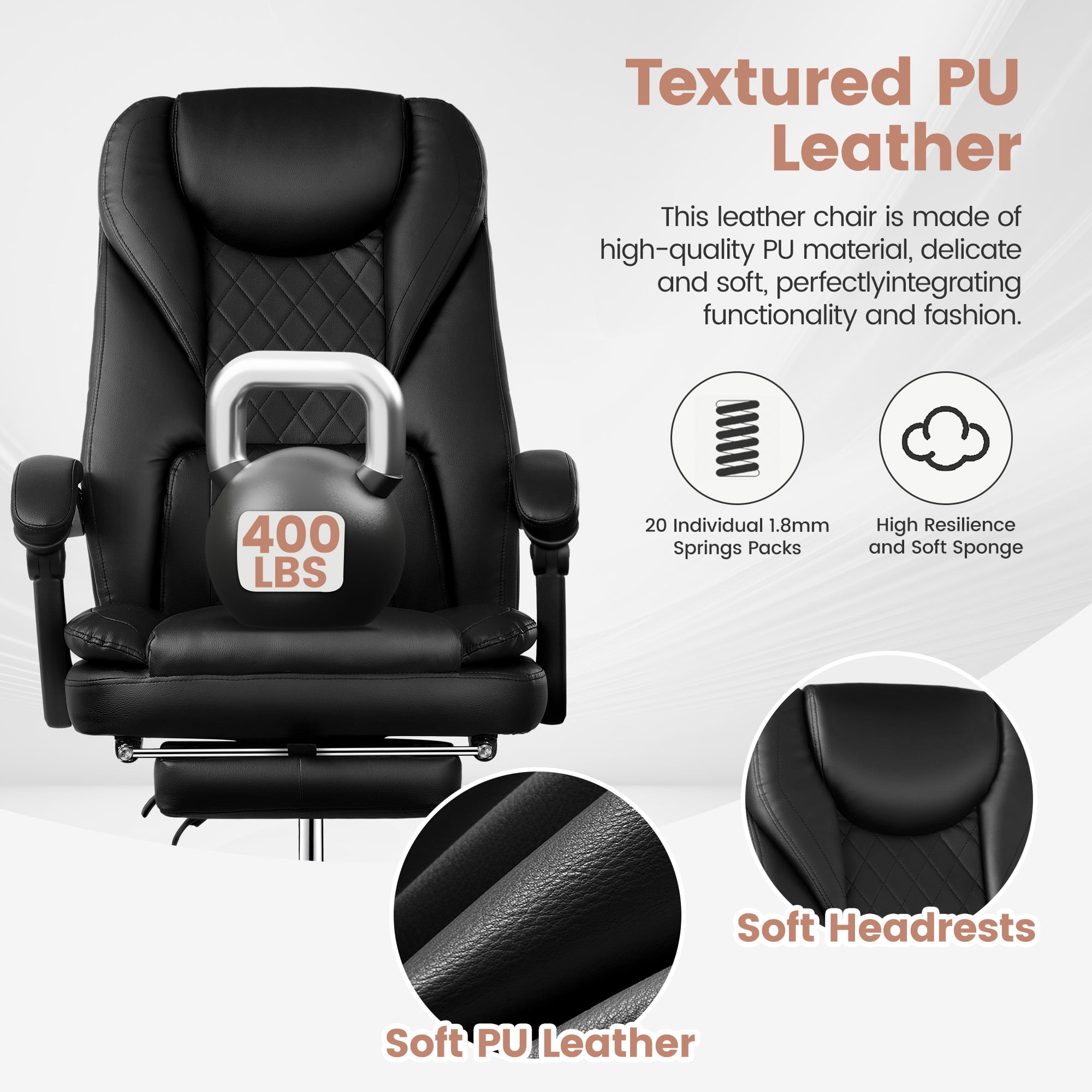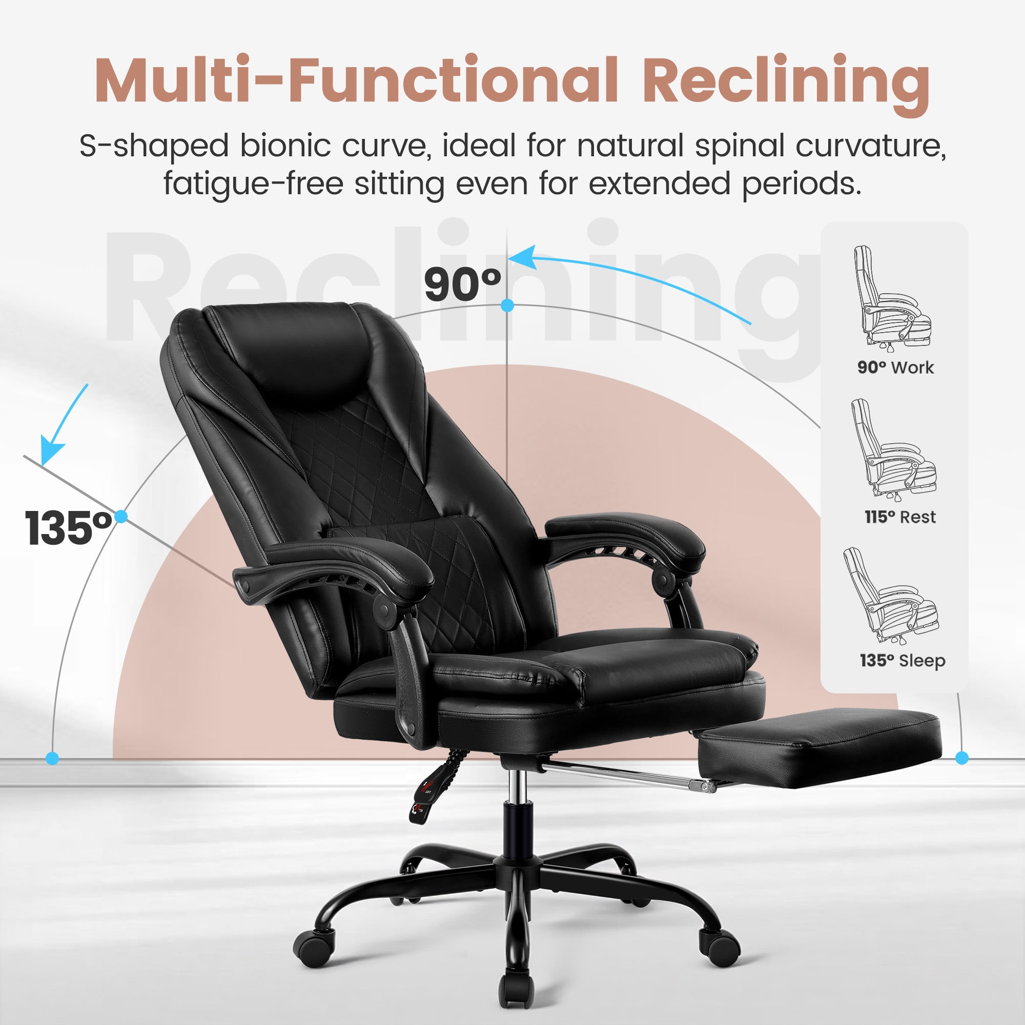 The Leather Office Chair offers a plush experience with its soft PU leather and double foam seat cushion, accommodating your entire body. Whether you’re working, meeting, or relaxing, the chair’s better resilience ensures long-lasting comfort even during extended periods of sitting. Designed for personalized comfort, the executive chair features adjustable and reclining capabilities. You can effortlessly modify the back angle between 90° to 135°, meeting your specific needs for work and relaxation. Additionally, the seat height can be easily adjusted for optimal comfort. To enhance relaxation further, the chair includes a retractable footrest, allowing you to rest your legs and indulge in a quick nap. Prioritizing your well-being, this ergonomic office chair boasts a comfortable high-back design and soft cushions, providing extra lumbar support. This thoughtful design helps alleviate spine, back, and lumbar pain caused by long working hours. With its heavy-duty nylon wheelbase and impressive weight capacity of up to 300lb, the chair is built to cater to a wide range of users. Enjoy smooth and reliable mobility across different floors, thanks to the chair’s stable and durable 360° rotating pulleys. Customer satisfaction with modern office chairs is our top priority! Rest assured, our office chairs come with all the necessary hardware and tools for easy installation, and the executive chair can be easily installed and completed in approximately 15-30 minutes. COOLHUT promise that your office chair will enjoy 5 years of free customer support and responsive support for any issues. We are committed to ensuring a better experience for you!