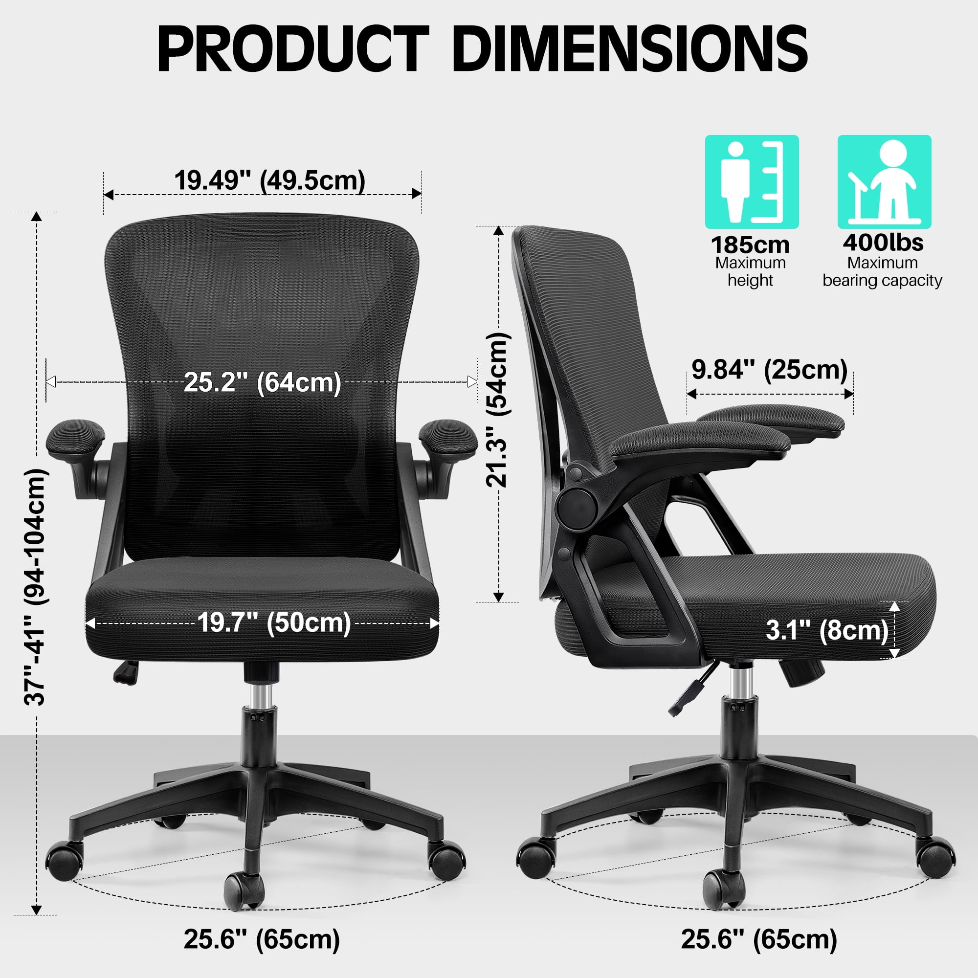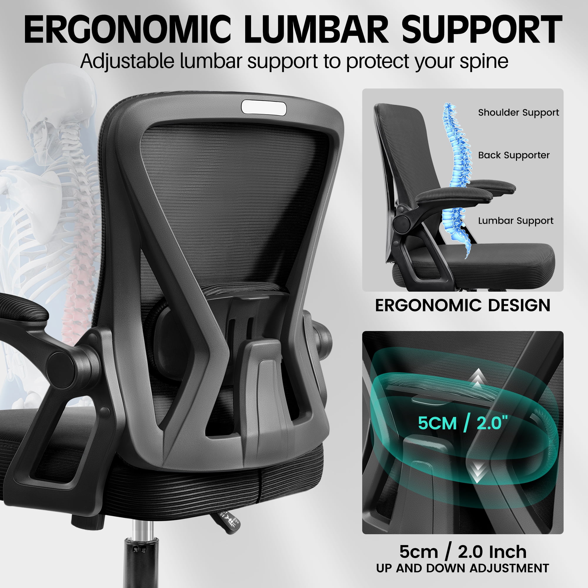 COOLHUT Office Desk Chair, 400LBS Ergonomic Mesh Rolling Work Swivel Task Chairs with Wheels, Comfortable Lumbar Support, Comfy Flip-up Arms for Home, Bedroom, Study, Student, 8-Years Warranty, Black