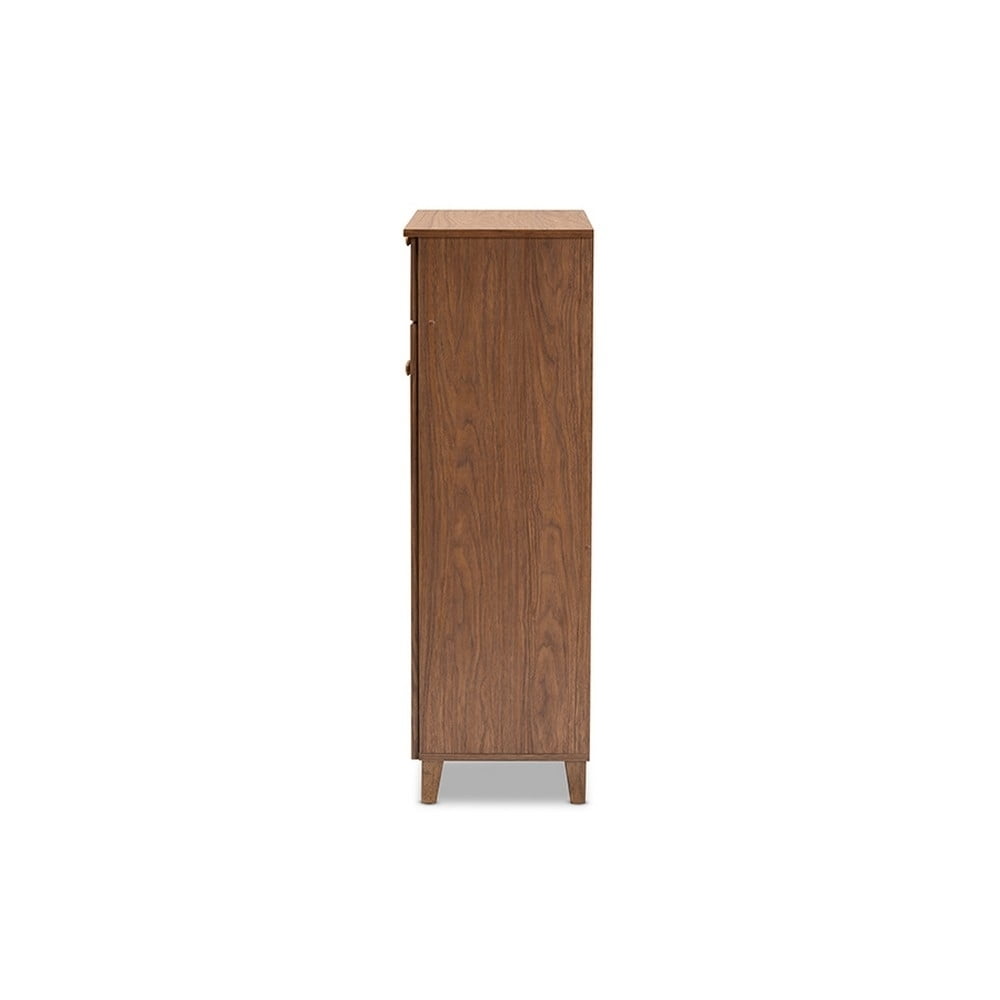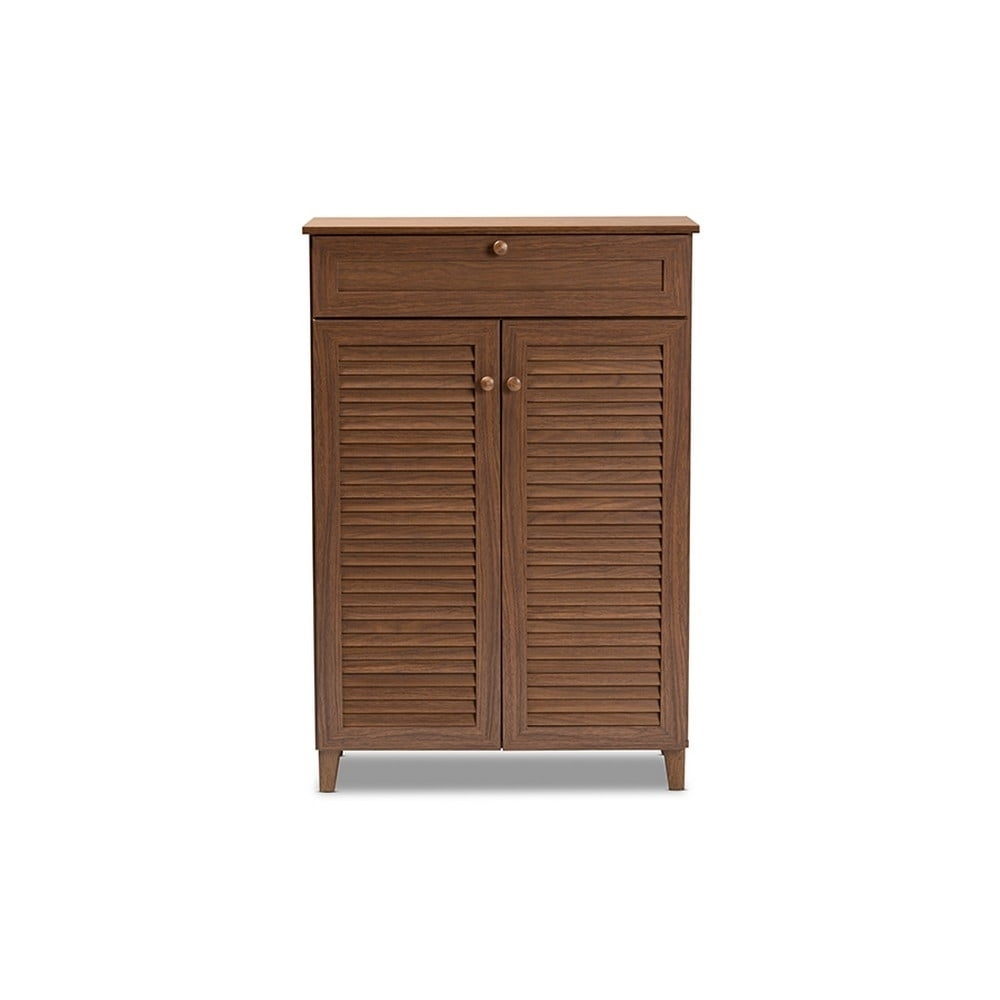 Coolidge Modern and Contemporary Walnut Finished 5-Shelf Wood Shoe Storage Cabinet with Drawer Store your shoes on the sly with the Coolidge shoe cabinet. Two slatted doors, fitted with round knobs, conceal five shelves with storage space for up to 15 pairs of shoes. One spacious drawer, accented with inset paneling, provides additional storage space for extra shoelaces and miscellaneous items. Tapered legs add refined style and provide elevation to deter dust buildup. Constructed from engineered wood, the Coolidge showcases a classic walnut brown finish that complements any color scheme. The Coolidge shoe cabinet is made in Malaysia and requires assembly. Specifications: Constructed from engineered wood with polyurethane veneer Walnut brown finish Five (5) shelves provide storage space for 15 pairs of shoes One (1) drawer Solid wood door knobs Tapered legs Assembly required