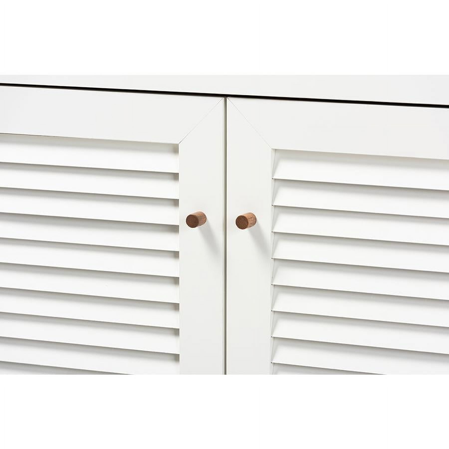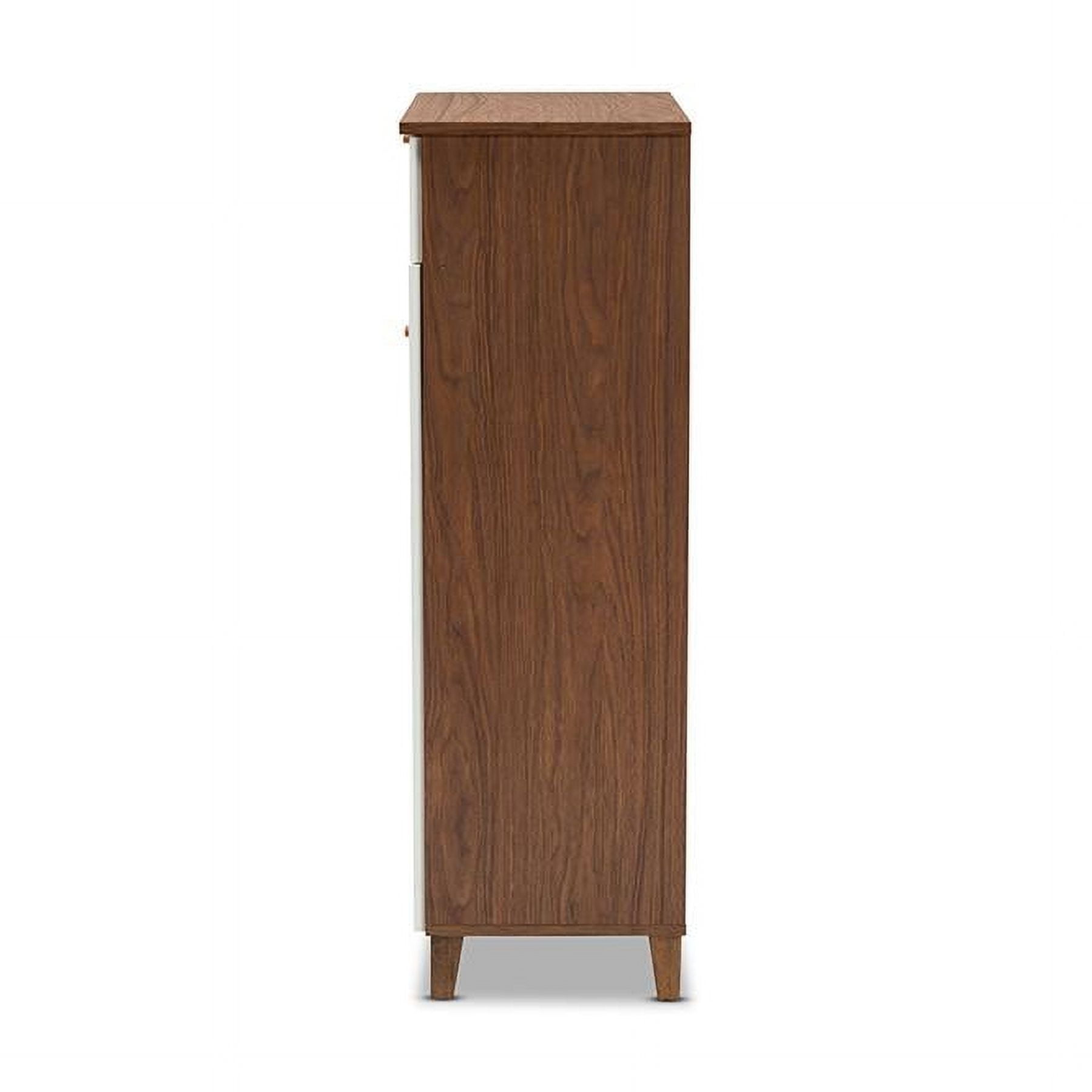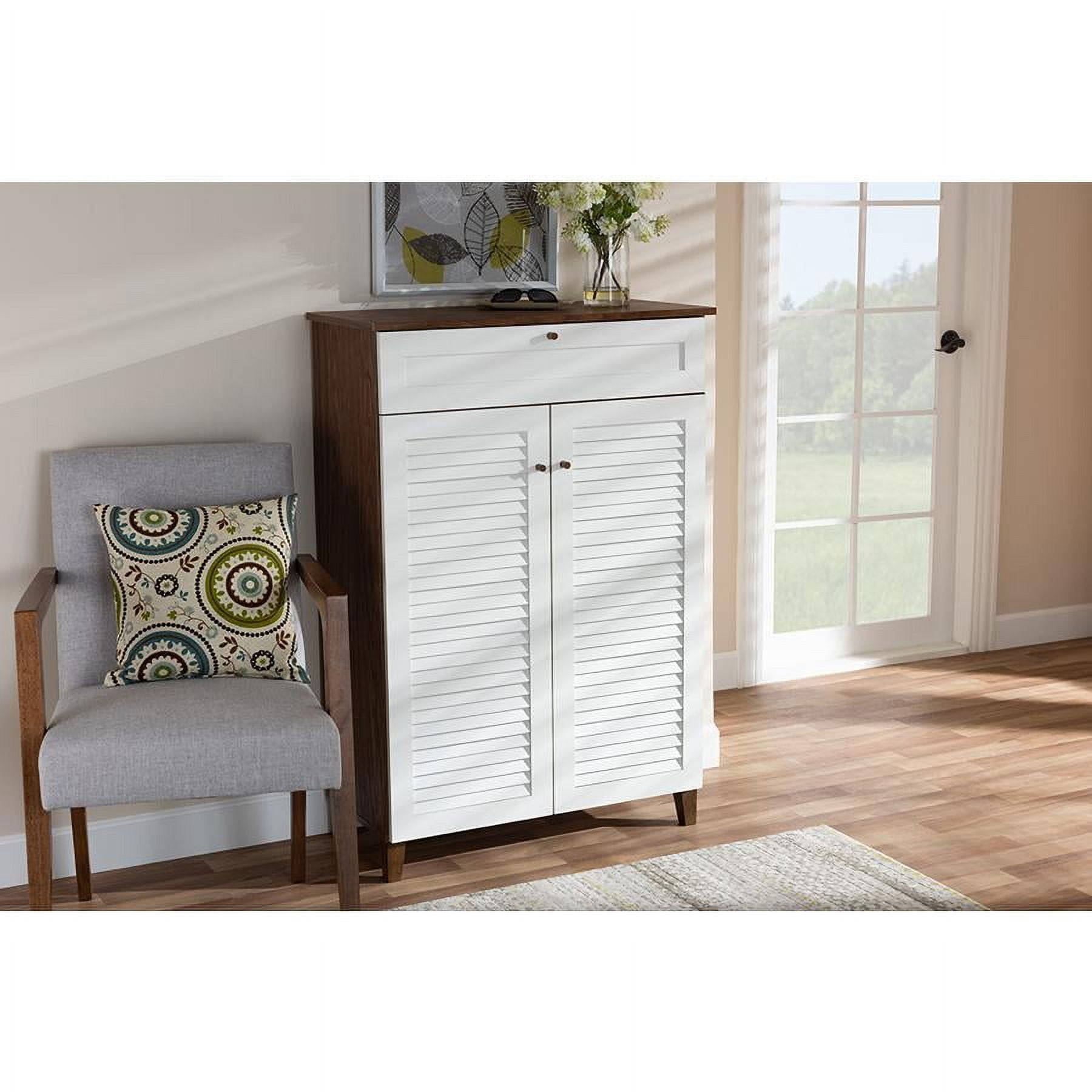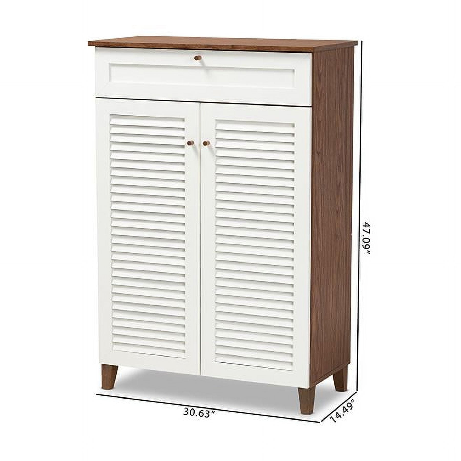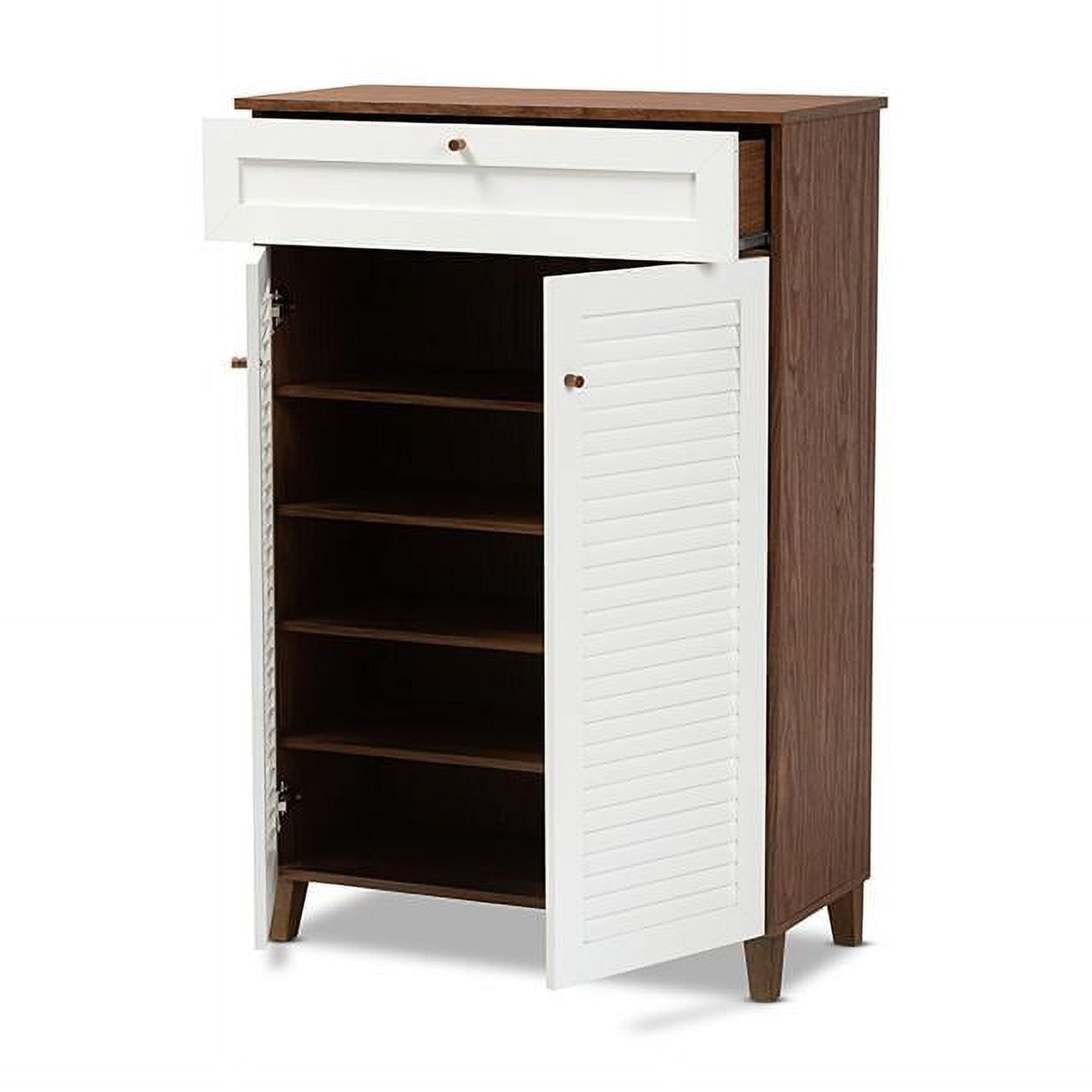 Coolidge Modern White and Walnut Finished 5-Shelf Wood Shoe Storage Cabinet with Drawer Store your shoes on the sly with the Coolidge shoe cabinet. Two slatted doors, fitted with round knobs, conceal five shelves with storage space for up to 15 pairs of shoes. One spacious drawer, accented with inset paneling, provides additional storage space for extra shoelaces and miscellaneous items. Tapered legs add refined style and provide elevation to deter dust buildup. Constructed from engineered wood, the Coolidge showcases a cool two-tone white and walnut brown finish that complements any color scheme. The Coolidge shoe cabinet is made in Malaysia and requires assembly. Specifications: Constructed from solid wood and engineered wood Two-tone white and walnut brown finish Five (5) shelves provide storage space for 15 pairs of shoes One (1) drawer Solid wood door knobs