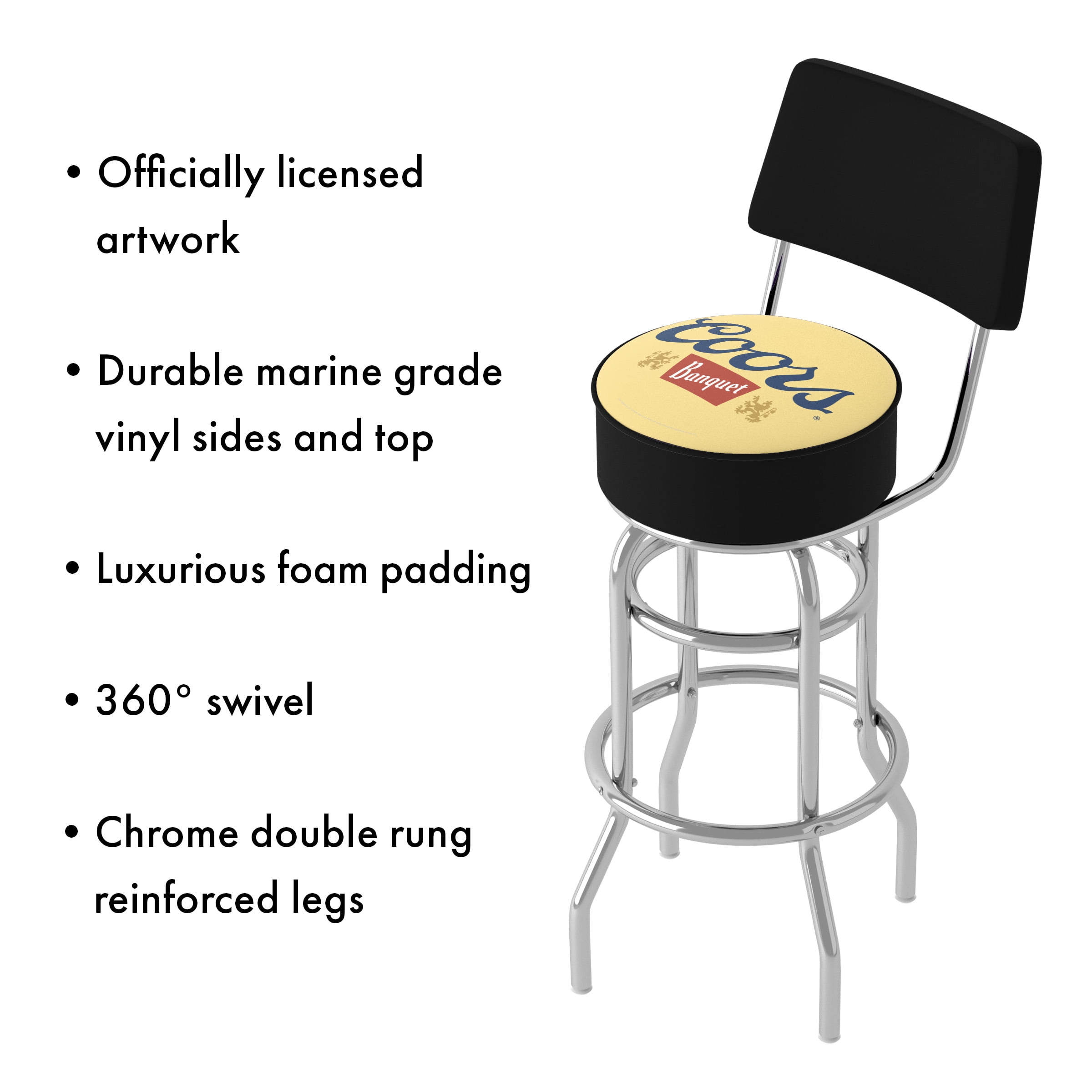 The officially licensed Coors Banquet Bar Stools by Trademark Gameroom will provide you and your guests with a comfortable seat as well as a stylish accent to your game room, garage, or collection. The bar chair seat features an authentic logo highlighted by durable marine grade vinyl sides, and the top is trimmed with quarter inch vinyl beading for added durability. The stool chair comes equipped with a luxurious foam padded seat and back rest, a 360-degree swivel, and chrome double rung reinforced legs made of tubular steel that is both lightweight and supportive. Bring style, function, and comfort to your basement, bar, or workshop with the sporty counter stools.