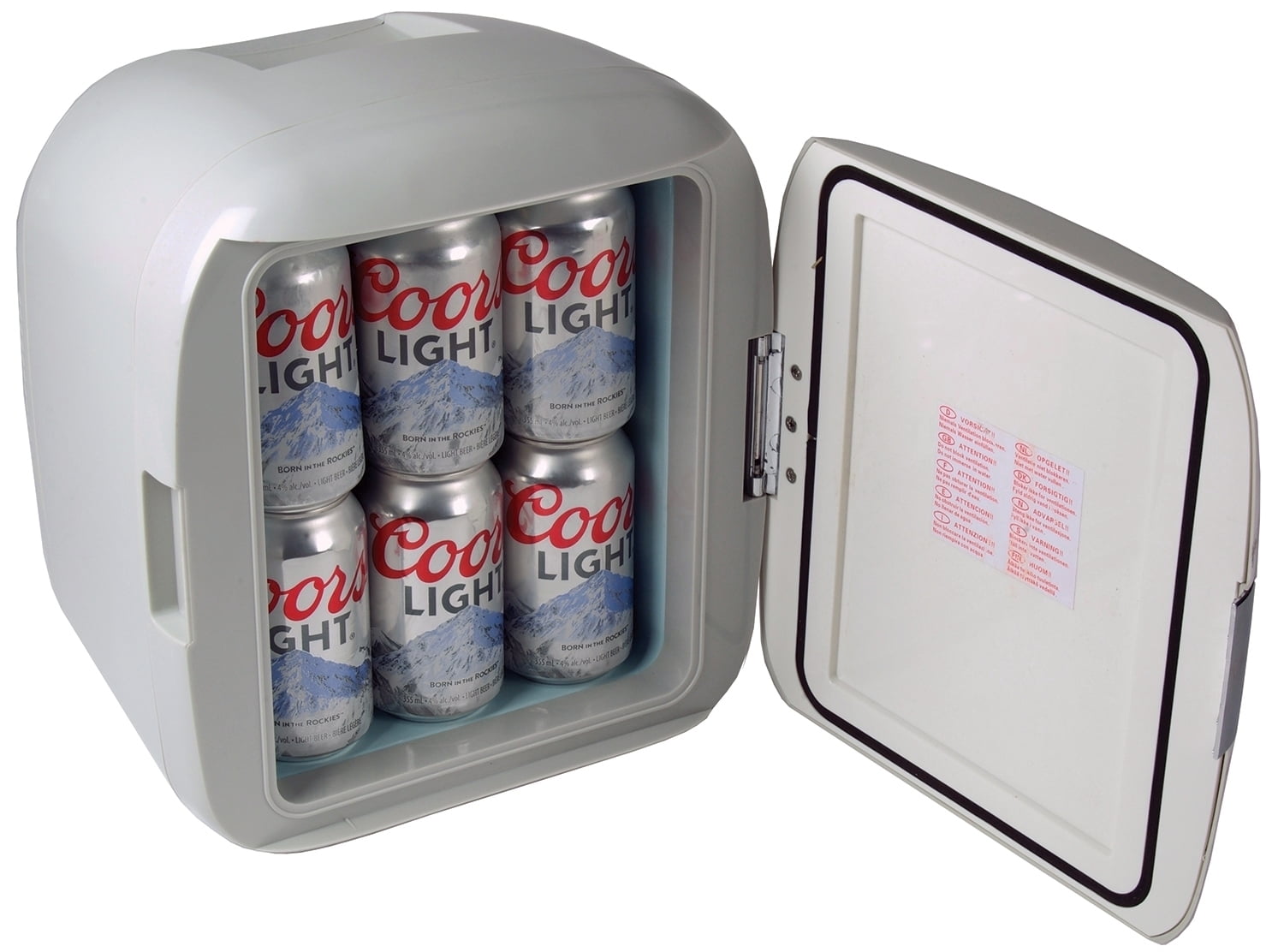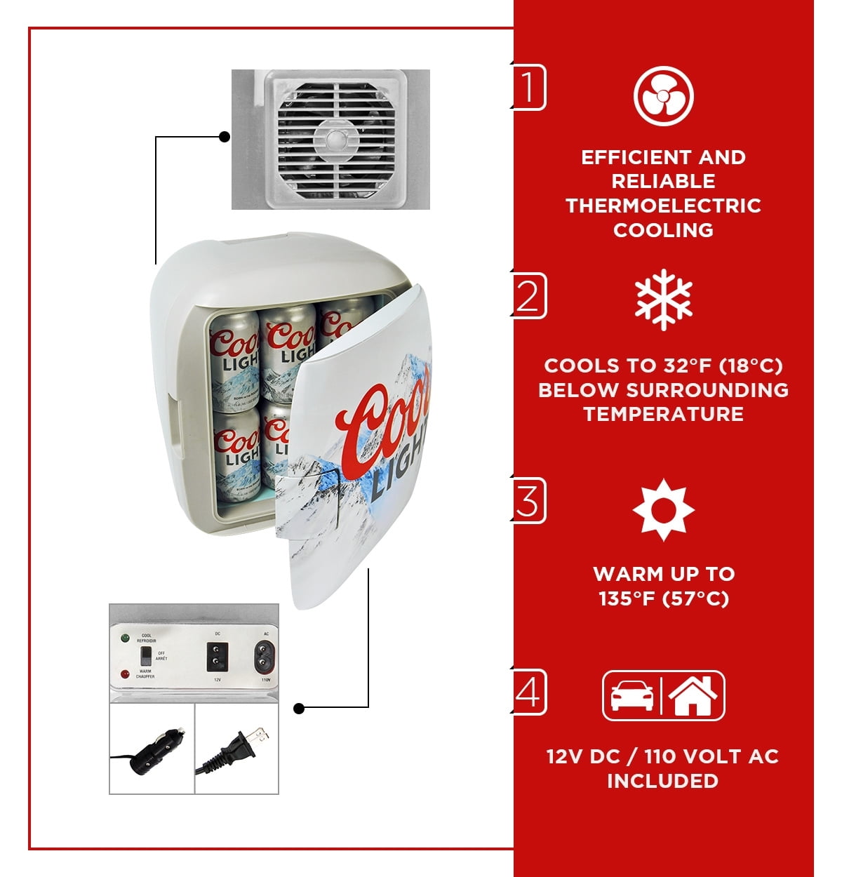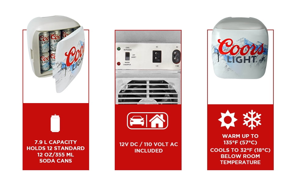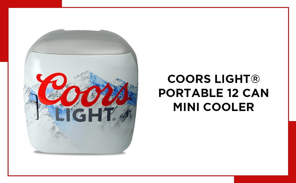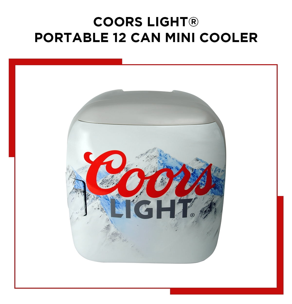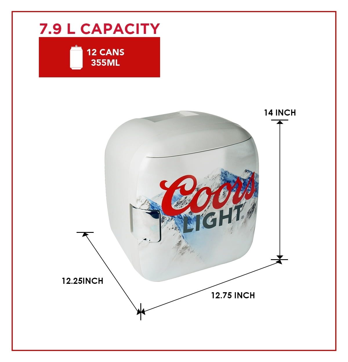 ” Product Features EYE-CATCHING DESIGN Unique can-shaped personal mini fridge features official Coors Light® graphics, fan-favourite Rocky Mountain design, low profile self-locking door, and pull-tab carry handle ECO-FRIENDLY COOLING CFC-free thermoelectric semiconductor module keeps contents cool to 36°F (20°C) below room temperature PERFECT FOR BEER-LOVERS 5.4 L/ 5.7 Quart capacity with removable shelf holds eight standard 12 oz/355 mL beer cans or 4 bottles and fits easily on desk or shelf LIGHTWEIGHT AND PORTABLE 12V DC/110V AC capable for den, backyard, dorm, cottage, or cabin or on the go in your truck, boat, trailer, or RV SAFE STORAGE Conveniently and safely store beverages, yogurt, fruit, juice, cheese, or medication at home, work or travel “