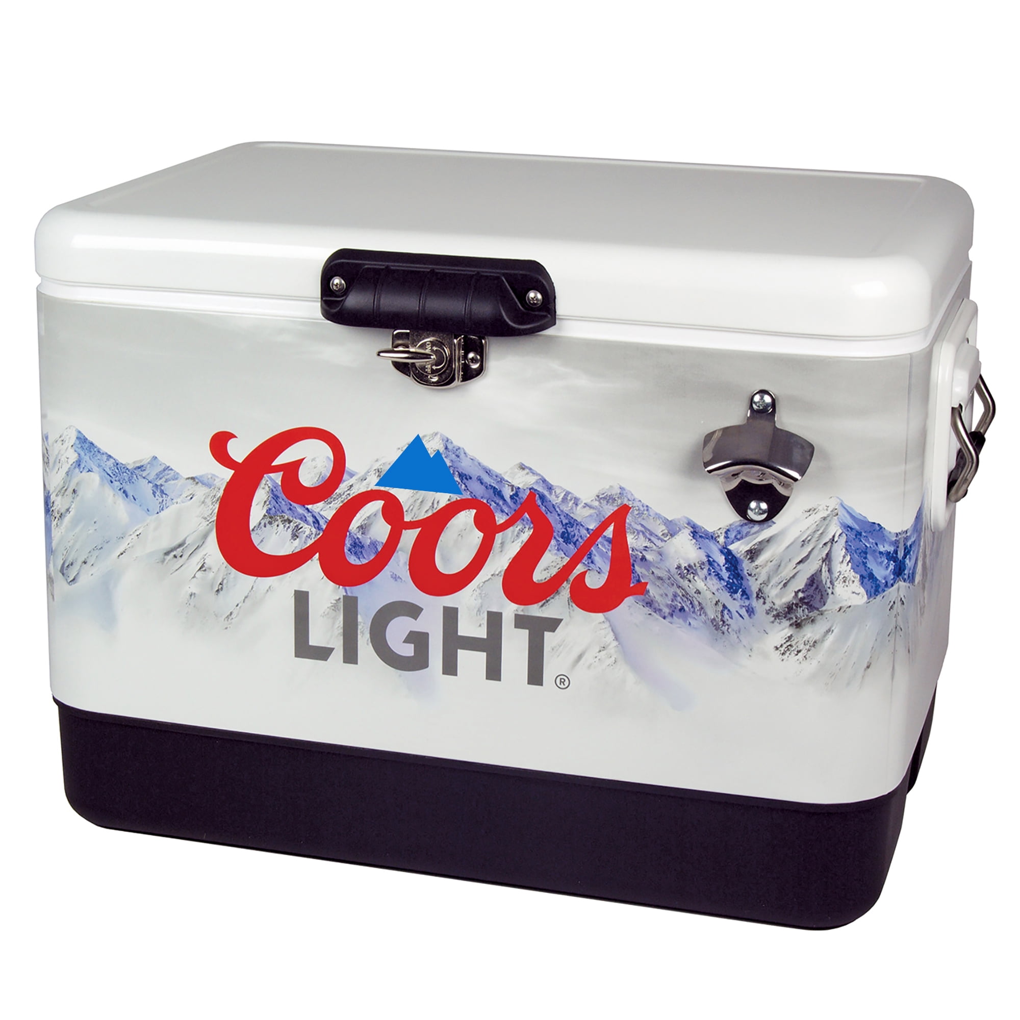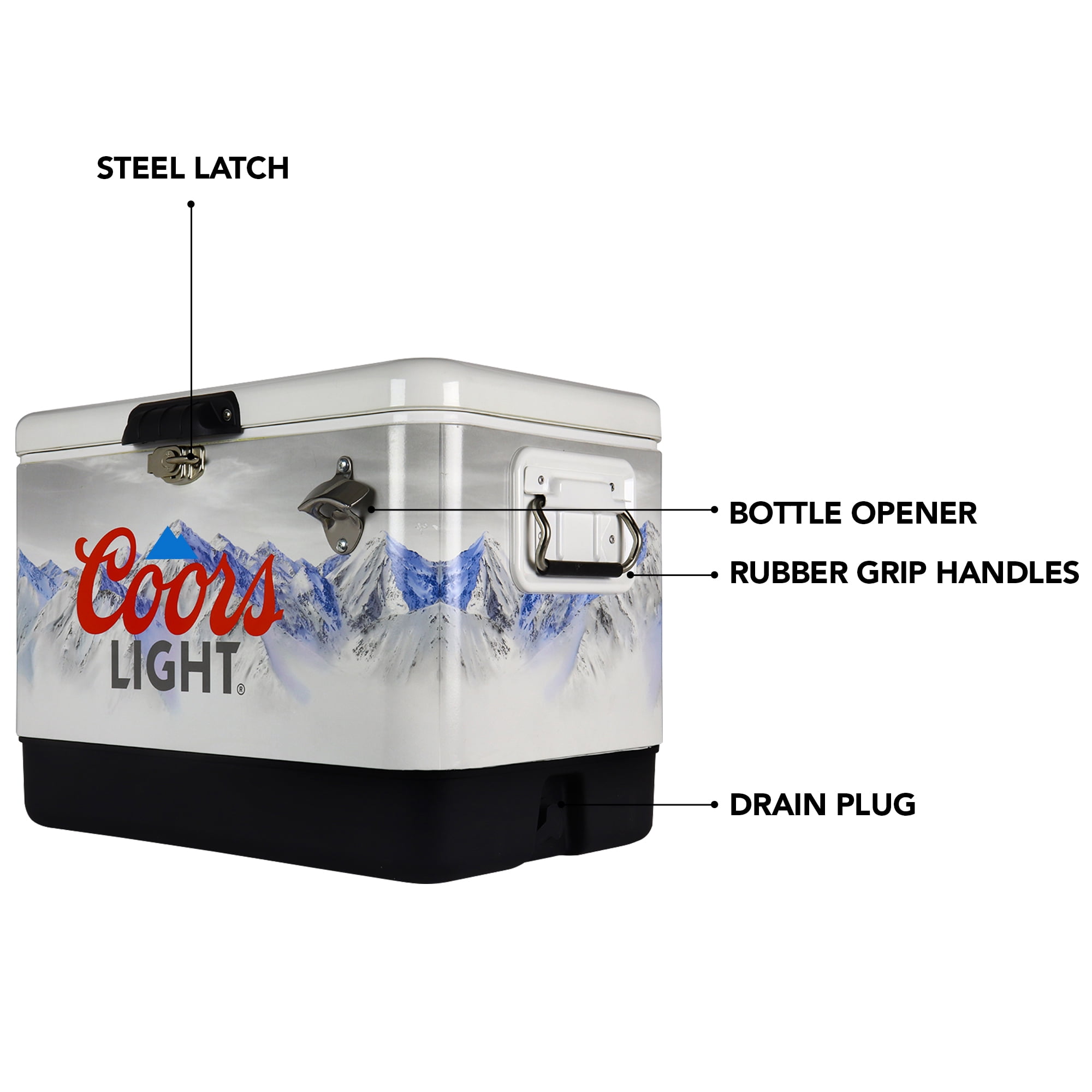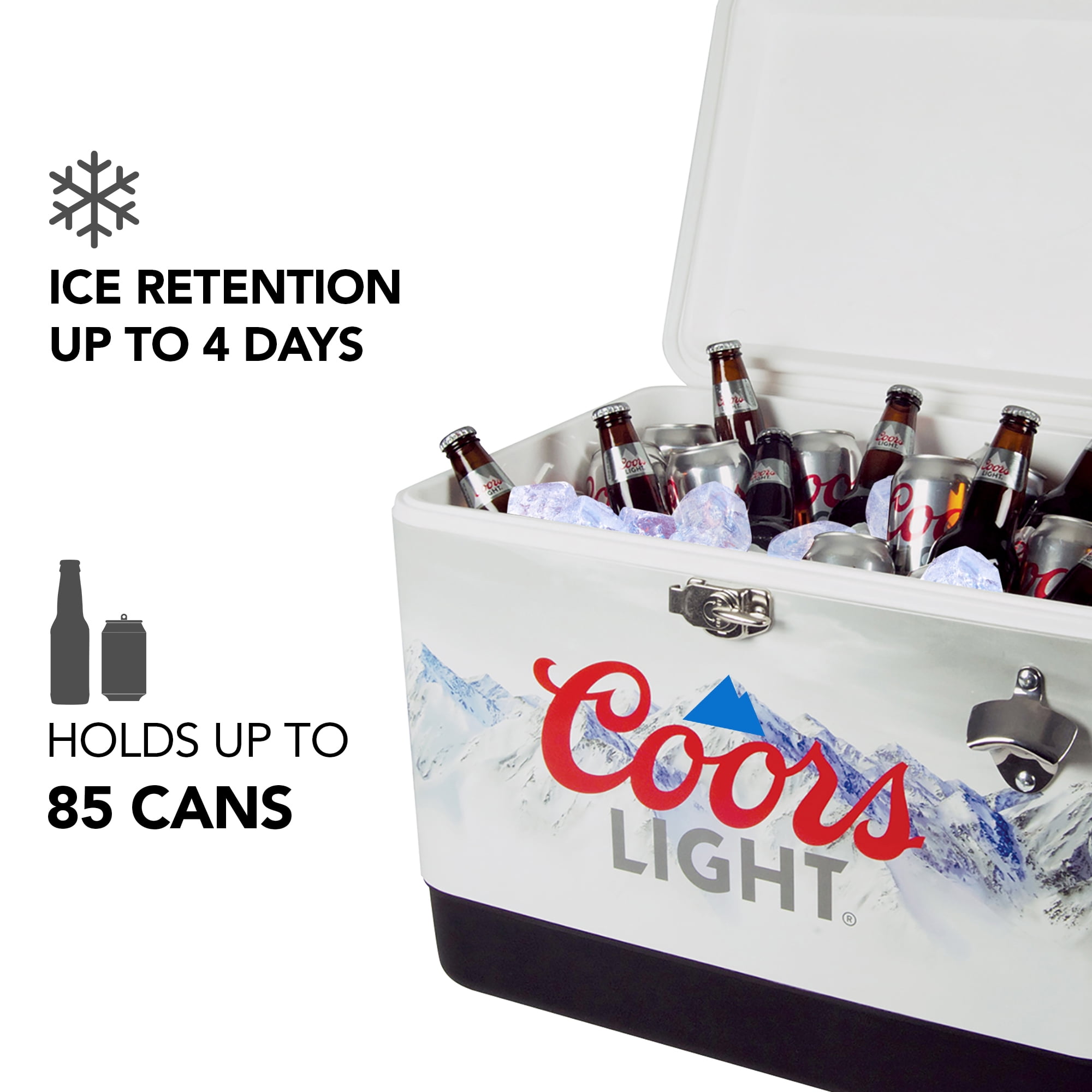 Tips for Best Use: For maximum efficiency, fill with pre-chilled items and ice or ice packs and store out of direct sunlight Minimize opening and closing and ensure the lid is locked on for the most effective temperature control Maximum cold retention depends on the surrounding temperature Huge Capacity: 51 L/54 quart cooler holds up to 85 standard 355 ml/12 oz cans for easy access at tailgate parties, barbecues, camping, or fishing Perfect Gift: Unique steel-belted cooler with Coors Light logo, wrap around classic rocky mountain graphics, and rugged accents is the ideal gift for collectors and outdoor adventurers Built-in Bottle Opener: No more searching for a bottle opener when you want to enjoy a cold drink Easy cleaning features a wipe clean plastic base and liner, plus leak-resistant channel drain for no-tilt draining Durable Construction: High-quality materials including a solid steel latch, rubber grip handles, and rustproof exterior means this insulated ice chest is in it for the long haul.