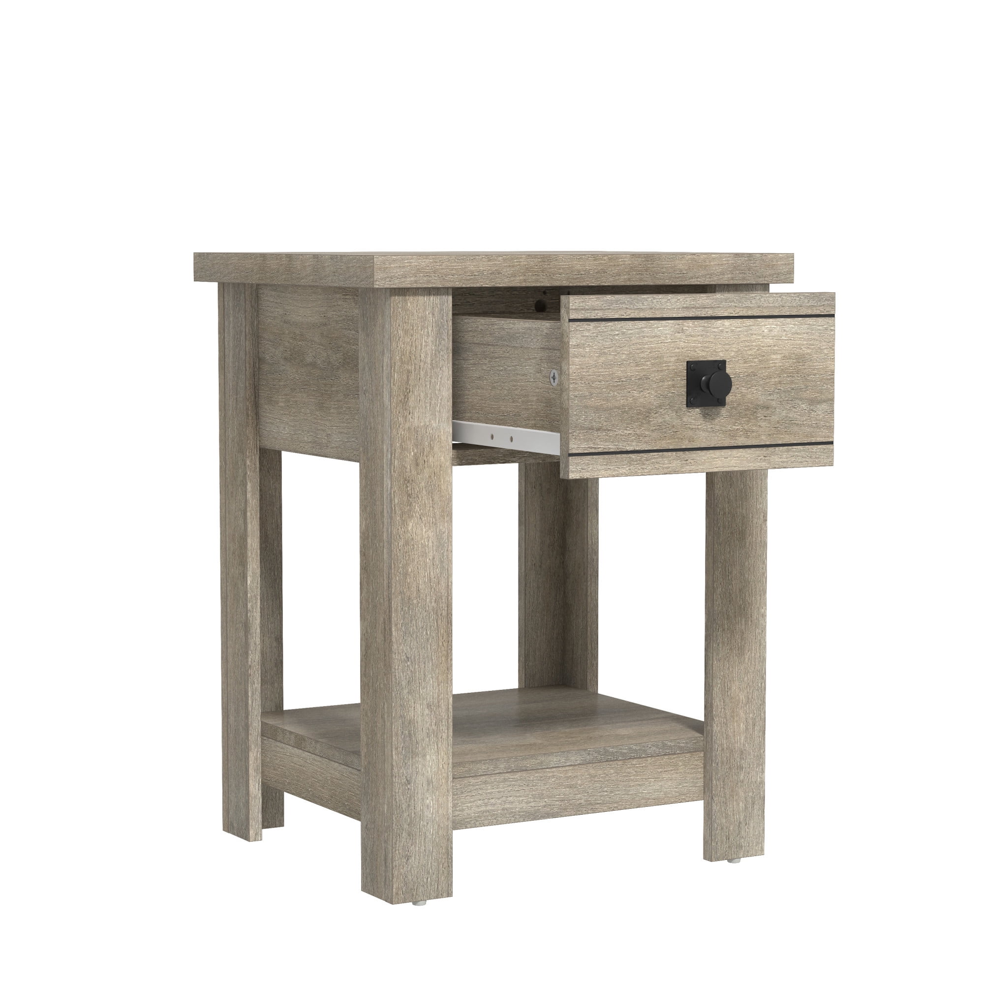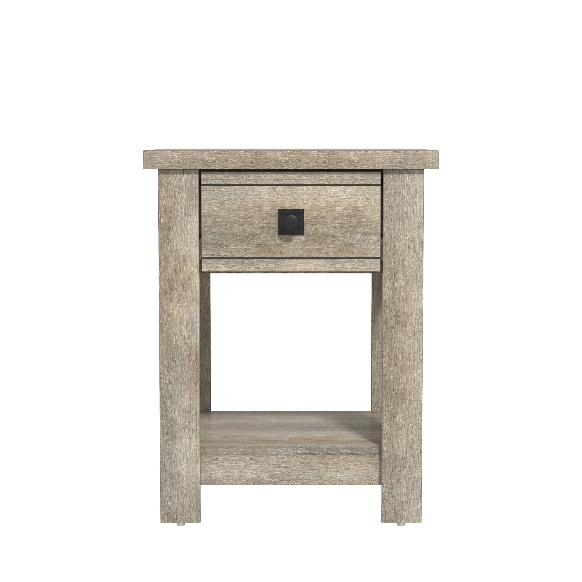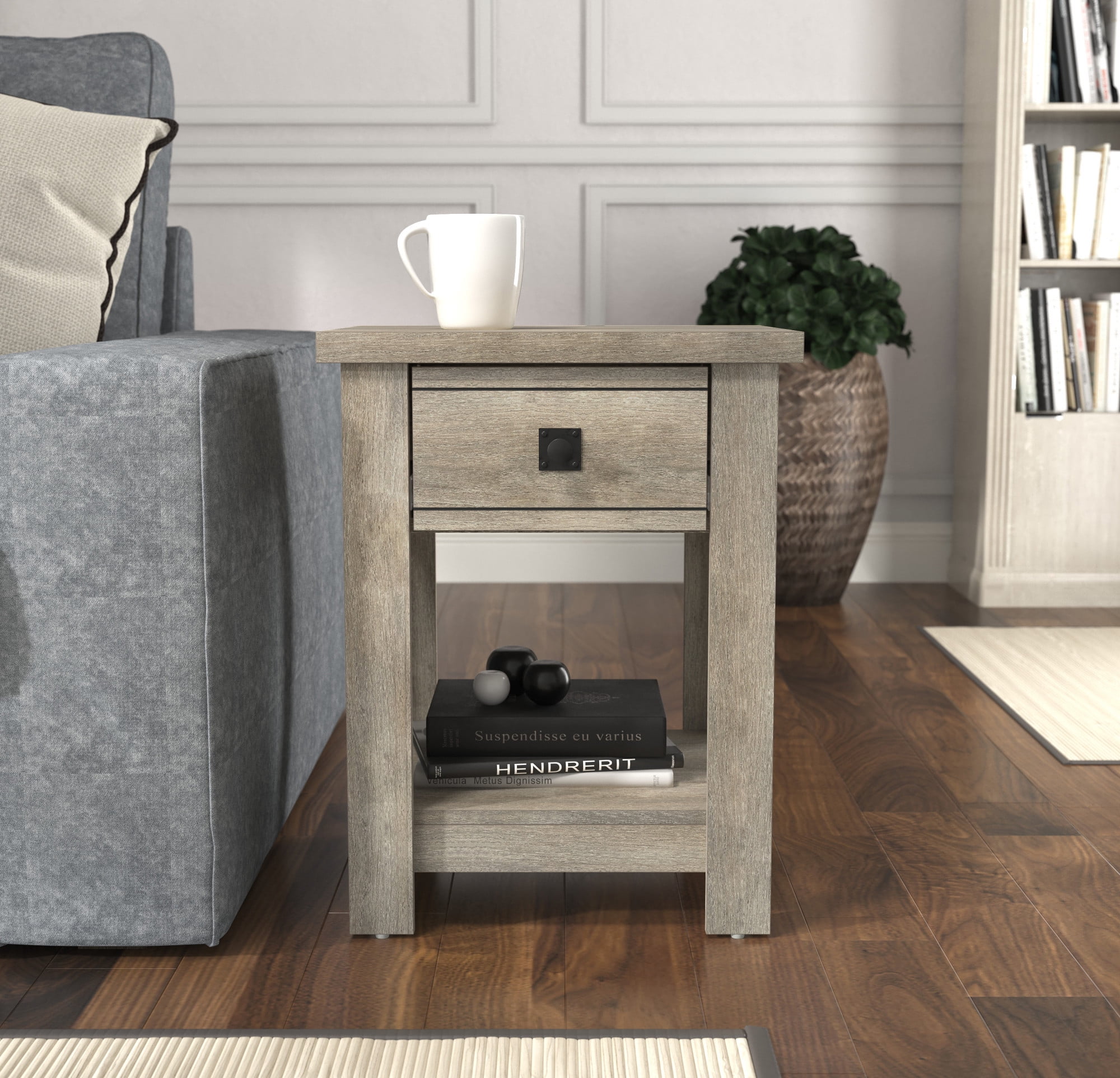 Transitional single drawer end table in a rustic gray finish Features a single pull-out drawer and open bottom shelf for easy accessibility and storage Constructed of high-grade MDF for long-lasting durability Overall Dimensions: 24H x 18.5W x 15.75D Versatile table can be used as an accent table in the living room, bedroom or entryway Spot or wipe clean For residential use Item will ship in one box Assembly Required 90-Day Limited Warranty