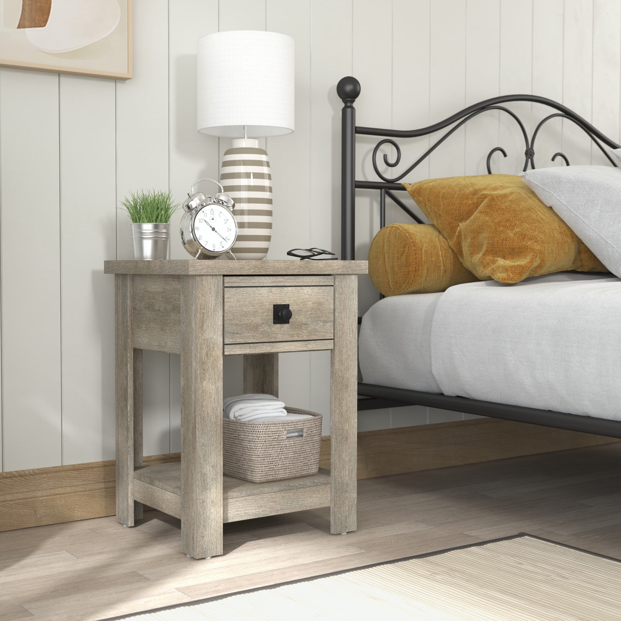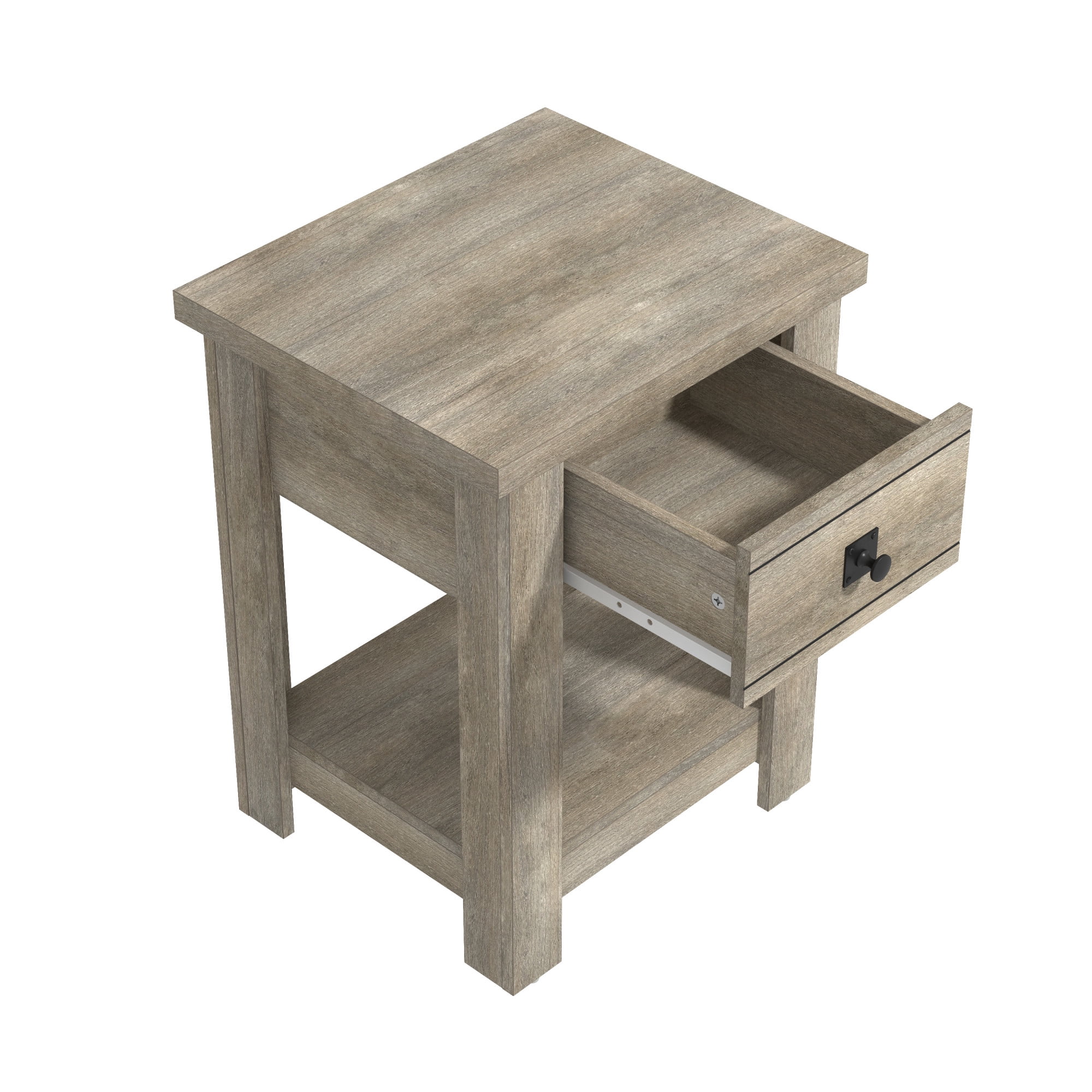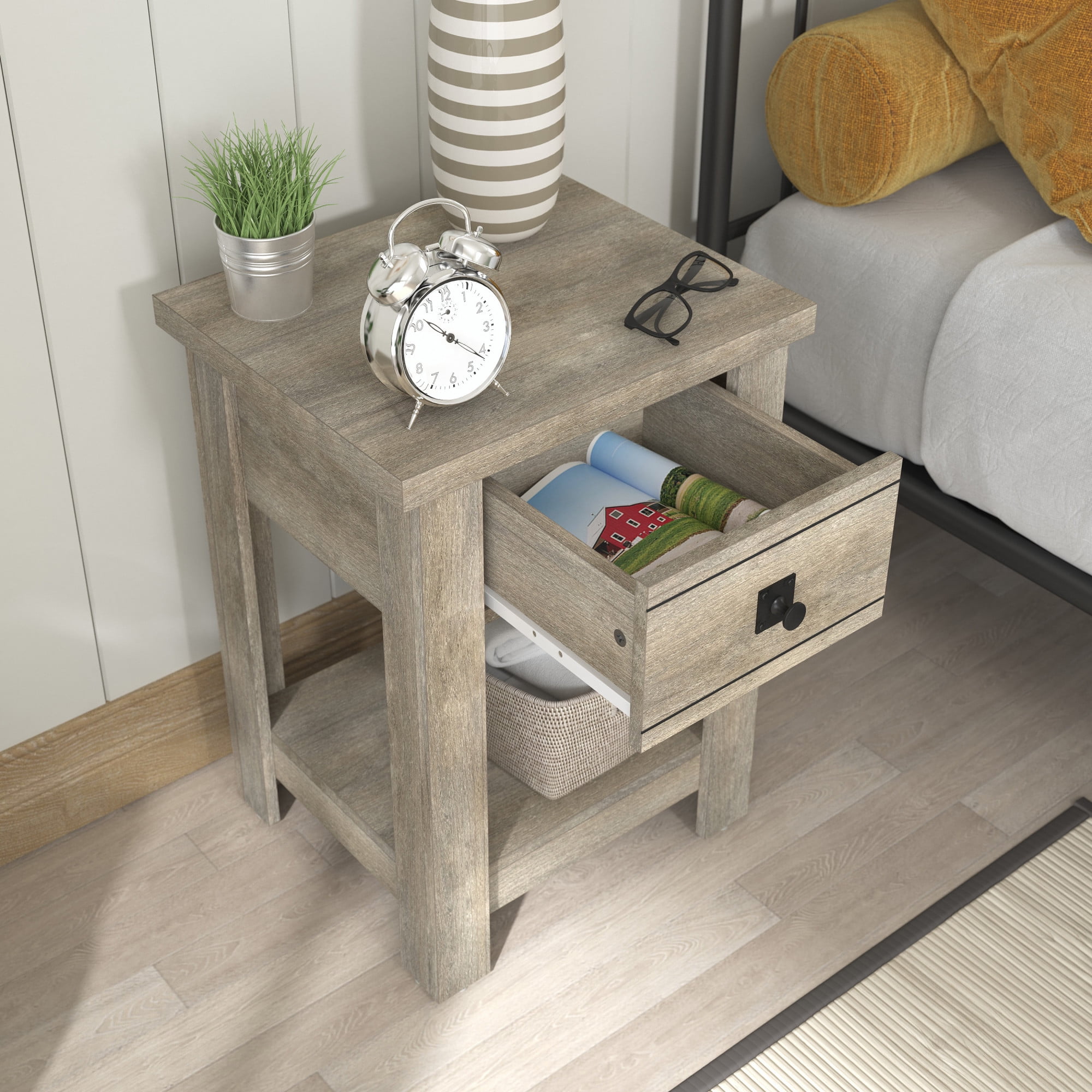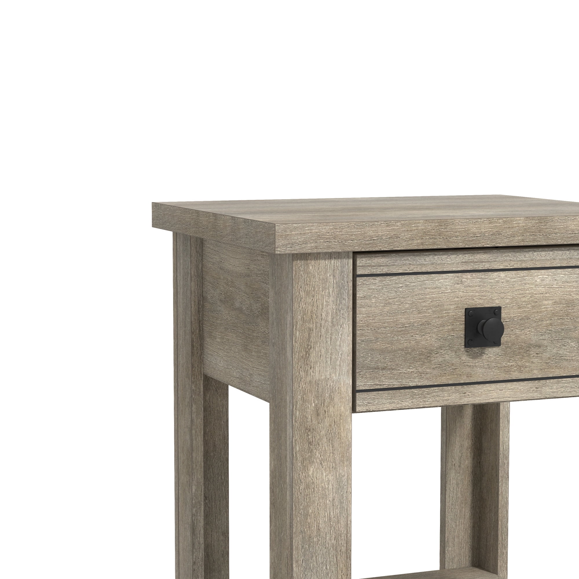Transitional single drawer end table in a rustic gray finish Features a single pull-out drawer and open bottom shelf for easy accessibility and storage Constructed of high-grade MDF for long-lasting durability Overall Dimensions: 24H x 18.5W x 15.75D Versatile table can be used as an accent table in the living room, bedroom or entryway Spot or wipe clean For residential use Item will ship in one box Assembly Required 90-Day Limited Warranty