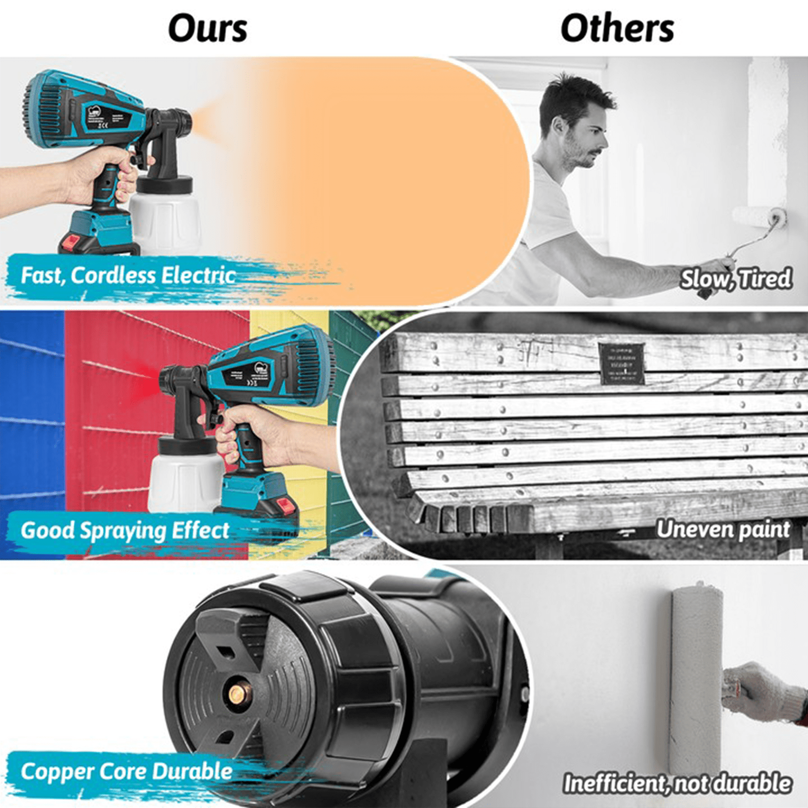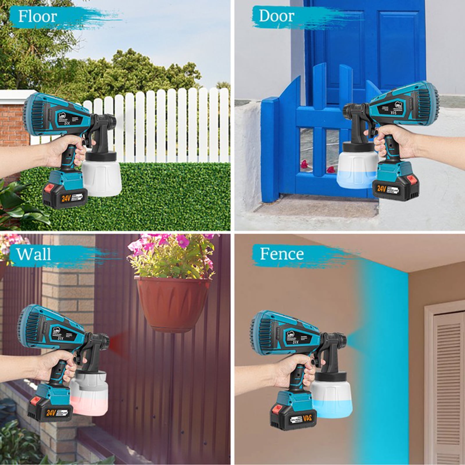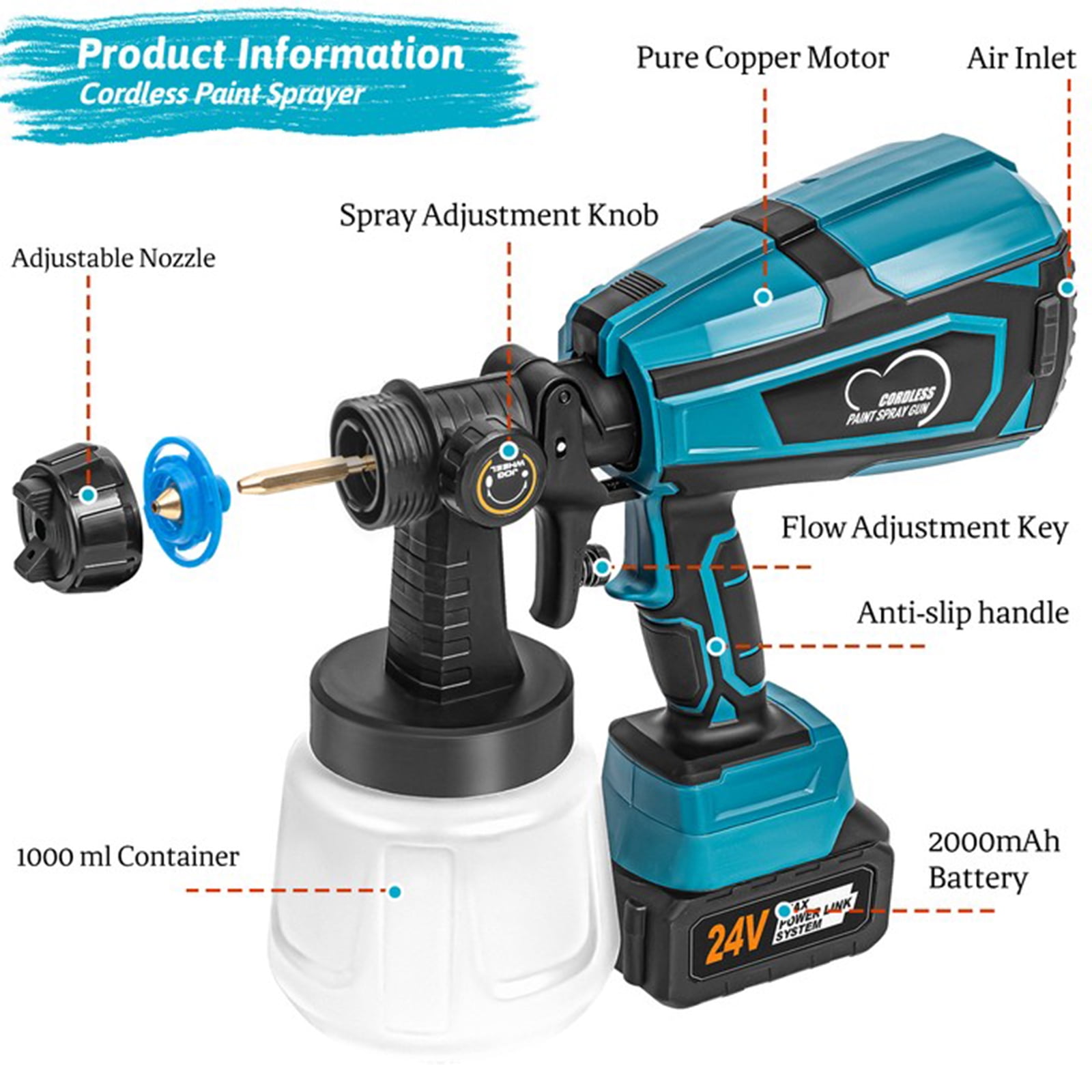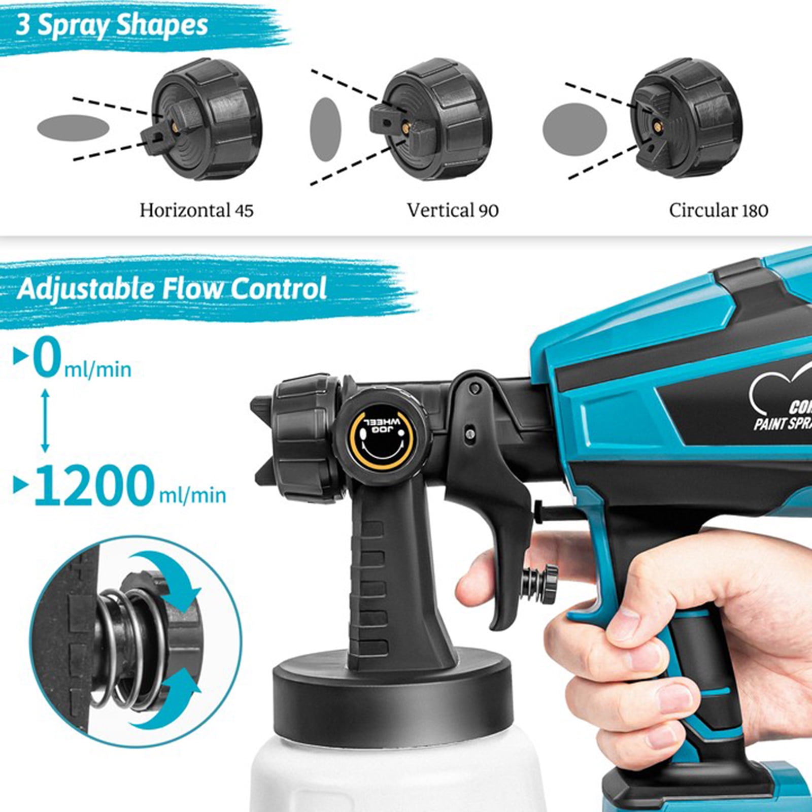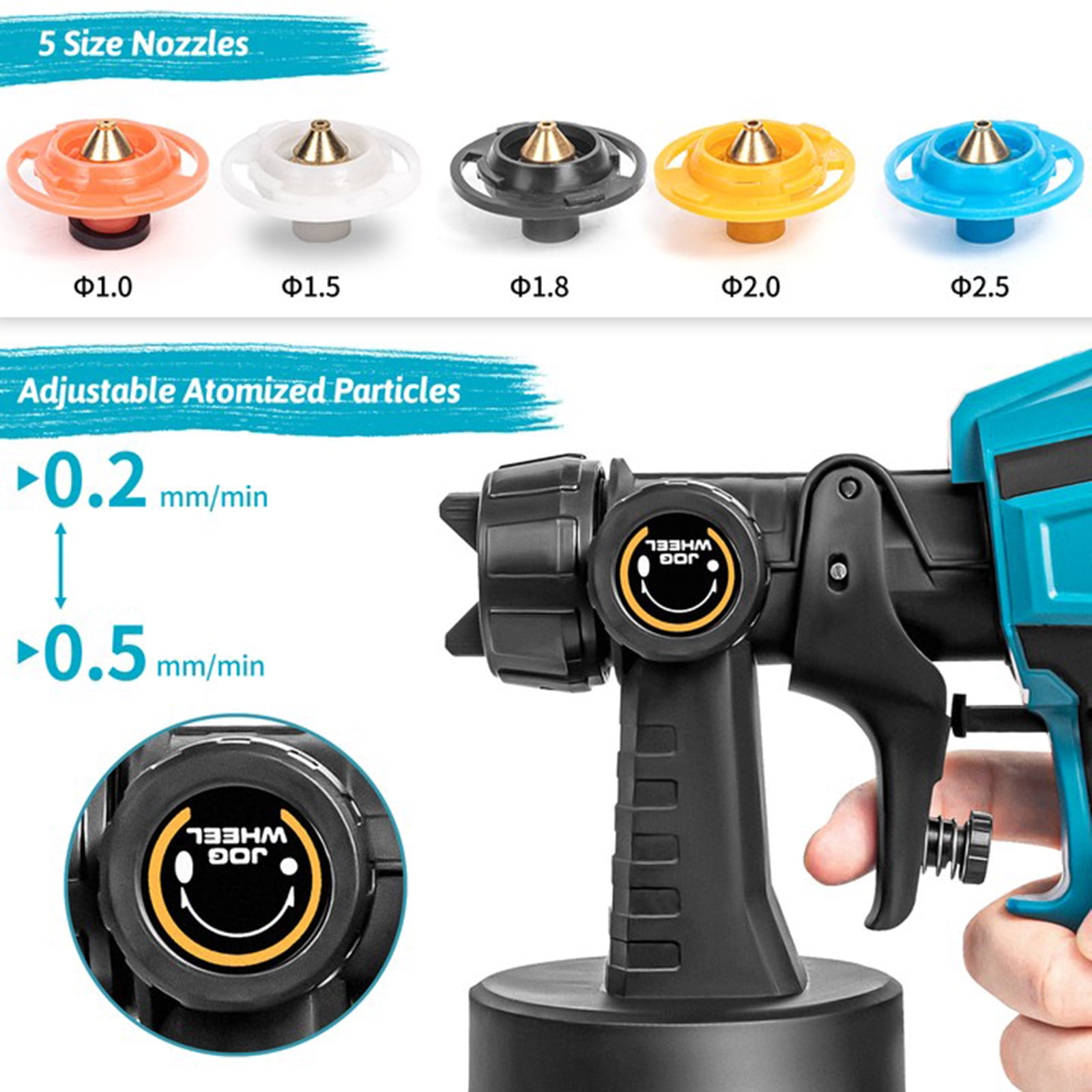 Super Power & High Capacity: The spray paint gun with 800W of power, providing a great finish on your project surface. With 1000ml high-capacity container, it will be your best electric paint sprayer for painting tables, chairs, fences, interior walls, and crafts. High Micro Atomization Design: This stain sprayer finely atomizes the paint, significantly reducing the waste caused by over-spraying and paint dripping. It can deliver a finer finish than a paint brush and roller. 3 Patterns & 5 Nozzles Design: The paint sprayer cordless can be adjusted to 3 different spray patterns: Horizontal, vertical and circular. Equipped with 5 nozzles of different sizes for any painting projects. Adjustable Flow Design: Regulate your paint output by adjusting the flow control Knob On the paint sprayer to get different paint output, suitable for edges, corners and broad Interior surfaces of various work and DIY projects. In addition to control spray, it has an easy grip handle that enables you to work longer to complete projects. Simple to Use & Easy to Clean: Our battery paint sprayer is easy to assemble without tools required. Plus, easily disassemble the spray parts and a 1000ml translucent container is easy to clean with the included needle and brush. Cordless portable design that allows you to use it anywhere. Spray modes to suit all the items you are spraying. (Nozzle Diameter:1.0mm, 1.5mm, 1.8mm, 2.0mm, 2.5mm) 0mm is suitable for atomizing spraying of diluents such as photocatalyst solutions. 1.5Mm and 1.8mm are suitable for spraying high atomization requirements such as paints, topcoats, refinish paints, etc. 0mm and 2.5mm for primer, latex paint and other paint spraying. Adjustable material flow control to increase or decrease material yield. High-micro atomization design allows paint to be applied evenly without leaving streaks. The detachable design provides quick and easy cleaning after spraying. 800W high-power motor and higher spray efficiency make your work easier. Type: Paint Sprayer Color: Blue Plug Type: US plug Container Capacity: 1000 ml Jet Flow Rate: 650ml Nozzle Diameter: 1.0mm, 1.5mm, 1.8mm, 2.0mm, 2.5mm Viscosity: 80 din/sec Package Includes: 1 x Cordless Paint Sprayer, 1 x Cleaning Brush, 1 x Cleaning Needle, 5 x Replacement Nozzles, 1 x User Manual, 1 x Viscosity Cup, 2 x Filter Paper