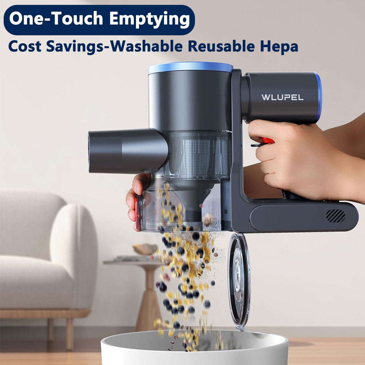 Cordless stick vacuum features a 450W motor, up to 38Kpa suction, and a smart LED display. With 2 power modes, 45min runtime, anti-tangle brush, 7-stage HEPA filtration, and a 1.5L dust cup, it’s perfect for pet hair, carpets, and hard floors. Lightweight and easy to maneuver.