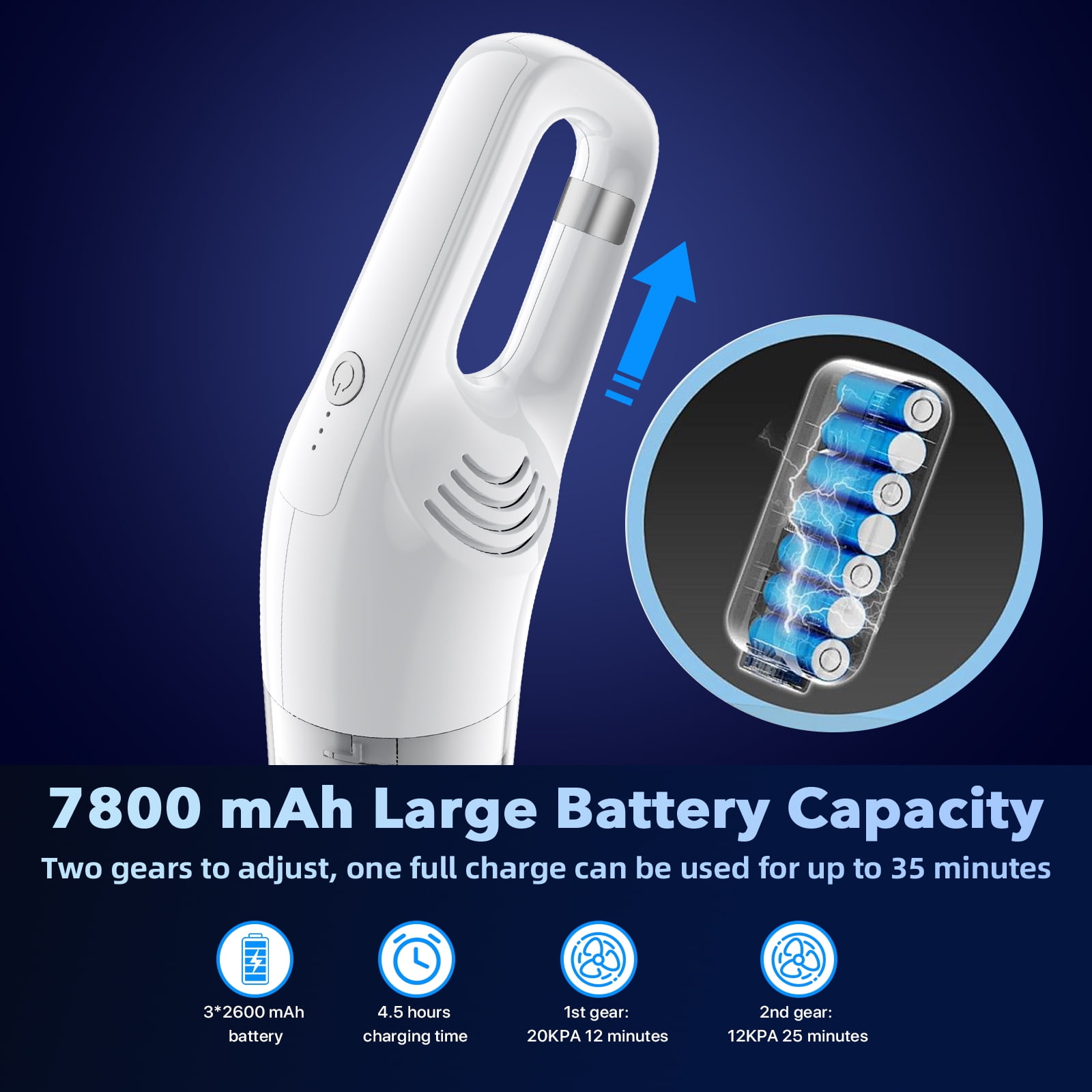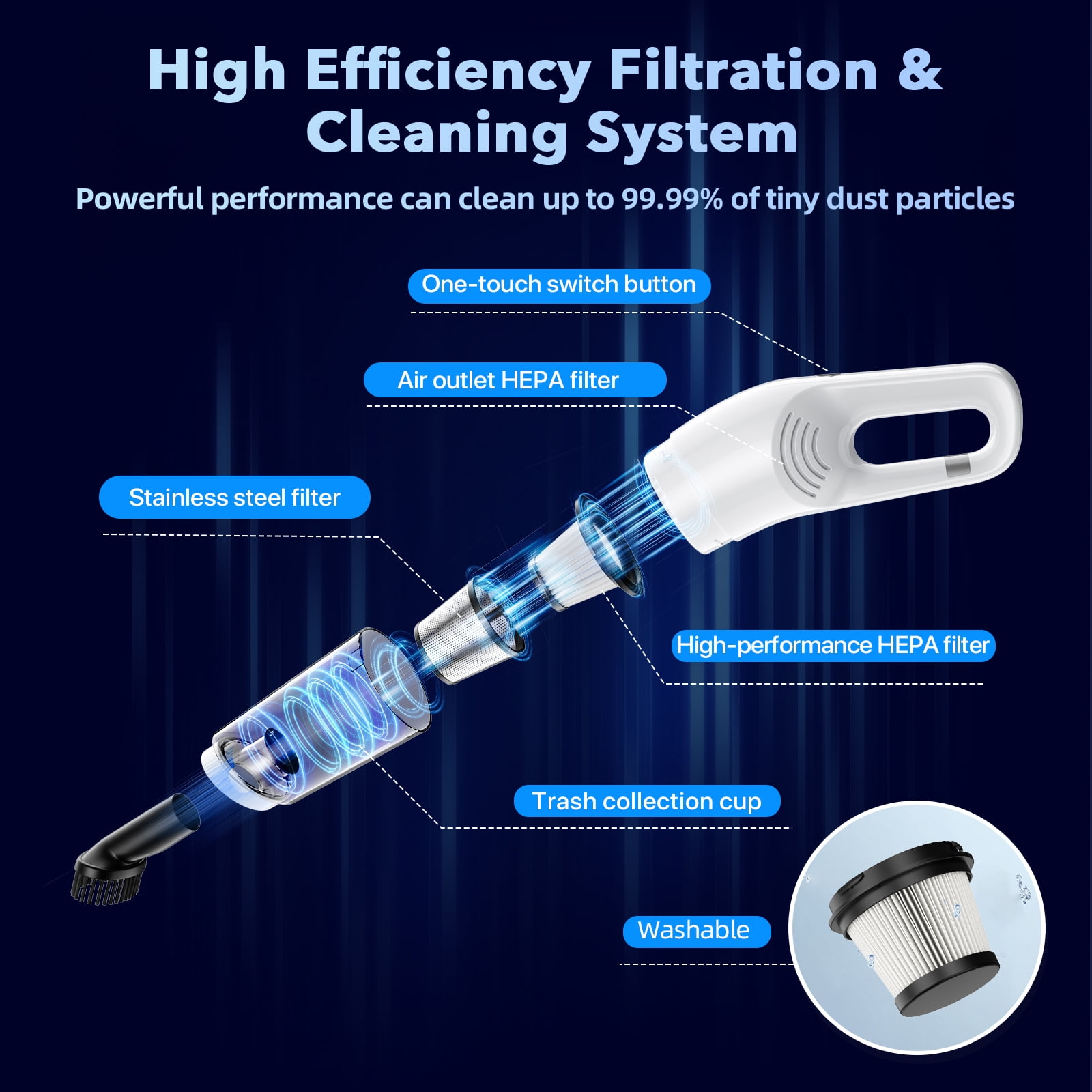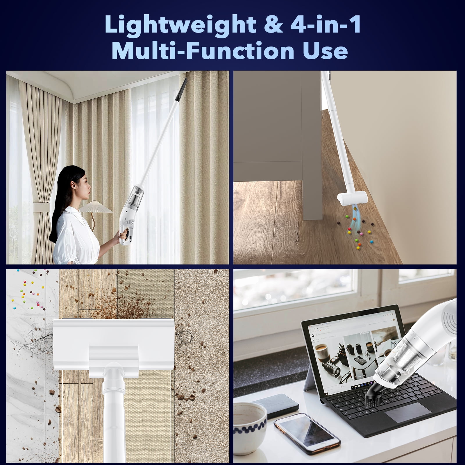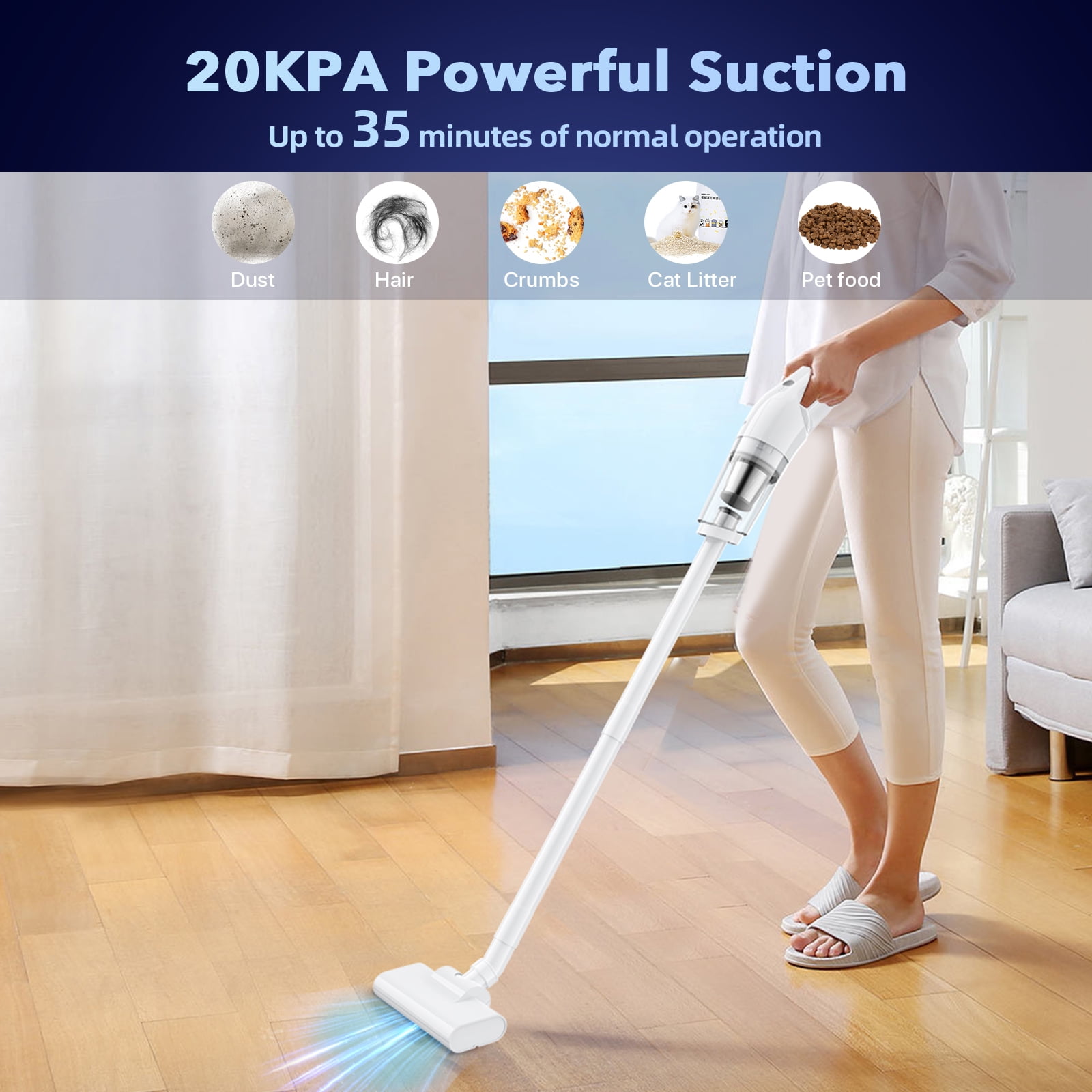 Multiple Accessories and Simple Assembly 2 Suction Modes Vacuum Cleaner Rechargeable Lightweight with Wheels on the Brush Head Adjustable Tube Perfect for Both Adults and Children 40 Mins Runtime Captures Dust and Particles to 0.1 Microns Washable Filter System Two Modes: 20KPA / 12KPA FOR BETTER USE: 1. Please clean the filter and keep it dry after each use to keep a good function of the stick vacuum cleaner cordless. 2.Buy or use your adapter to connect the type-C cable to charge your vacuum cleaner 3. Please confirm the brush head, Cup, and filter are installed correctly before using the portable vacuum cordless. 4. Please don’t use the cordless floor cleaner to suction anywhere with water! 5. Cordless vacuum pet hair for home telescopic tube can be adjusted in three heights, And the height can be adjusted according to needs 6. There will red Indicator light when the battery part is charging, and turn green when it full charged 7. After using the broom vacuum, Please empty the dust in the dust cup in time. 8. When emptying the trash, Please clean the filter and black cylindrical sponge