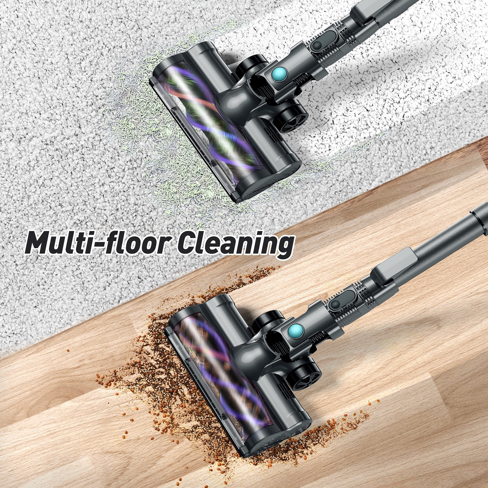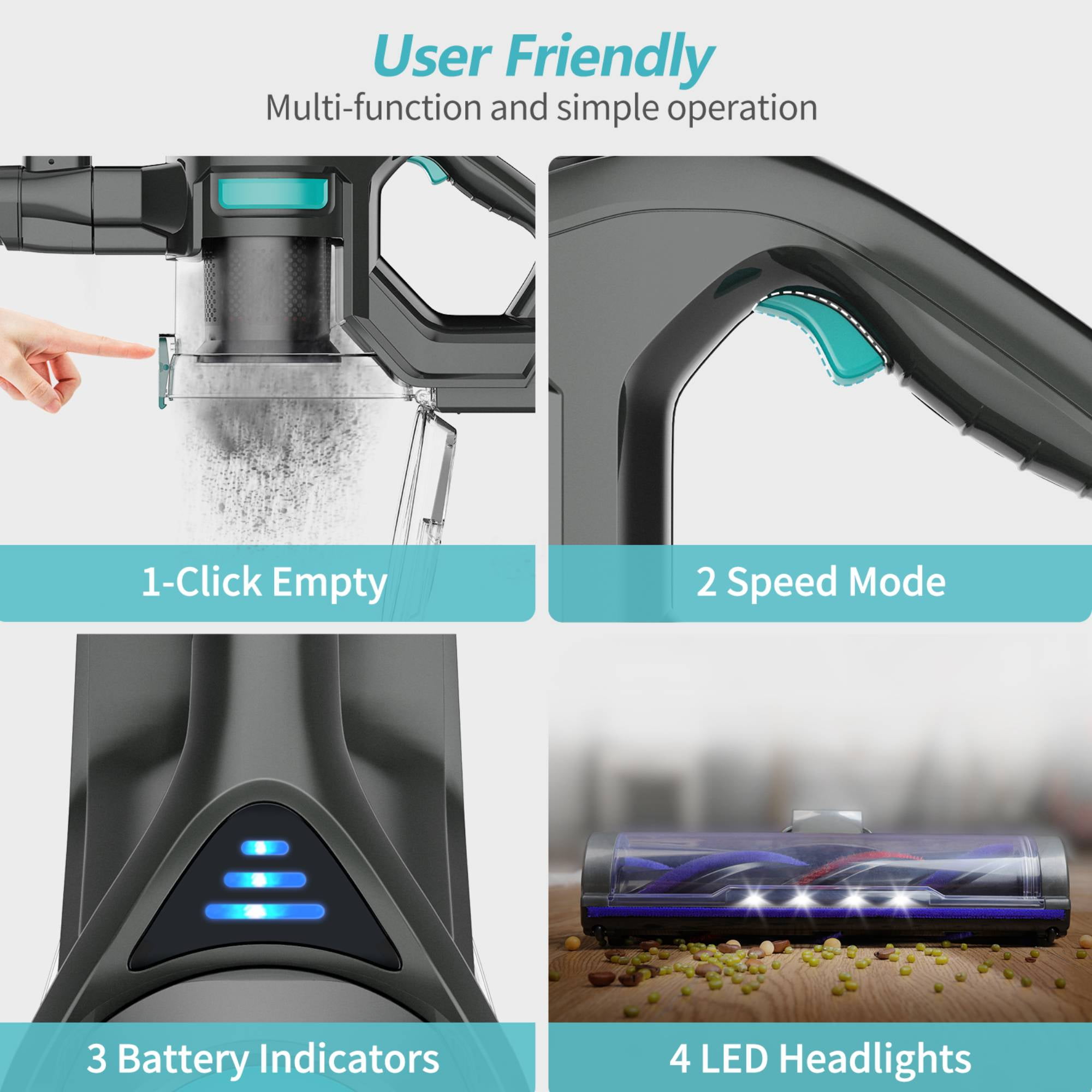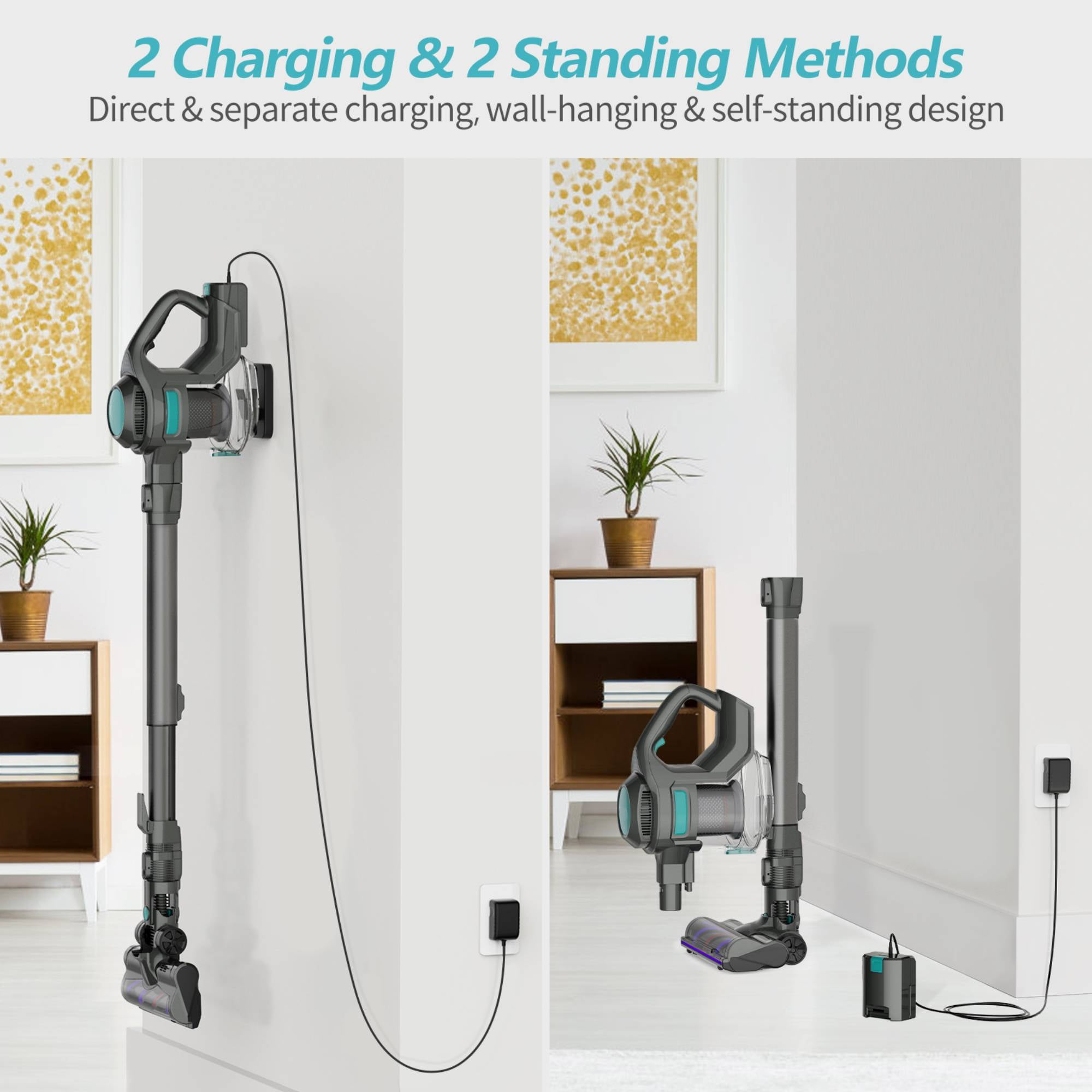 ✨【2 Powerful Suction Modes】As a 4 in 1 cordless stick vacuum, it is equipped a 1.3L big dust cup, powerful suction ensures one thorough cleaning of a whole house for a maximum of 35 mins runtime. One click to empty trash makes it efficient and convenient. It’s easy for the elderly and those with joint pain to clean without bending over. ✨【Effective & Deep Clean】Cordless vacuum cleaner features an upgraded 7.8“ brush head with a 2-in-1 stiff & soft roller, which easily picks up pet hair, dirt, debris, and messes through different surfaces in a short time, including hardwood floor, pile carpet, tile, marble etc. With the 17″ to 27″ extended tube and 2-in-1 brush, it is easily converted into 6 types of vac as an ideal lightweight handheld vacuum for sofa, curtains, various gap and stairs. ✨【4-Stage Filtration System】With 4 stage advanced fully sealed filter system: cyclone filtration, cylinder filtration, Hepa filtration, sponge filtration, this cordless stick vacuum cleaner efficiently captures 99.99% of dust particles as small as 0.1 microns to avoid secondary pollution. ✨【180° Rotatable LED Brush Head】This cordless stick cleaner is equipped with LED headlights for easily track the dust and debris in dark places. With flexible 180°swivel sideways and 90°up and down, it glides under furniture and cabinets easily to eliminate dust and debris that is hard to reach. ✨【Which You Will Get】Package including: Vacuum cleaner main body, 17″ to 27″ Extended Tube, Floor Brush, 2-in-1 Crevice Tool, Cleaning Brush, Adapter, Wall hanger, Screws and Wall Anchors, 2 HEPA Filters. ??If you have any question, please contact us.