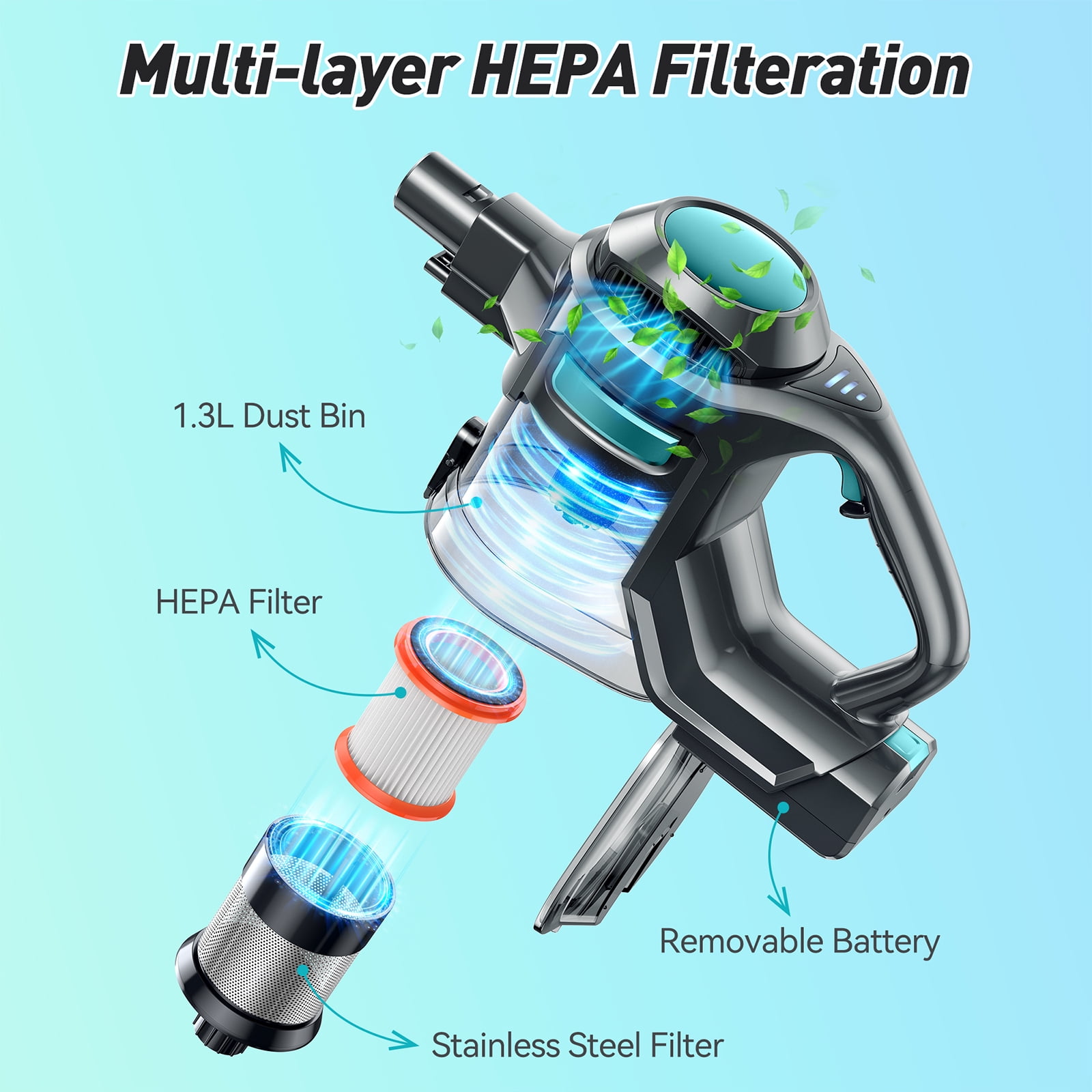 Special Feature: ✅Separate battery, charged independently ✅Up to 36 minutes(Max) ✅Washable HEPA filters keep stable suction performance ✅Lightweight body with 180° rotatable LED brush head ✅1.3L big dust cup ✅6-in-1 handheld cordless stick vacuum great for hard floor & low pile carpet ✅2 modes suction with 150W high-performance cyclonic motor ✅99.97% effective filtration Filter Type:HEPA Filter Is Cordless?:Yes Capacity:1.3 Liters Runtime:30 minutes Form Factor:Stick Color:Gray Model Name:VWVC08 Product Dimensions:11″L x 7″W x 17″H Controller Type:Push Button Control Method:Touch Style:Modern Item Weight:6.35 pounds Included Components: Cordless Vacuum Cleaner Main Body*1 Detachable Extension Tube*1 180° Rotatable LED Floor Brush Head*1 Crevice + Dusting Brush 2-in-1 Tool for Hard & Soft Surfaces*1 Multi-function Cleaning Tool*1 Wall Hanger*1 Screws & Wall Anchors*1 Adapter*1 Washable HEPA Filters (one already assembled in the main body)*2