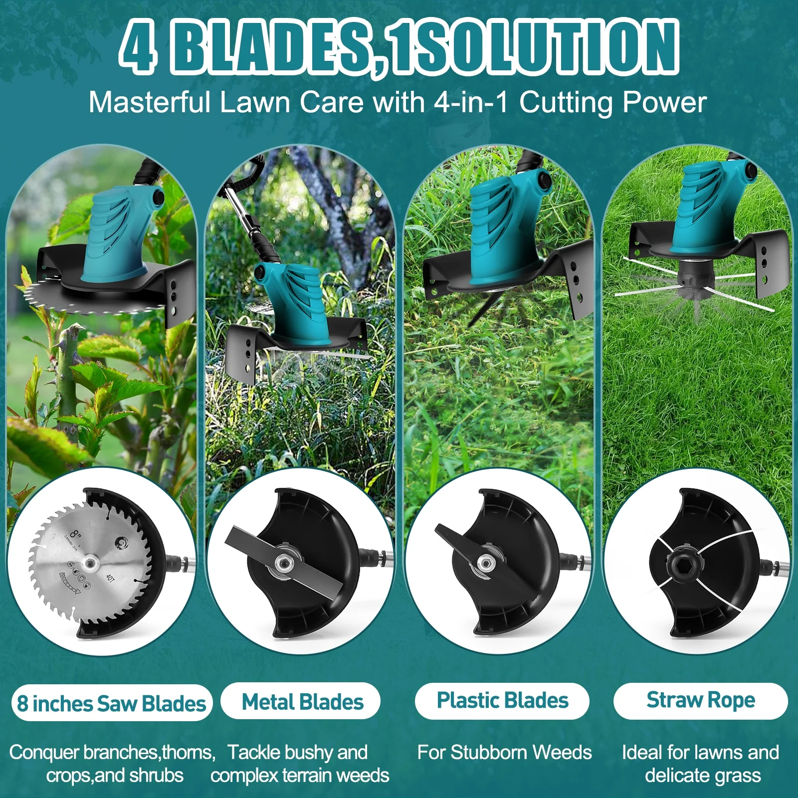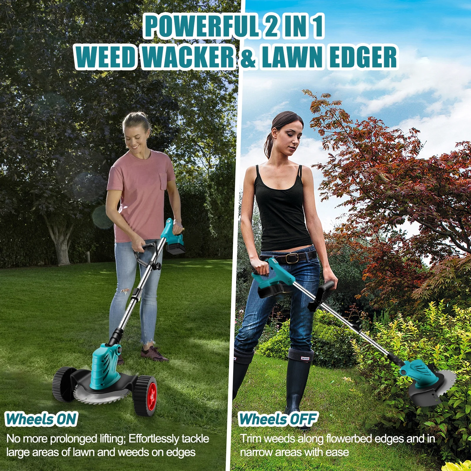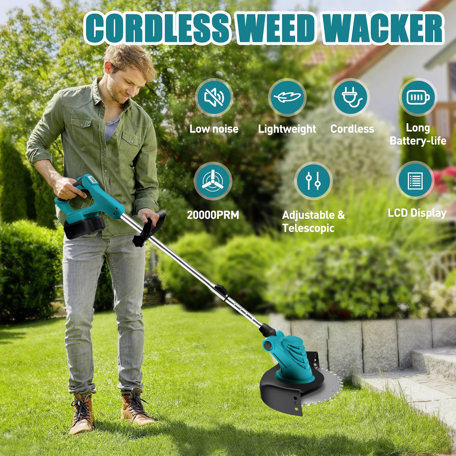Electric Weed Eater Wacker, Cordless Electric Grass Trimmer, Grass String Trimmer, Powerful Weed Lawn Edger Eater with Wheels Portable & Telescoping Pole: WLRETMCI cordless weed wacker is designed to be lightweight, with an adjustable angle and a telescoping length of 38″ to 50.7″, making it ideal for various lawn and garden tasks. Free from the constraints of a power cord, users can easily operate in different environments such as backyards, gardens, and lawns. Powerful & Long Battery Life: The cordless weed eater is equipped with powerful 2000mA large capacity battery, providing working time of about 60 minutes, solving the battery life issue and improving work efficiency. Wireless operation makes your work easier and more convenient. (Please fully charge it before first use.) High-Speed for Weed Trimming & Edging: This weed trimmer operates at a speed of up to 20,000 RPM, delivering strong cutting performance. It can quickly cut through tough weeds and vegetation, making it easy to manage your backyard,garden,lawn or other yard works. 4 in 1 Weed & Brush Cutter: The weed wacker comes with 4 different types of blades, allowing you to choose the most suitable cutting tool based on the specific conditions of your lawn. The cordless weed trimmer includes four blades (8-inch cutting width): ① Straight stainless steel blade for cutting thick weeds and small shrubs; ② 8-inch saw blade for cutting thicker shrubs and branches; ③ Plastic string suitable for trimming soft grass and other light materials (please note that the plastic string is not suitable for cutting thick shrubs and branches); ④ Plastic blade suitable for some stubborn weeds. You can use this weed trimmer to trim the edges of sloped terrain and reach difficult areas. Made with high-quality materials, it is durable and powerful. Wheel Design for Weed Eater: Our weed wacker features a wheel design that enhances the stability and maneuverability of the cordless weed eater, providing additional support and convenience. This makes the backyard work easier and more efficient. Lightweight & Portable:It is compact and lightweight, easy to carry. Compared with models with cables, this trimmer is more mobile and easier to use and carry. It can be used in backyard, yards,garden,lawn, gardens, parks and other areas.