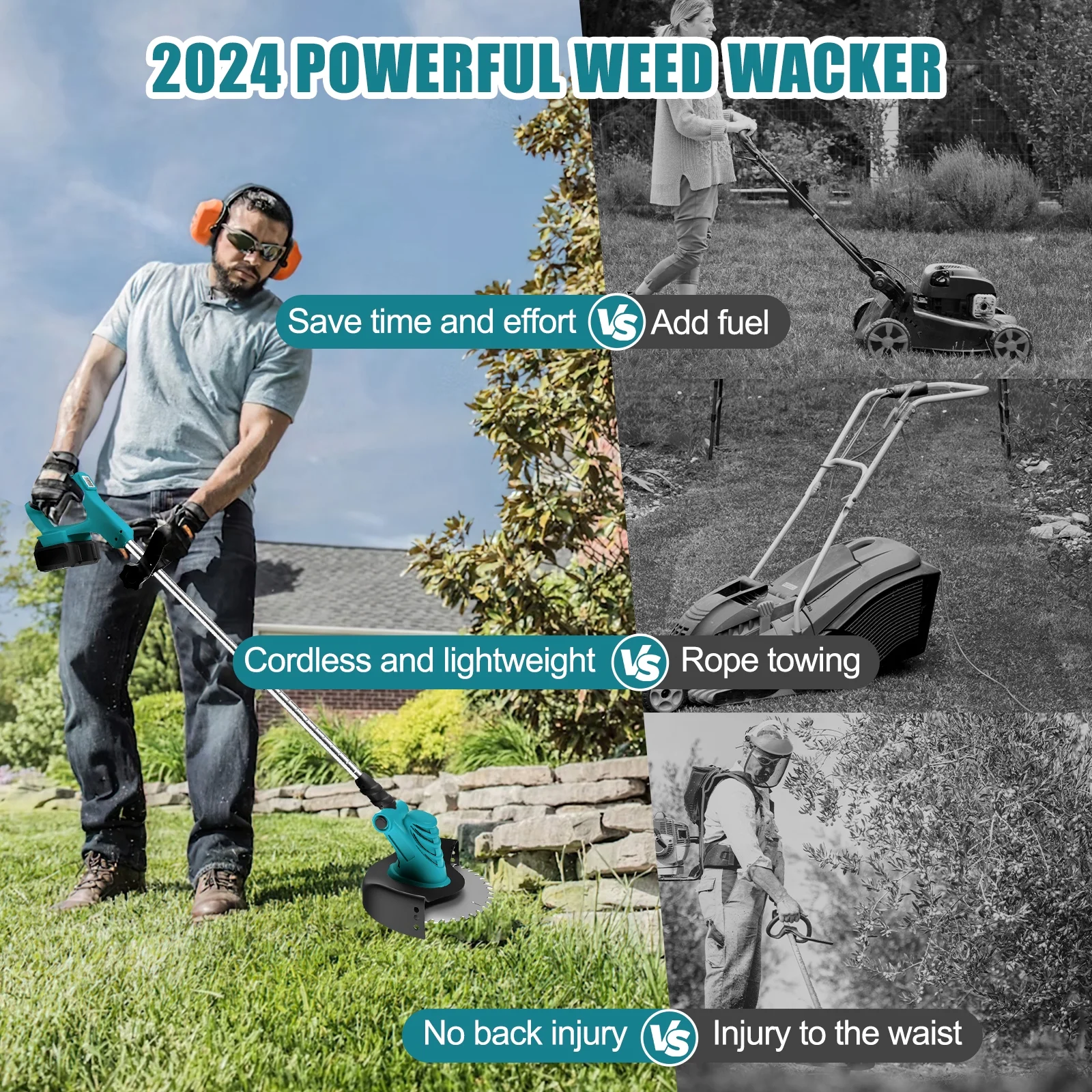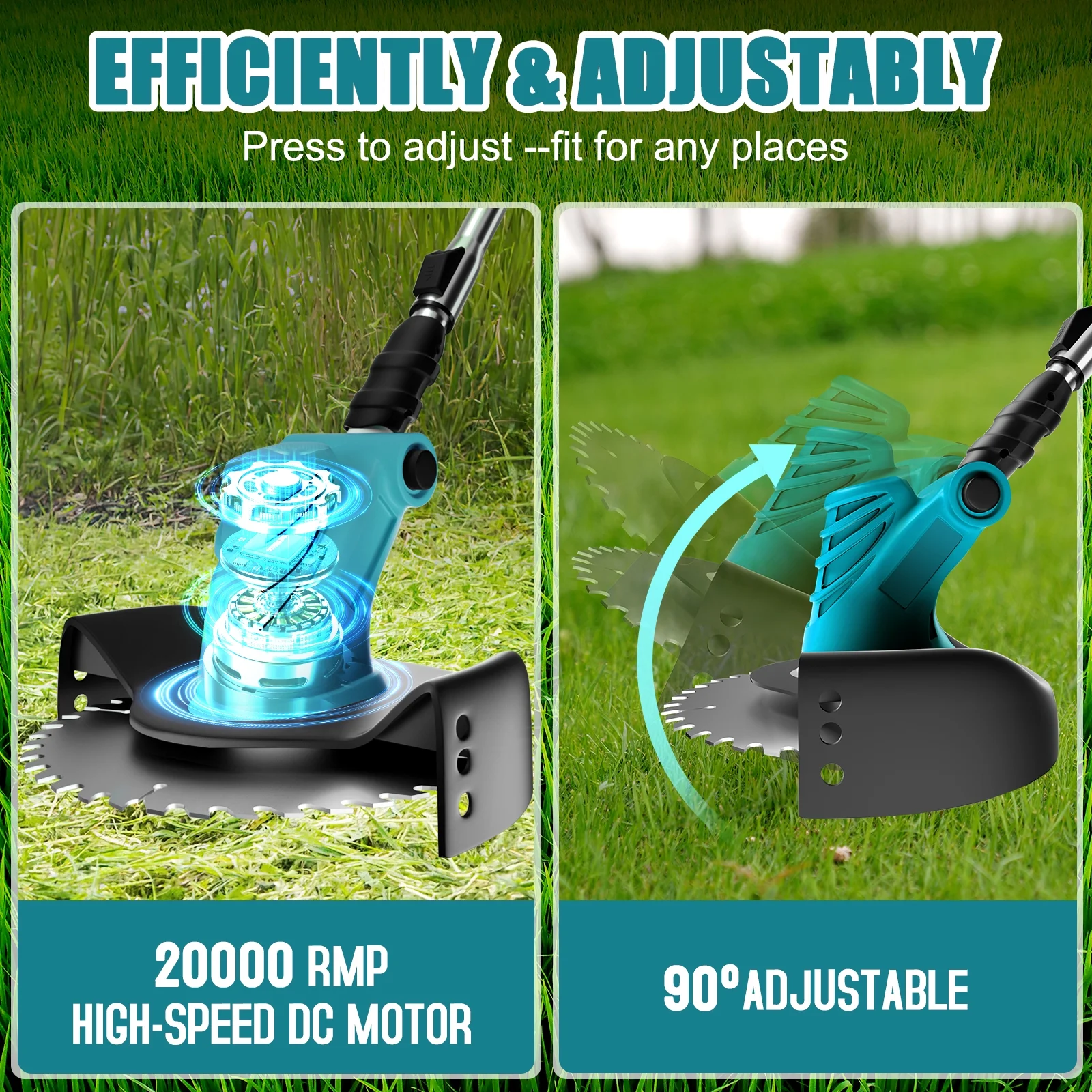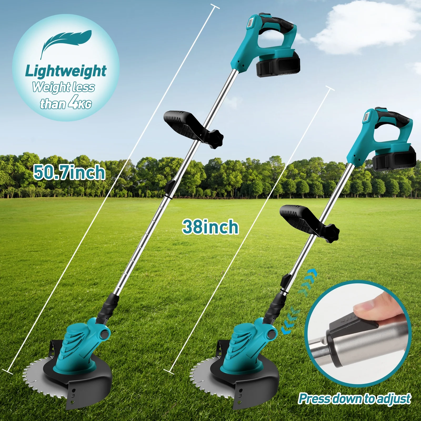 Electric Weed Eater Wacker, Cordless Electric Grass Trimmer, Grass String Trimmer, Powerful Weed Lawn Edger Eater with Wheels Portable & Telescoping Pole: WLRETMCI cordless weed wacker is designed to be lightweight, with an adjustable angle and a telescoping length of 38″ to 50.7″, making it ideal for various lawn and garden tasks. Free from the constraints of a power cord, users can easily operate in different environments such as backyards, gardens, and lawns. Powerful & Long Battery Life: The cordless weed eater is equipped with powerful 2000mA large capacity battery, providing working time of about 60 minutes, solving the battery life issue and improving work efficiency. Wireless operation makes your work easier and more convenient. (Please fully charge it before first use.) High-Speed for Weed Trimming & Edging: This weed trimmer operates at a speed of up to 20,000 RPM, delivering strong cutting performance. It can quickly cut through tough weeds and vegetation, making it easy to manage your backyard,garden,lawn or other yard works. 4 in 1 Weed & Brush Cutter: The weed wacker comes with 4 different types of blades, allowing you to choose the most suitable cutting tool based on the specific conditions of your lawn. The cordless weed trimmer includes four blades (8-inch cutting width): ① Straight stainless steel blade for cutting thick weeds and small shrubs; ② 8-inch saw blade for cutting thicker shrubs and branches; ③ Plastic string suitable for trimming soft grass and other light materials (please note that the plastic string is not suitable for cutting thick shrubs and branches); ④ Plastic blade suitable for some stubborn weeds. You can use this weed trimmer to trim the edges of sloped terrain and reach difficult areas. Made with high-quality materials, it is durable and powerful. Wheel Design for Weed Eater: Our weed wacker features a wheel design that enhances the stability and maneuverability of the cordless weed eater, providing additional support and convenience. This makes the backyard work easier and more efficient. Lightweight & Portable:It is compact and lightweight, easy to carry. Compared with models with cables, this trimmer is more mobile and easier to use and carry. It can be used in backyard, yards,garden,lawn, gardens, parks and other areas.