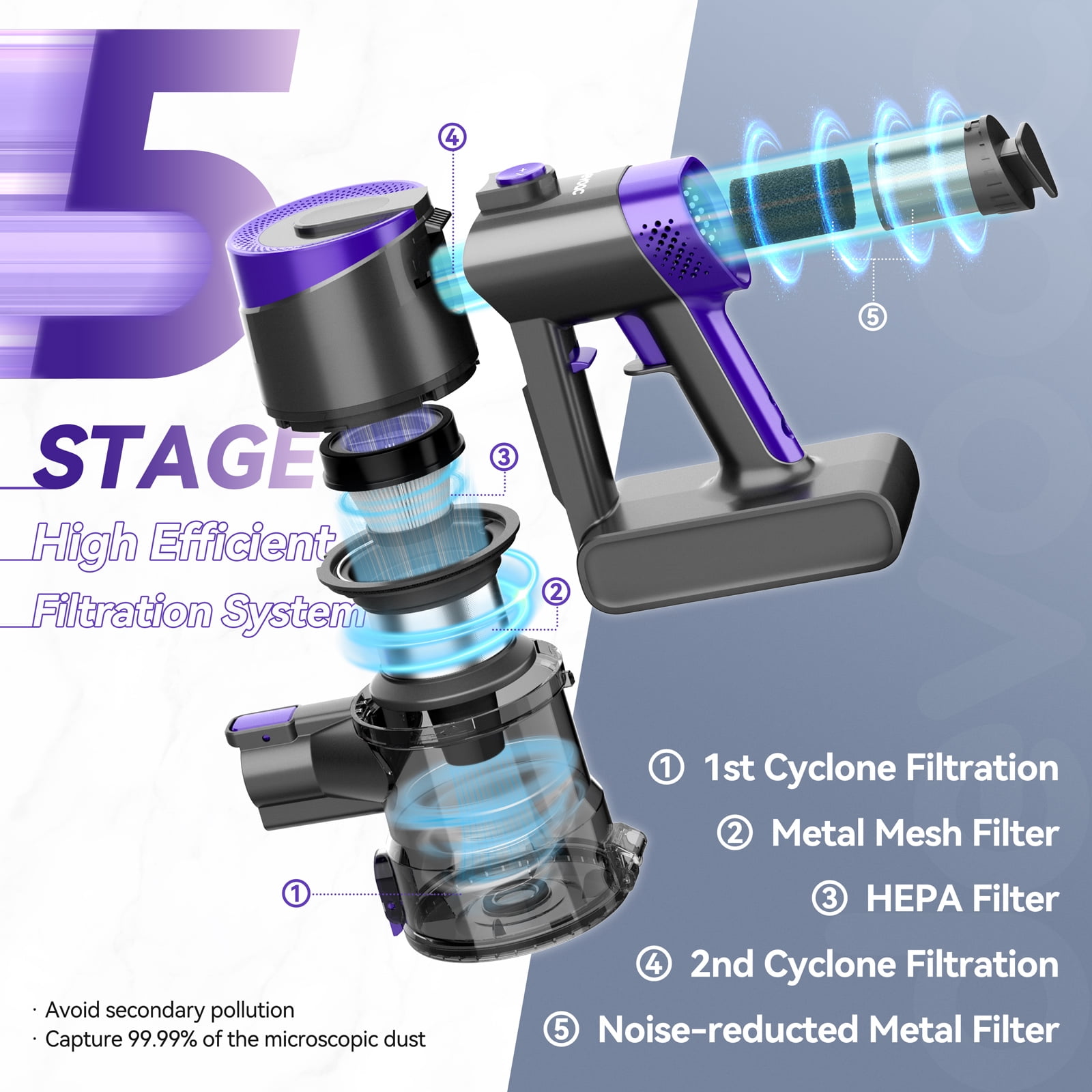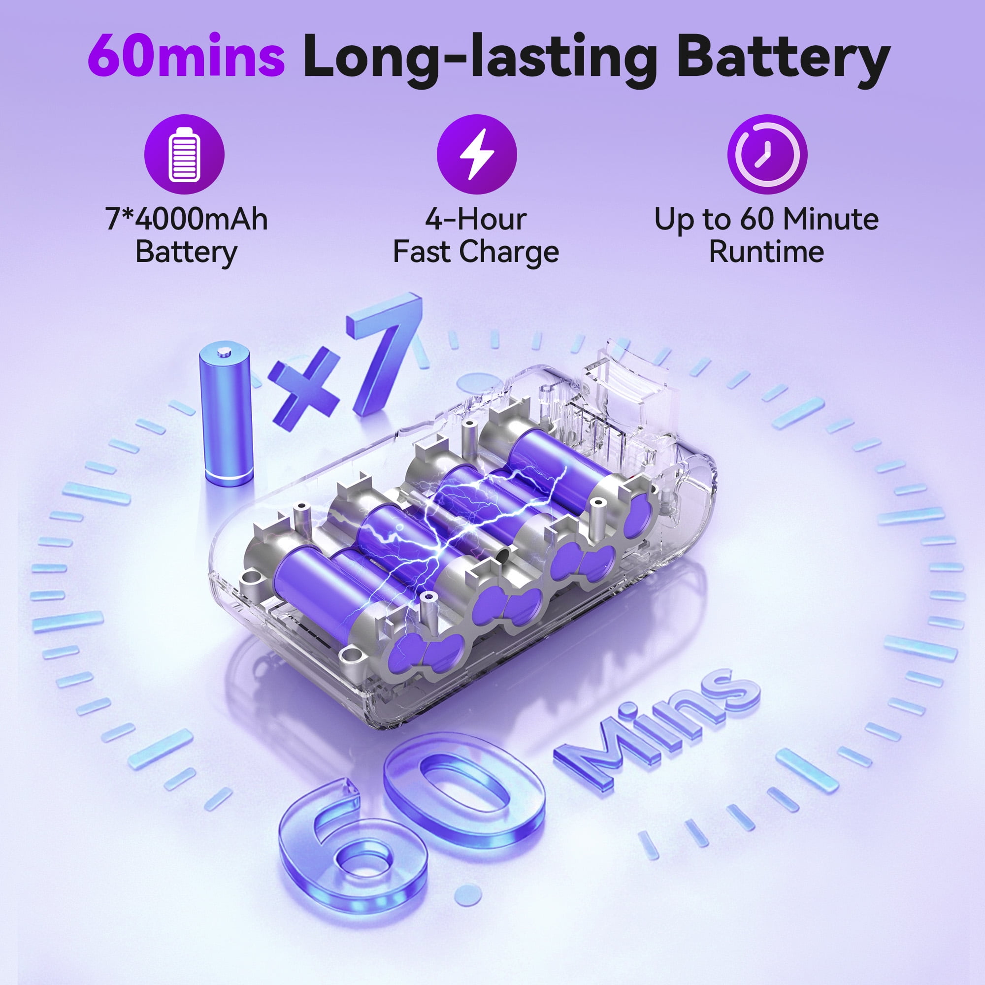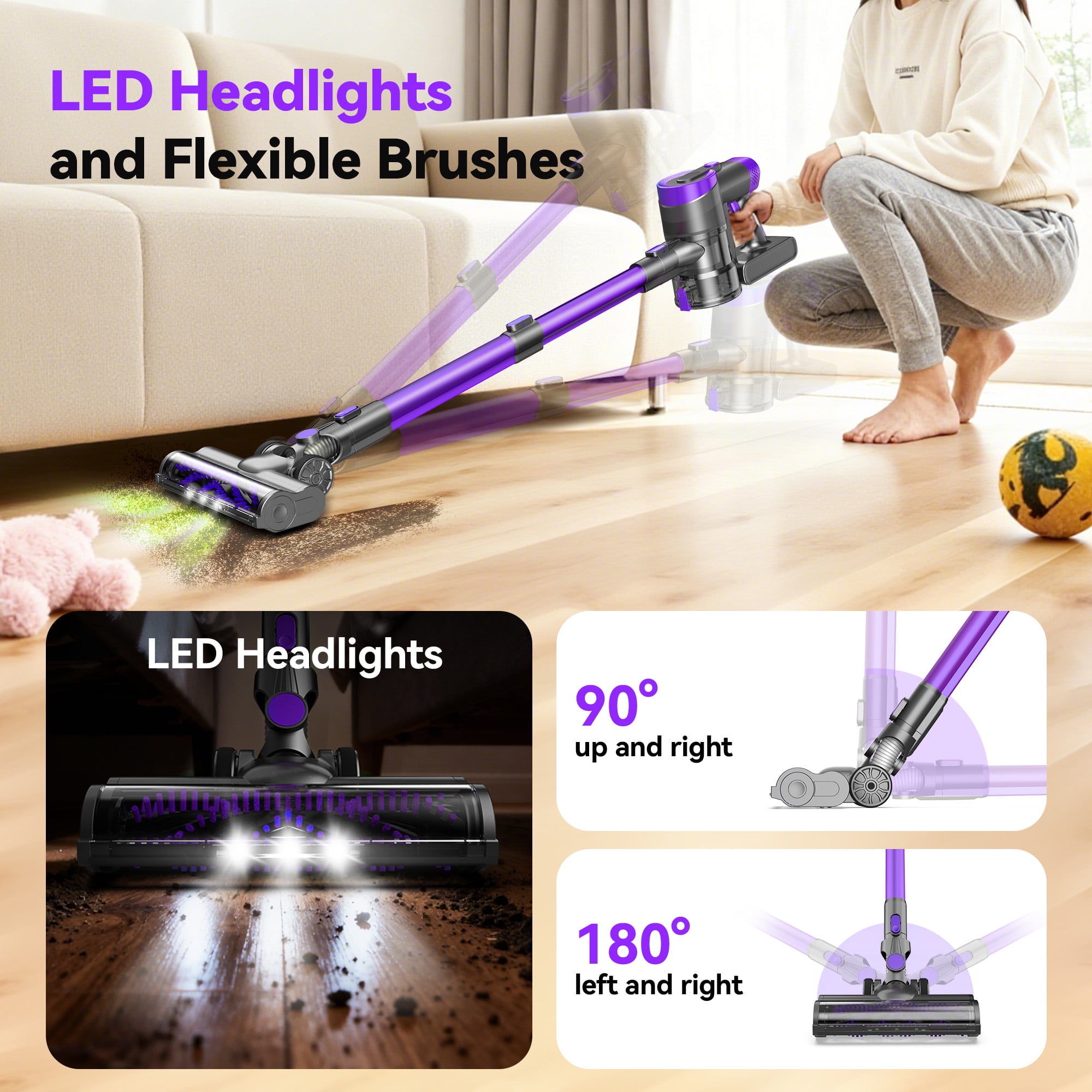 【 30KPa Powerful Suction & Brushless Motor 】 This advanced cordless vacuum cleaner features a 300W high-energy brushless digital motor delivering up to 30KPa of powerful suction. Combined with an innovative inline design, suction efficiency is boosted by 30%, making this brushless vacuum cleaner ideal for thoroughly cleaning carpets, hardwood floors, tiles, sofas, and car interiors—effectively removing pet hair and hidden debris. 【 60-Minute Extended Run Time 】 Built-in 4000mAh batteries allow this rechargeable vacuum cleaner cordless to deliver up to 60 minutes of continuous operation in Standard Mode. With three suction power settings, this cordless vacuum cleaner effortlessly handles whole-home cleaning in large residences, tackling multiple scenarios on a single charge. 【 Smart LED Display 】 The intuitive touchscreen on this cordless vacuum cleaner provides real-time updates on battery level, roller brush clogging, and filter status. It supports one-touch mode switching and smart protection alerts, keeping you informed throughout the cleaning process. 【 5-Layer Filtration & 99.99% Dust Capture 】 Equipped with a new 5-stage fully sealed filtration system, this vacuum cleaner efficiently captures 99.99% of dust particles as small as 0.1 microns, ensuring clean exhaust air. The 0.8L large-capacity dustbin features one-touch emptying for mess-free and hygienic disposal. 【 6-in-1 Multi-Scene Cleaning 】 This versatile lightweight vacuum cleaner includes an electric floor brush, 2-in-1 brush, crevice tool, and metal telescopic tube. Combine freely for 6 cleaning modes for Home Pet Hair Carpet Floor. The brush head flexibly rotates 135° and features built-in LED lighting, leaving no dark corners untouched. 【 User-Friendly Design & Peace-of-Mind Warranty 】 This rechargeable vacuum cleaner cordless includes a dedicated Easy Rest stand for stable storage against furniture. Its energy-efficient and durable construction comes with a 12-month warranty, making this cordless vacuum cleaner a wireless and worry-free cleaning solution for every household. ★ 3 Power Modes Meeting Multi Needs MAX Mode (30Kpa): Provide deep cleaning (20 mins), especially for food scraps or use on Low-Plie carpet Standard Mode (20Kpa): Moderate for daily cleaning (35 mins), provide long-term cleaning time, absorb dust, paper dust and hair ECO Mode (12Kpa): Suitable for daily cleaning (60 mins), provide long-term cleaning time, absorb dust, paper dust and hair *Actual run time will vary based on power mode, floor type or attachments used