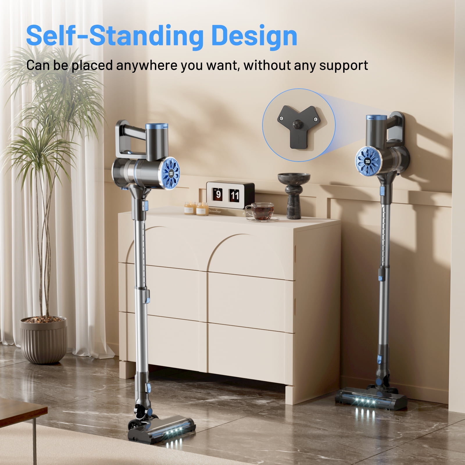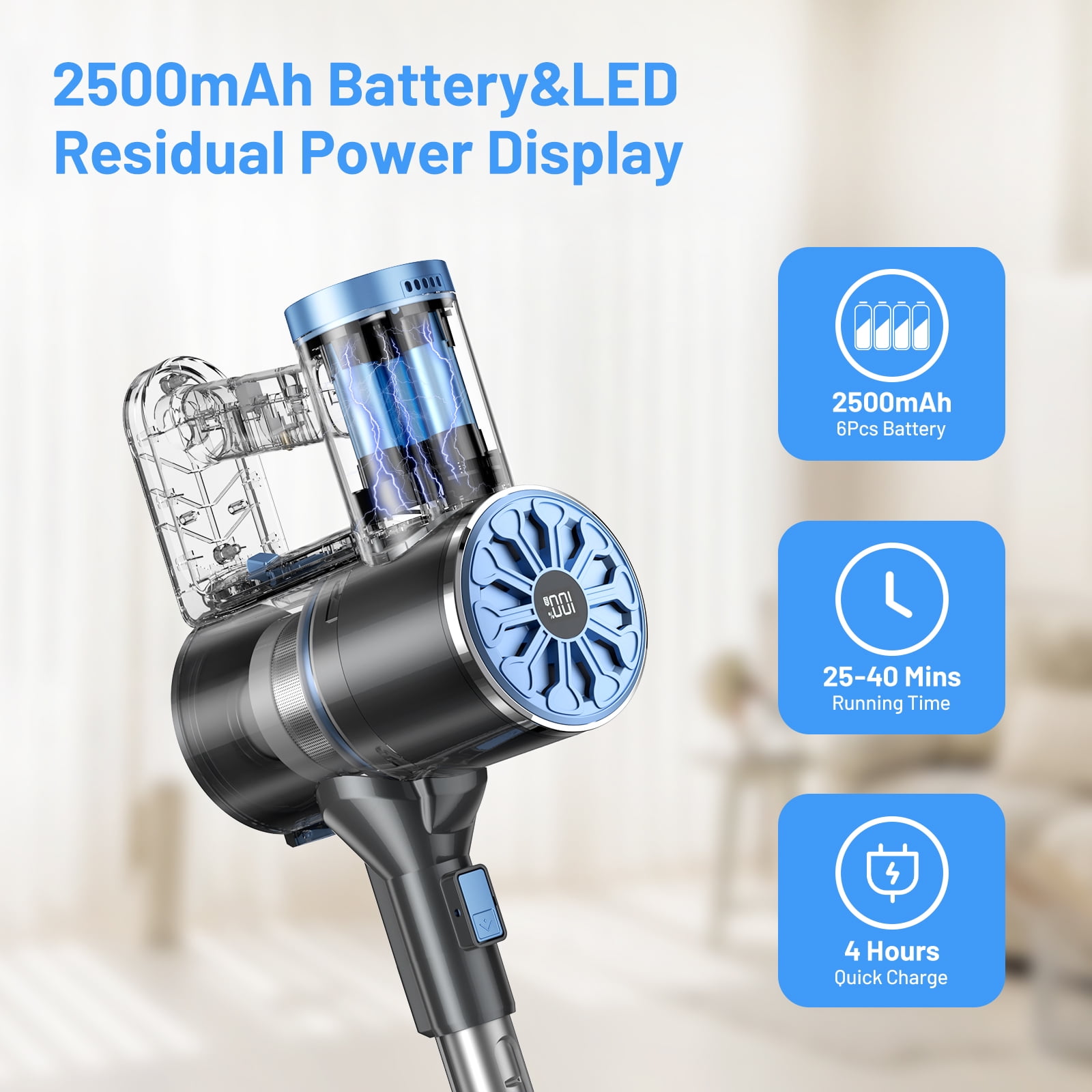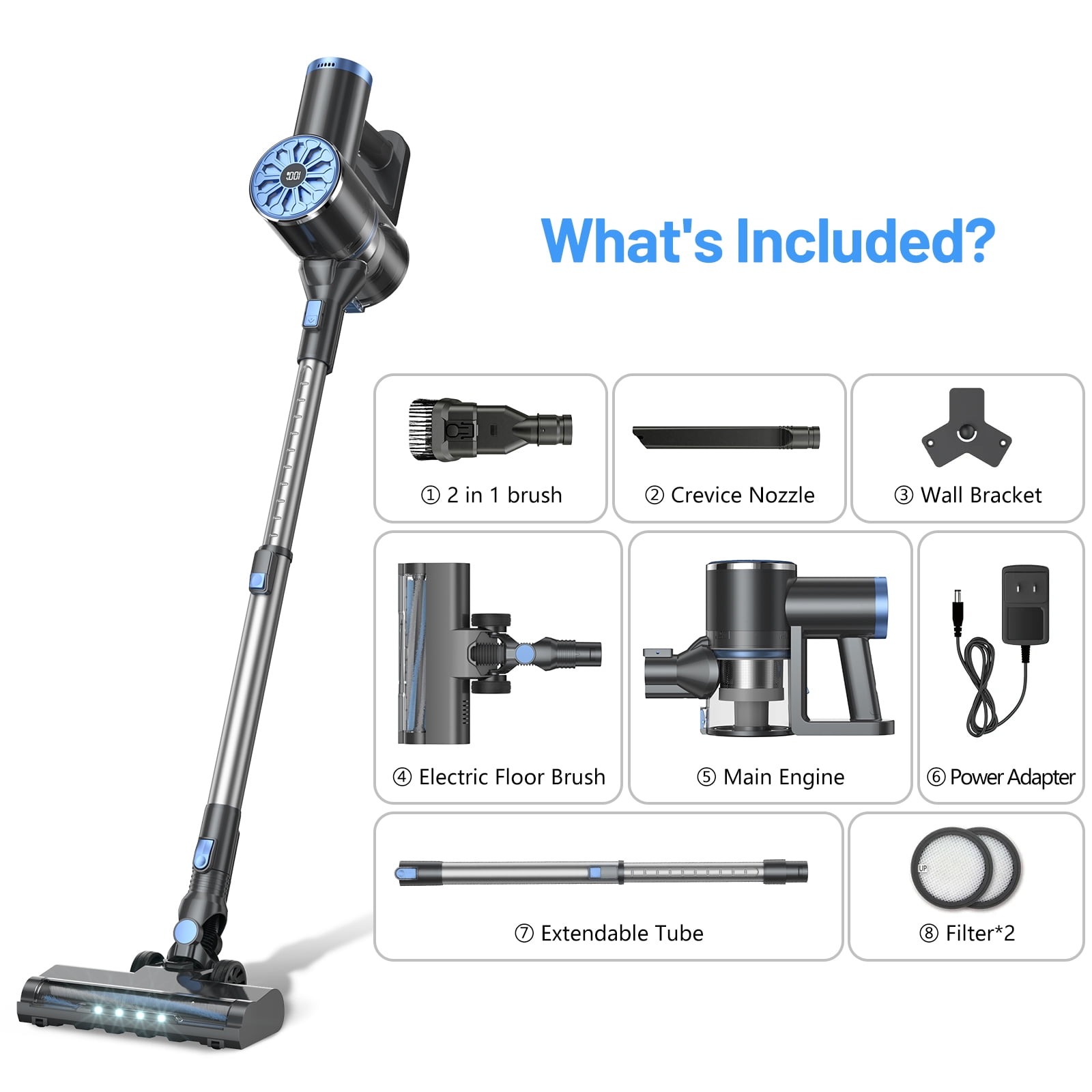 【30KPA Strong Suction&Powerful Motor】 Hicloud stick vacuum with 30000Pa suction almost reaches the suction of a traditional canister vacuum, but it works quietly, less than 65dB. It can instantly capture large and fine particles, pet hair, and debris on carpets, hardwood floors, and tiles, and truly efficient cleaning. 【Battery Indicator & Convenient Monitoring】 Hicloud cordless vacuum is equipped with a battery indicator that displays the remaining battery life during cleaning. When charging, upright vacuum cleaners shows the amount of charge completed. This carpet vacuum helps manage your time effectively and alleviates any anxiety caused by power concerns. This stick vacuum cordless rechargeable provides 40 minutes runtime in 11000Pa and 20 minutes in 30000Pa, ensuring thorough one-time cleaning of 180㎡ (1937.50 sq ft) houses,2 adjustable modes adapt to different situations, and allow full use of the battery. 【Lightweight &Convenient Handling】 Hicloud vacuum cordless main body weighs only 3.3lb, user-friendly for users of all ages, even children, pregnant women, or the elderly can easily pick it up and use it, and it is extremely suitable for long-term one-hand cleaning. The retractable tube allows users to freely adjust the length to meet their different needs. 2.6ft- 3.4ft adjustable length, easy to reach high places, such as ceilings and vents, etc. 【7-Stage Filtration & One-click Dust Dumping】 Hicloud vacuum cleaners for home uses a stainless steel filter with small filter hole precision. The service life is twice as long as a traditional filtration system. After cleaning, users only need to press a button to empty the 1.2L large-capacity dust bin. HEPA is washable and recyclable. 【Conveniest Storage & Multiple Accessoies】 Hicloud hardwood floor cleaner equipped with different attachments for different tasks. With an ergonomic handle, people can easily complete the cleaning work. Adjustable extension tube and wall-mount design saves users’ home space. Product Specifications 30Kpa Powerful Suction 2500mAh Rechargeable Battery Newly Upgraded 2 in 1 Roller Brush LED Residual Power Display 180°+ 90°Rotation Brush Head 4 Bright LED Headlight Up to 40mins Long-Lasting Time 1.2L Large Dust Cup 4-5 Hours Charging Time ➤ Package Include: 1 x WC01 Vacuum Cleaner 1 x Rotatable Brush Head 1 x Wall Bracket 2 x Hepa Filter 1 x 2 in 1 Brush 1 x Crevice Nozzle 1 x Adjustable Metal Tube 1 x Power Adapter 1 x Instruction Manual