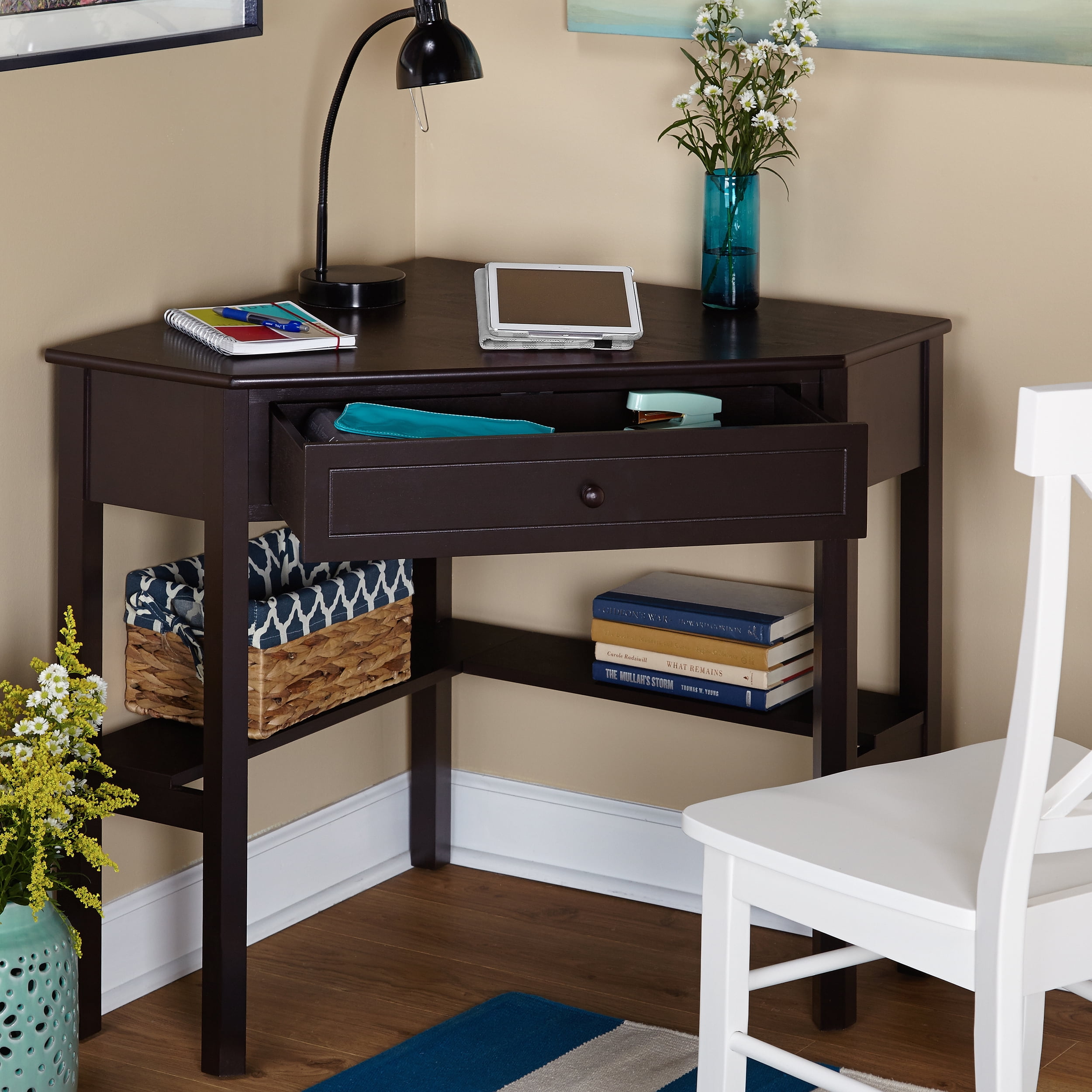 Corner Writing Desk, Multiple Finishes: Wooden corner desk constructed of wood and MDF 1 drawer for storage Comfortably Fitting in Any Home, Studio, Apartment, and Office, the Small Corner Writing Desk Maximizes Space in Compact Rooms With Enough Tabletop Space for a Desktop Display or Laptop, the Corner Desk also has One Drawer and One Shelf to Store any other Items You May Have. Lower shelves are great for books or knickknacks Cherry or Black or antique white or espresso finish Dimensions: 42″ W x 28″ D x 30″ H Floor to bottom of desk: 23.5 inches Drawer: 29 inches wide x 10.5 inches deep Shelf: 9.75 inches long x 7 inches deep Weight: 39 lbs Assembly Required