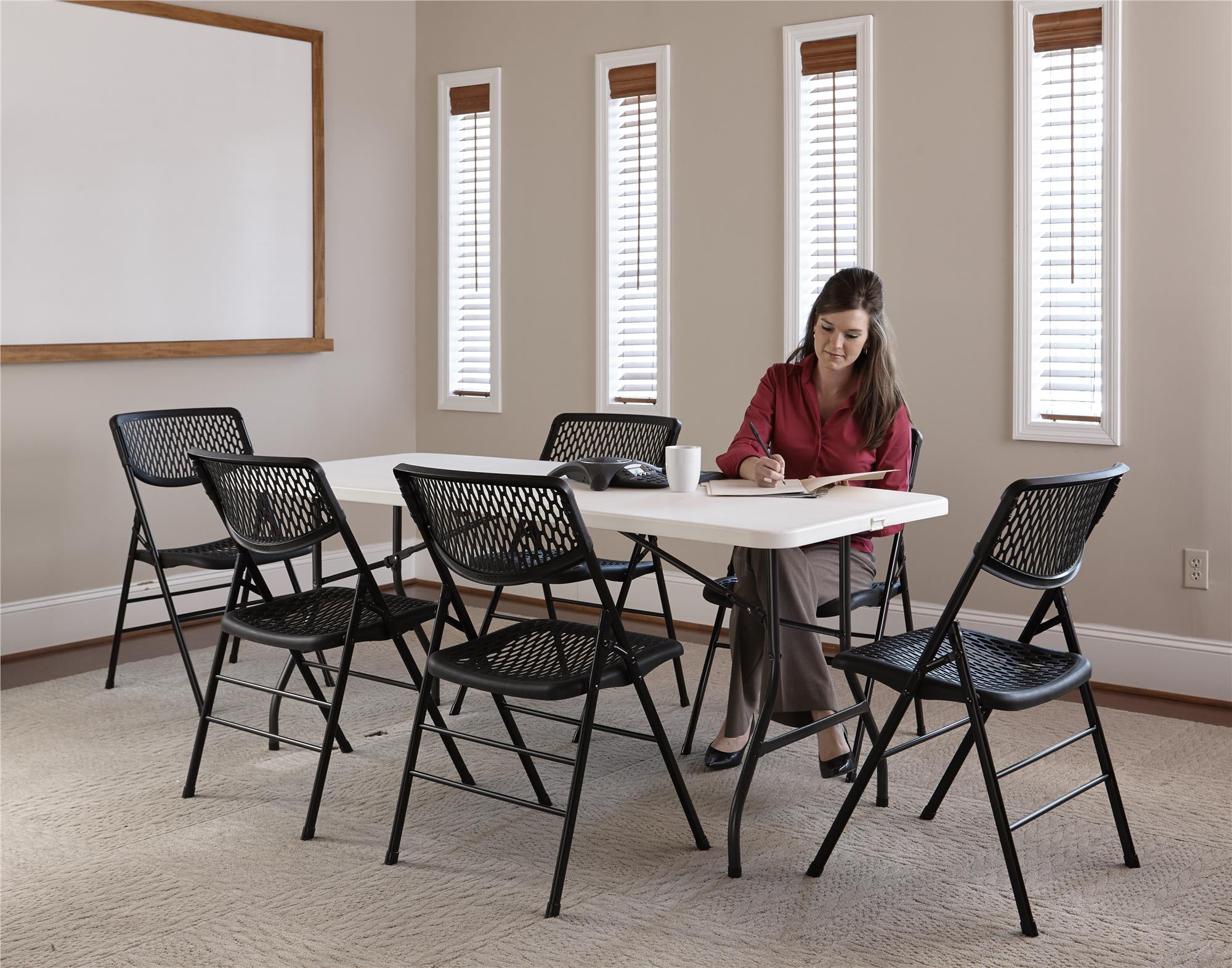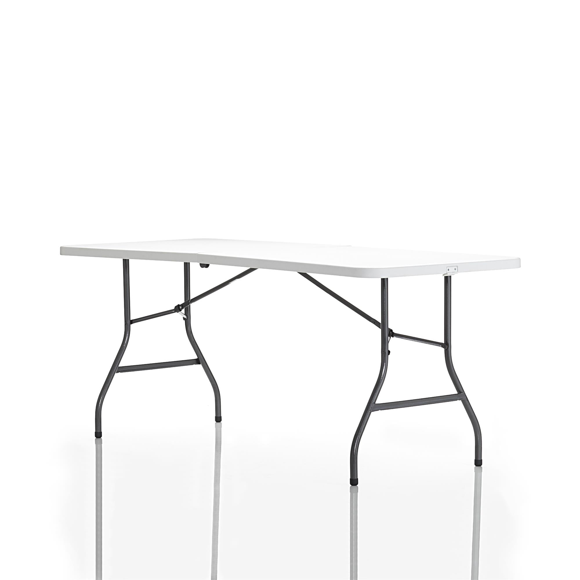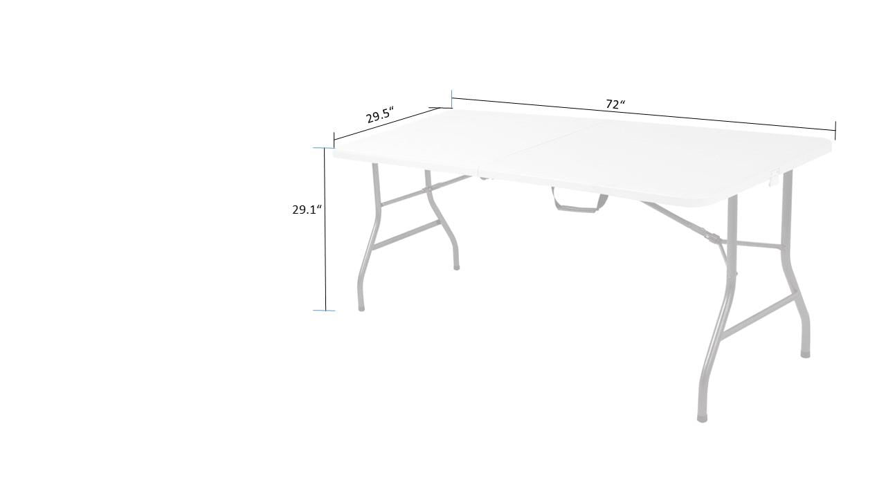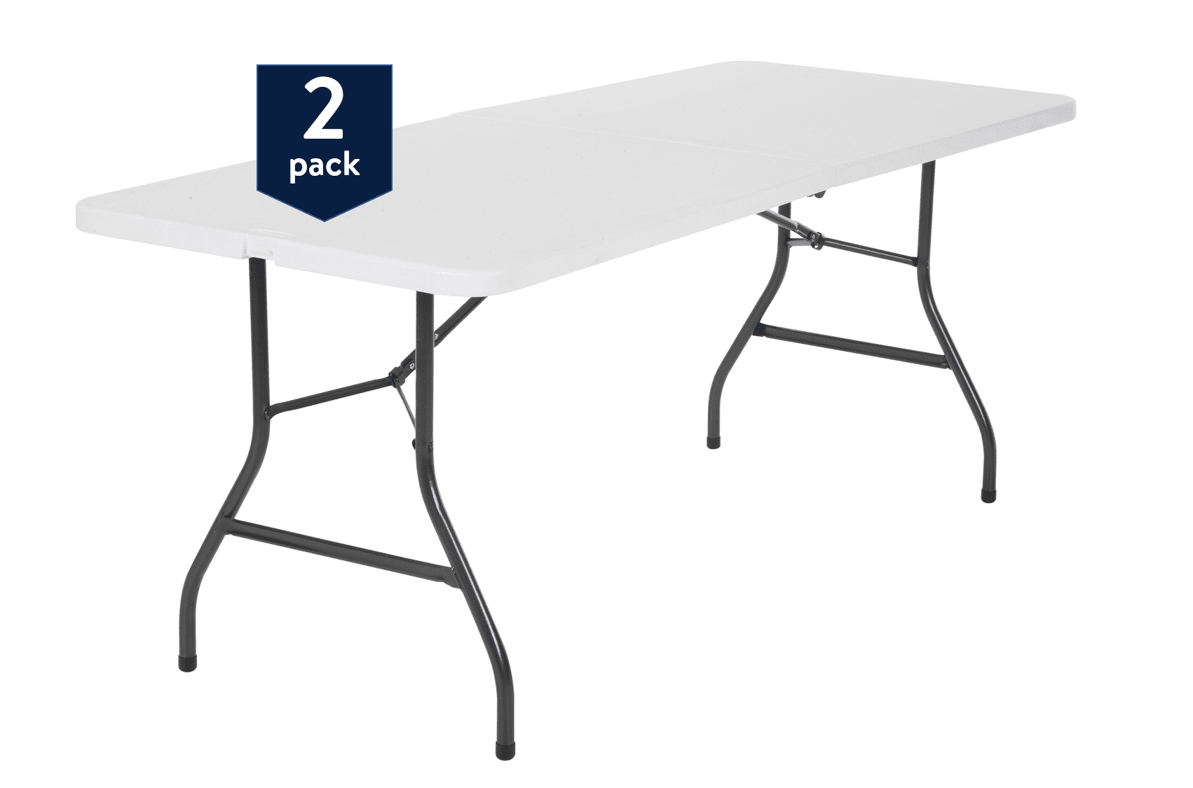 COSCO Deluxe 6′ Fold-in-Half Blow Molded Folding Table, White, 2-pack: Secure Lock: Keeps table closed when transporting Comfort Handle: Comfortable to carry when folded and locked Lightweight: 25.5 pounds makes this table easy to carry Assembled dimensions: 72.00″ x 29.50″ x 29.13″ Folded Dimensions of 36.5″(L) x 29.6″(D) x 3″(H): Makes for easy transportation and storage when not in use Non-Marring Leg Tips: Protect indoor flooring from scratches and scraps HDPE Molded Top: Durable and easy to clean 1 year limited warranty