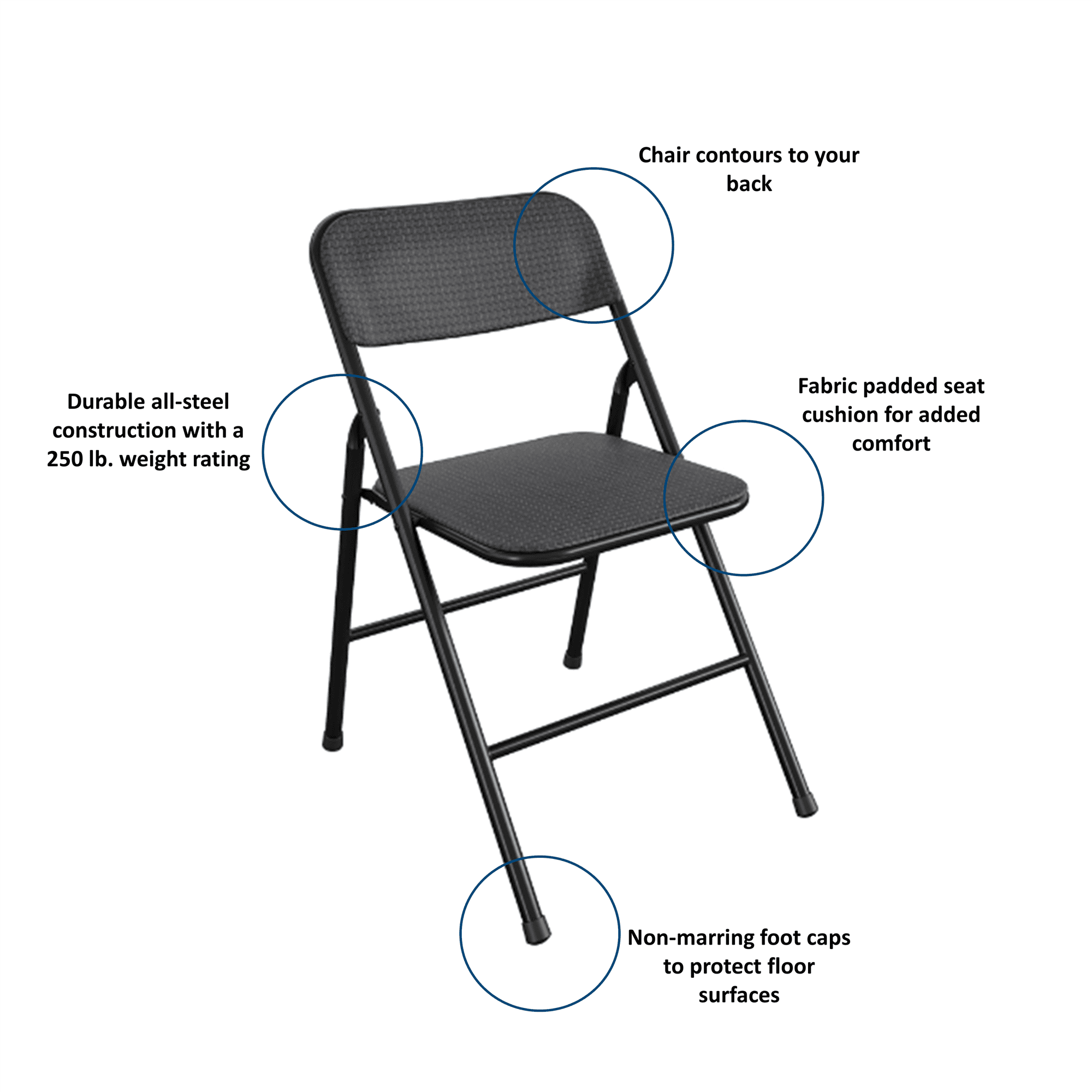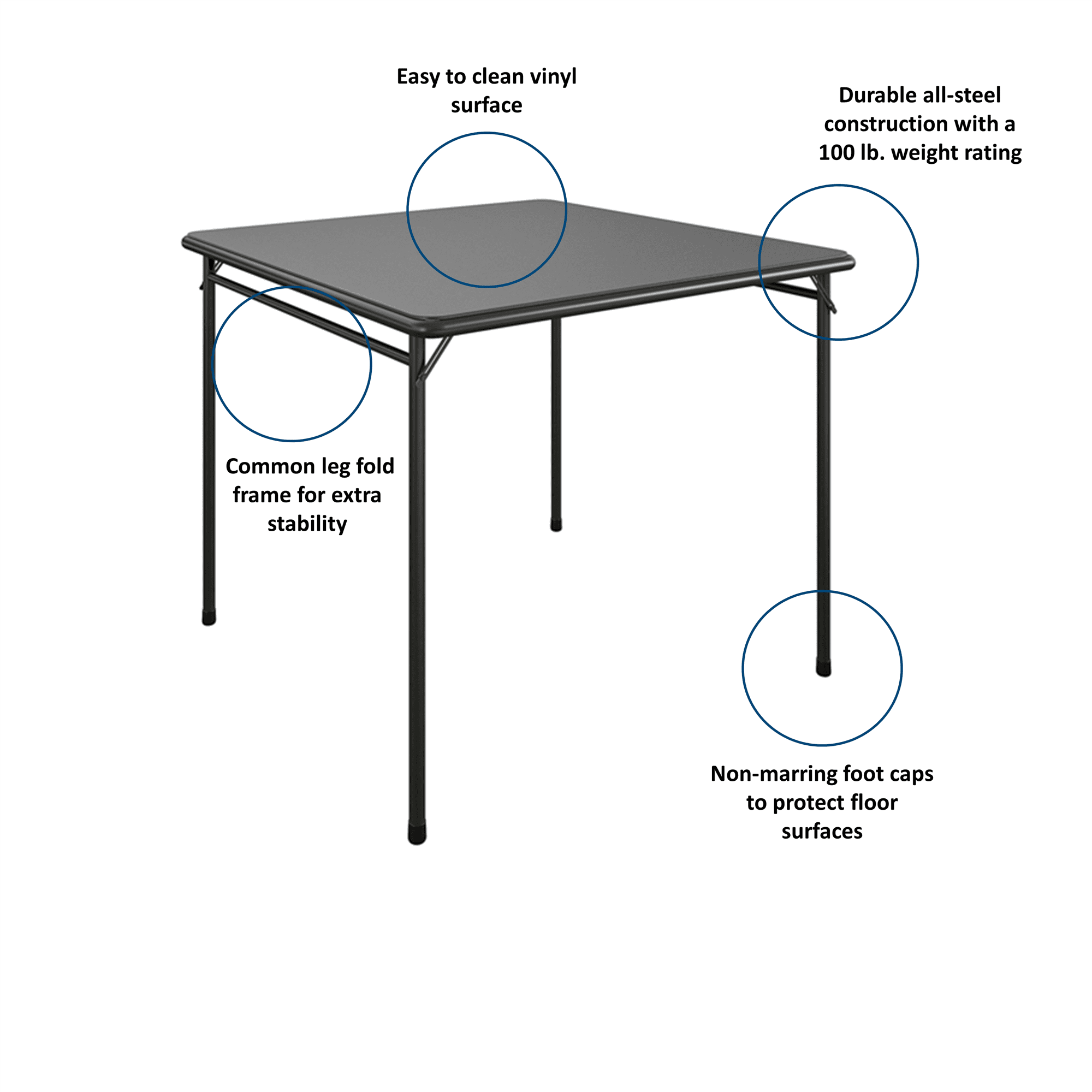 COSCO’s 5-piece folding vinyl table and fabric chair set is a trusted solution for quickly preparing a comfortable seating arrangement for four. The set will enhance any atmosphere ranging from family gatherings, parties, or tailgates. Comfortable for entertaining and compact for storage, our sets feature durable steel frames and a powder-coated finish. This black set comes with a sturdy 34″ square card table with low maintenance and easy to clean vinyl table top. The cross braces and tube-in-tube reinforced frame of the table guarantees a long-term investment you will enjoy for years! The four chairs, built for maximum comfort and durability, are upholstered in an attractive fabric with padding on the seat and back so you can relax in style as you enjoy with family and friends. The tables and chairs are made of a sturdy steel frame and rubber tips to protect your floors without fear of it slipping or scraping. When not in use, the set folds compact for easy storage. COSCO has been a trusted solution for hospitality, office products, and home improvement for over 80 years. Welcome this premium set into your home and experience the trusted comfort and durability that COSCO has built into our products throughout generations. Folding card table and 4 fabric padded seat & back folding chairs. Long-lasting comfort, durable, multi-purpose, great for everyday dining, extra seating, entertaining, and holiday gatherings.
