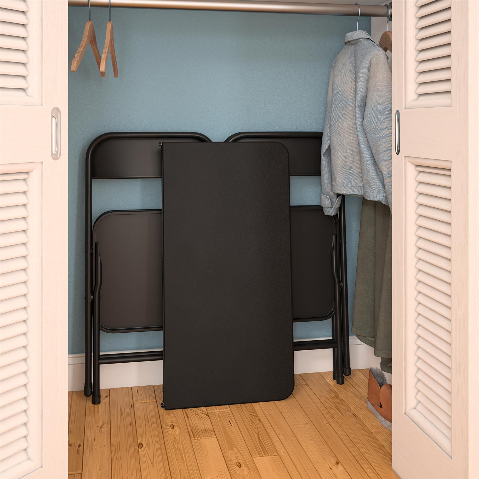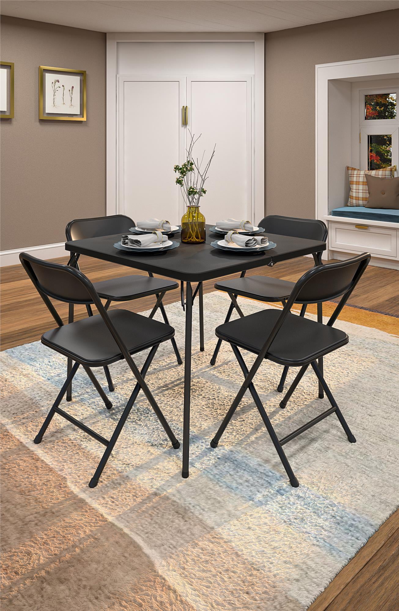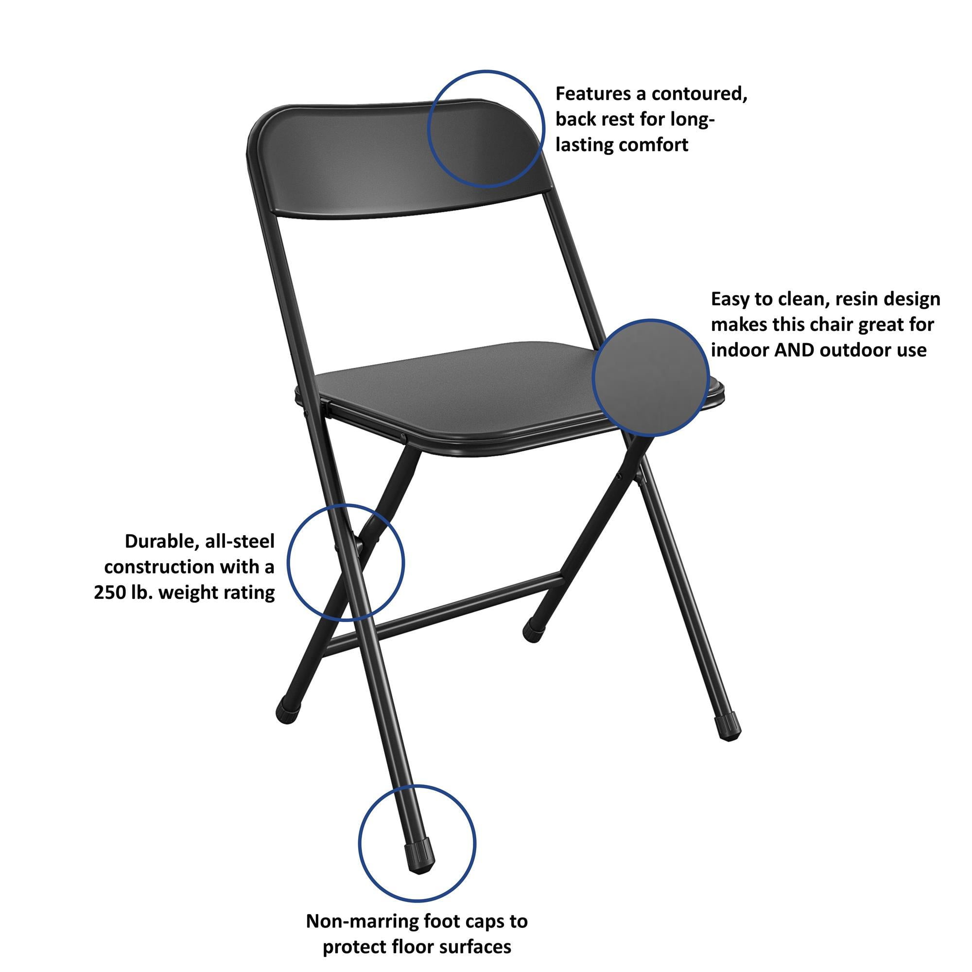 This 5-Piece set is a multipurpose indoor & outdoor dining set. Great for holiday gatherings, parties, hobbies, tailgating or everyday use! Set comes with four (4) premium resin folding chairs providing long-lasting comfort and a 34″ square, vinyl top folding card table. Vinyl card table is easy to clean. Lightweight chairs are each 5.4Ibs and table weighs 10.7lbs. Chair cross brace on back legs with reinforced steel frame adds strength and stability and has a 250Ibs weight capacity. Vinyl card table has 100Ibs weight capacity