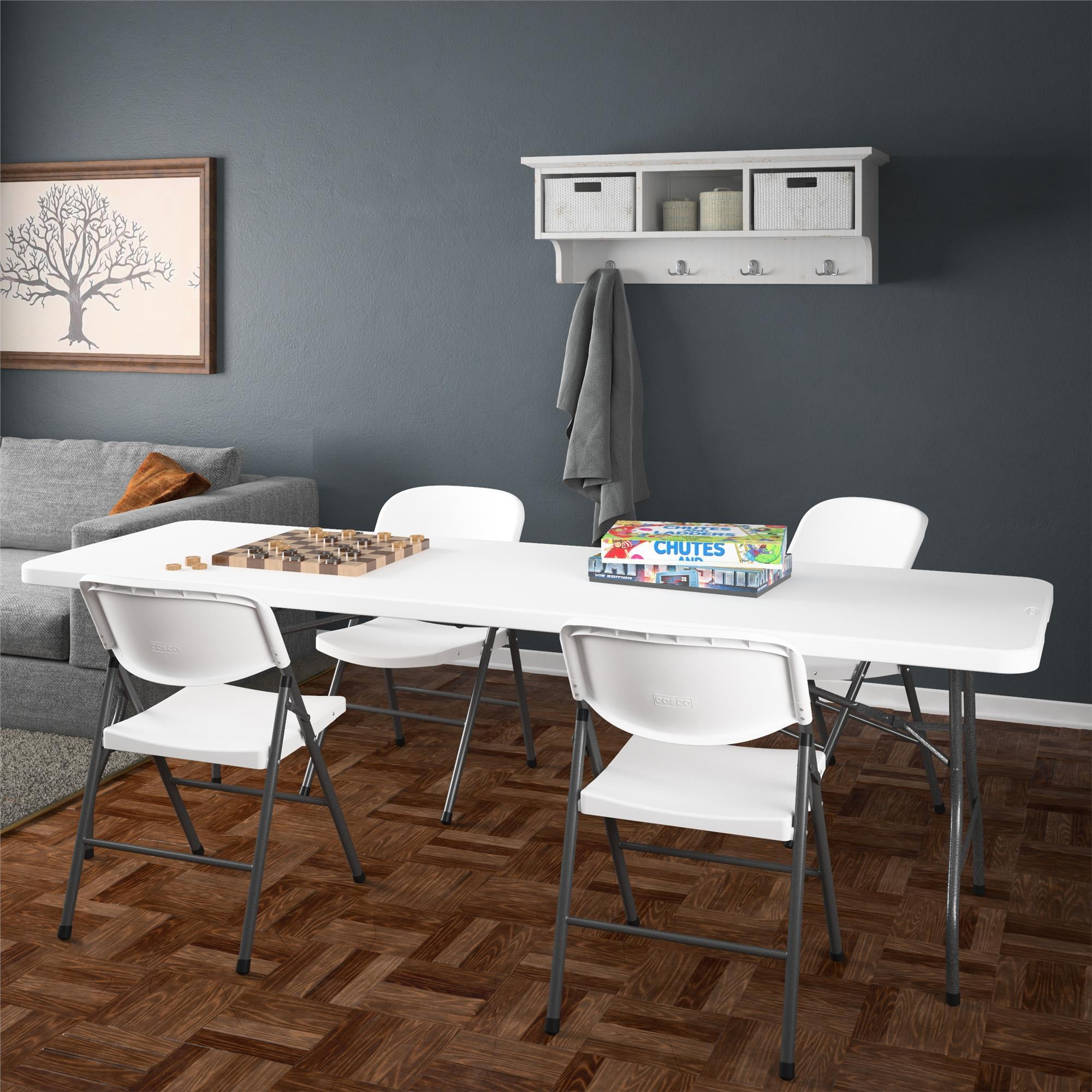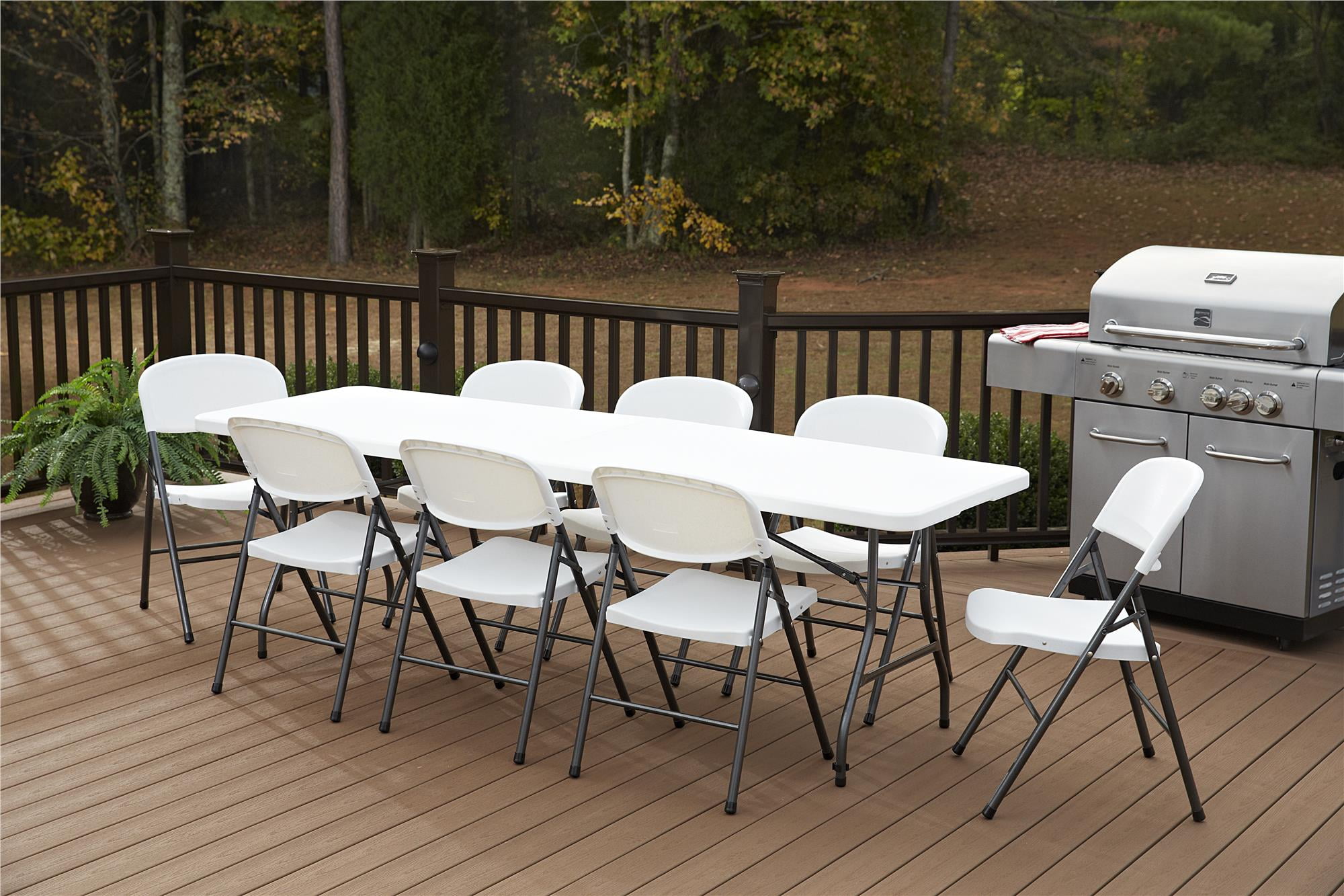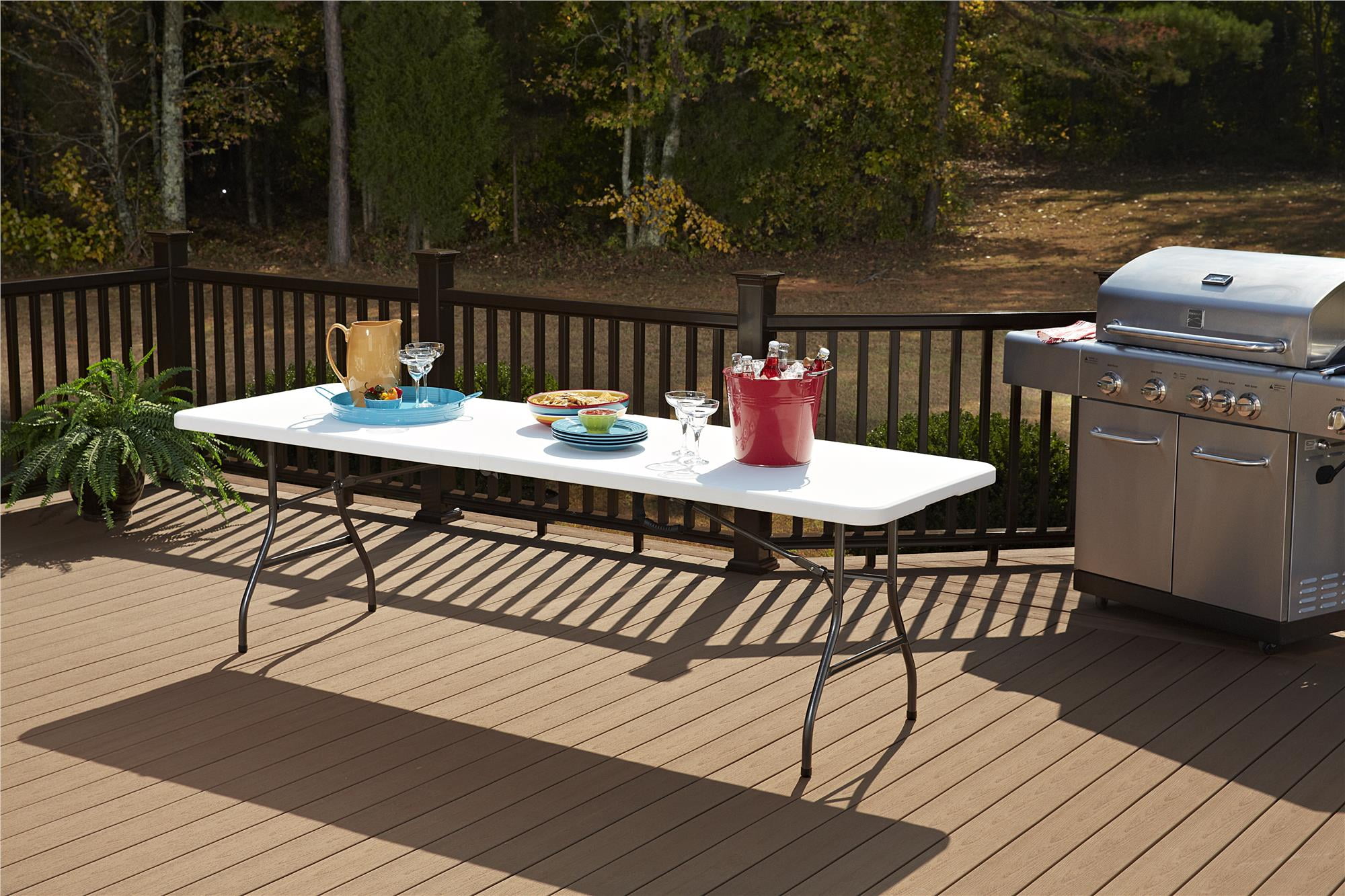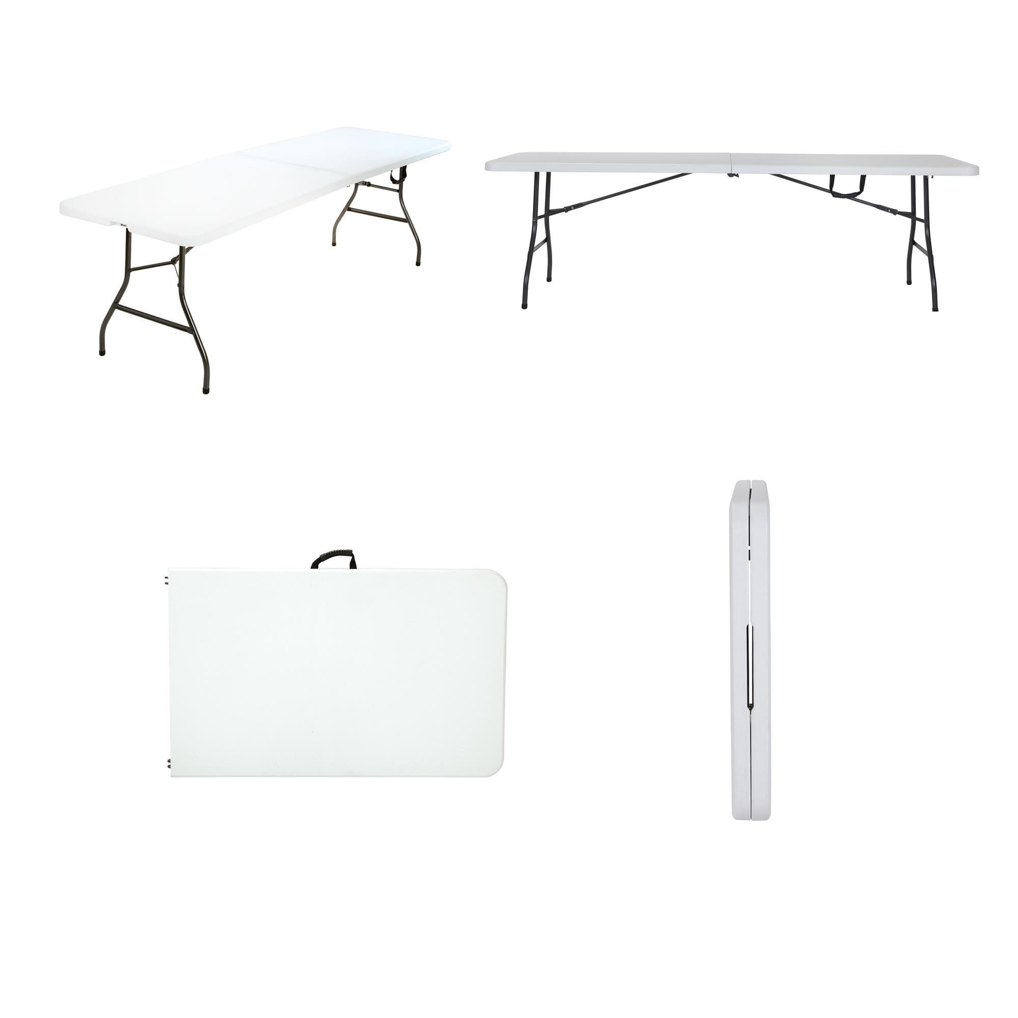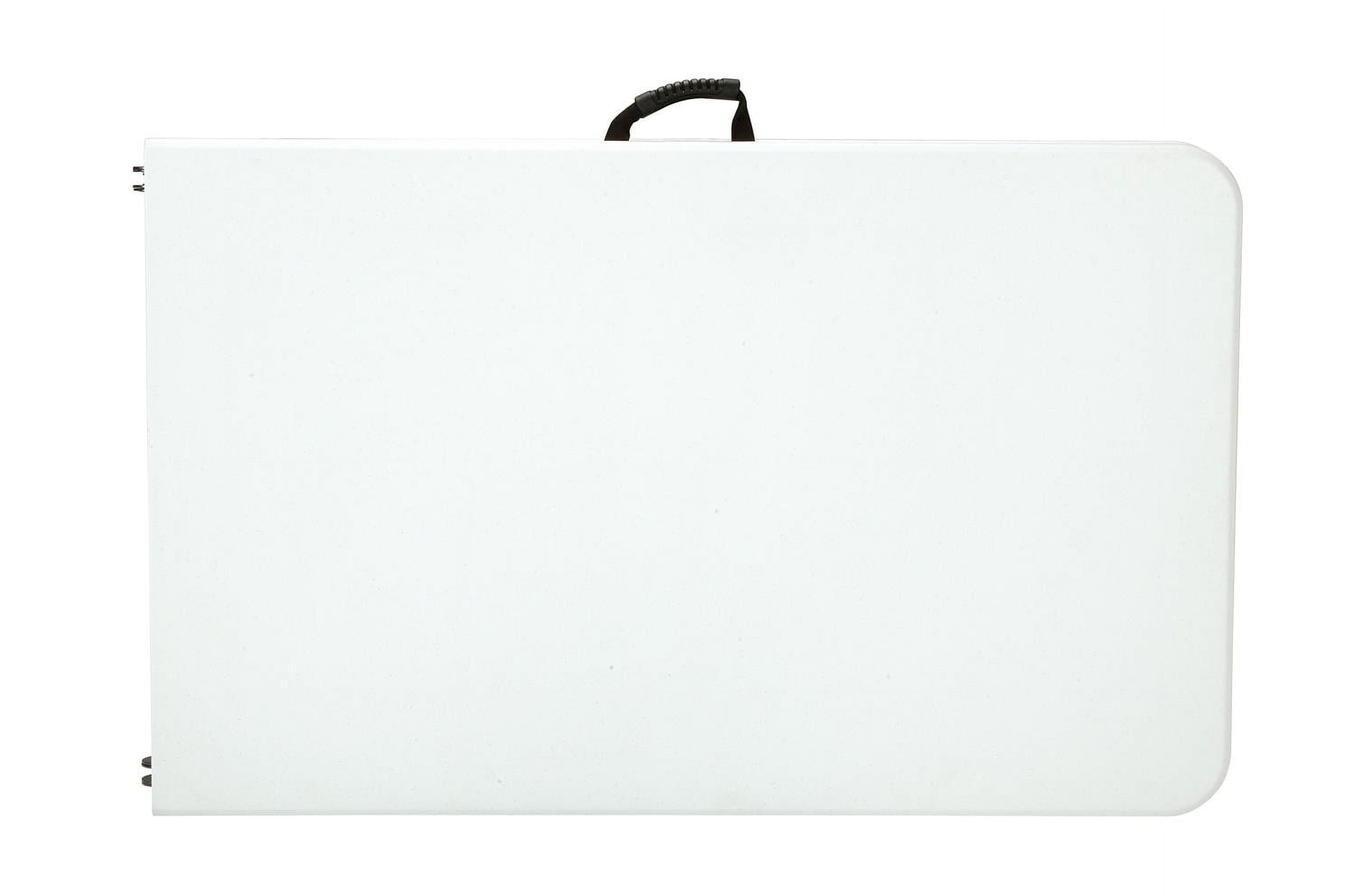 High density polyethylene construction creates an all-season-surface tabletop that can be used indoors or light use outdoors A speckled white table top is low maintenance and easy to clean without having to cover for events Weighing only 37.3 pounds this table is easy to transport to ball games, around the house, or tailgates A center-fold design creates a closed dimension of only 48.23 inches long by 29.5 inches wide, for easy storage A sturdy steel frame provides up to a 300 pound use-rate