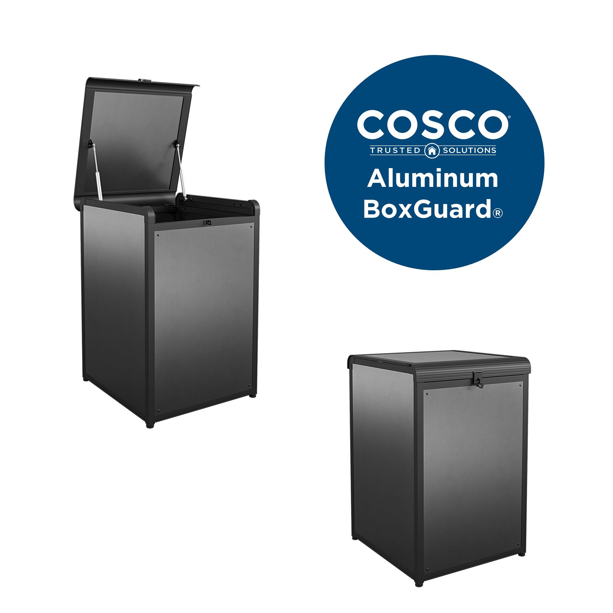 COSCO’s newest BoxGuard(r)? is the trusted solution for security of home deliveries and other practical storage uses. We have listened to our valuable customer feedback and created this new heavy-duty option by changing material from resin to aluminum and adding extra interior space. With the sturdy, lockable, and sizeable BoxGuard(r)?, packages will be out of sight of porch pirates, curious neighbors, and stray pets. Prevent the emotional distress , financial loss of replacement, and lost time associated with porch theft. BoxGuard(r)? is also used for other storage solutions in your backyard- a wide range of outdoor items and garden supplies will comfortably fit. The roof with hydraulic hinges and weather-resistant aluminum material are practical and will keep the contents dry throughout the seasons. It has ample 55 gallon interior space to hold many packages or home goods. The black and dark gray color is stylish and designed to be welcome addition to a front porch or pool deck.