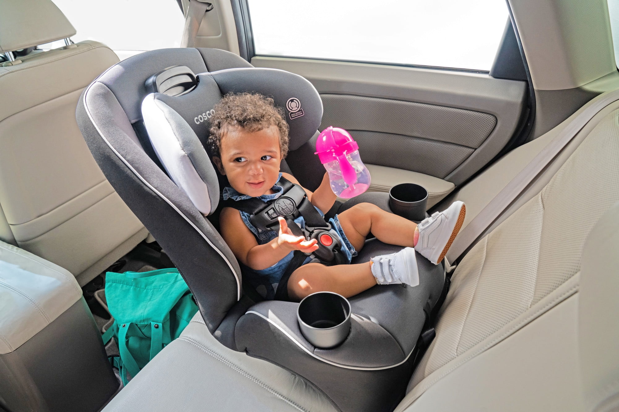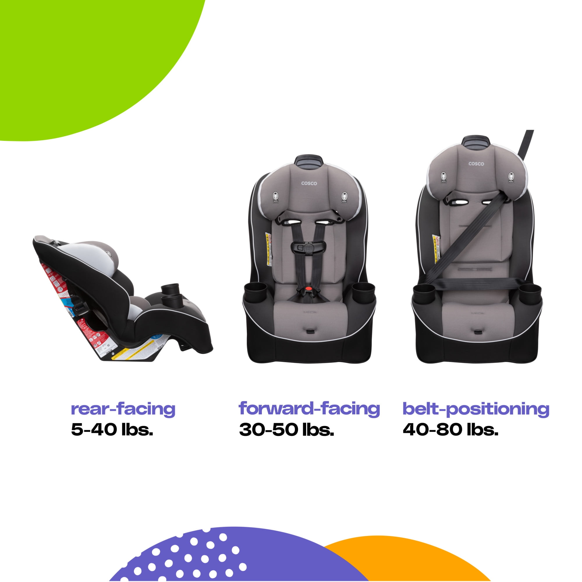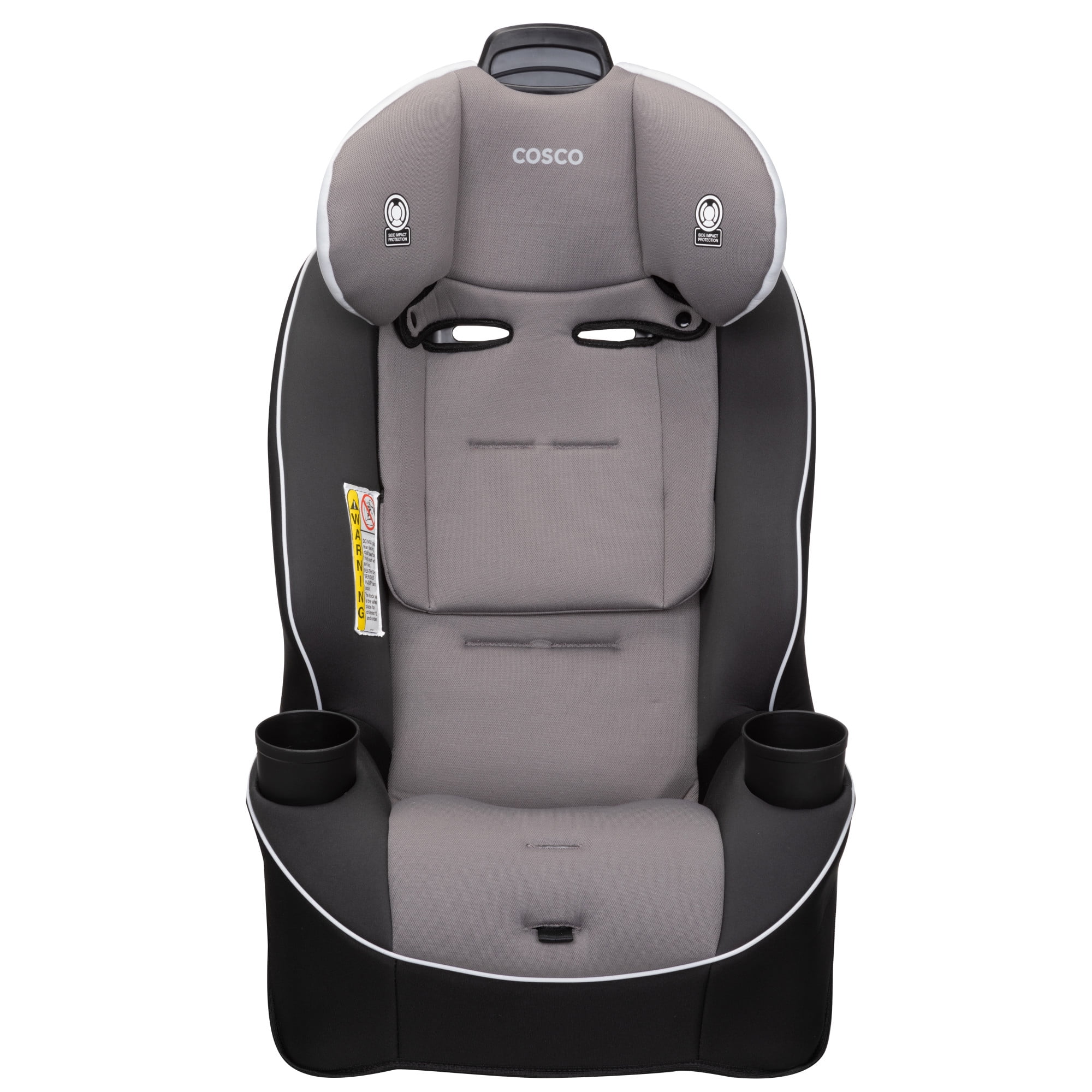Cosco Kids makes choosing the right car seat simple! The Easy Elite All-in-One car seat has your family covered from rear-facing baby to big kid booster with a range of 5-80 pounds. (Rear-facing; 5–40 lbs., Forward-facing; 30–50 lbs., Belt-positioning; 40–80 lbs.) The Easy Elite also adapts to your growing family with the ability to fit three seats across the back of most cars. This all-in-one convertible car seat keeps your child safely in the rear-facing position from 5 to 40 pounds and includes a removable body pillow to give a smaller baby a snug fit. It can also be used in the forward-facing position for kids 30 to 50 pounds. In both rear and forward-facing positions, the easy-to-use headrest and harness adjust quickly and easily with one hand. There’s no need to uninstall the seat or rethread the straps. When your child is ready, remove the harness to easily convert the Easy Elite to a belt-positioning booster for big kids up to 80 pounds. Each stage provides Side Impact Protection to keep your child safer during the ride. The Easy Elite car seat is easy to care for too. With kids in the car, messes happen. Thanks to the easy-to-clean car seat pad, there’s no need to stress. The pad comes in a wide range of styles and colors, all of which remove from the seat and are both machine washable and dryer safe.