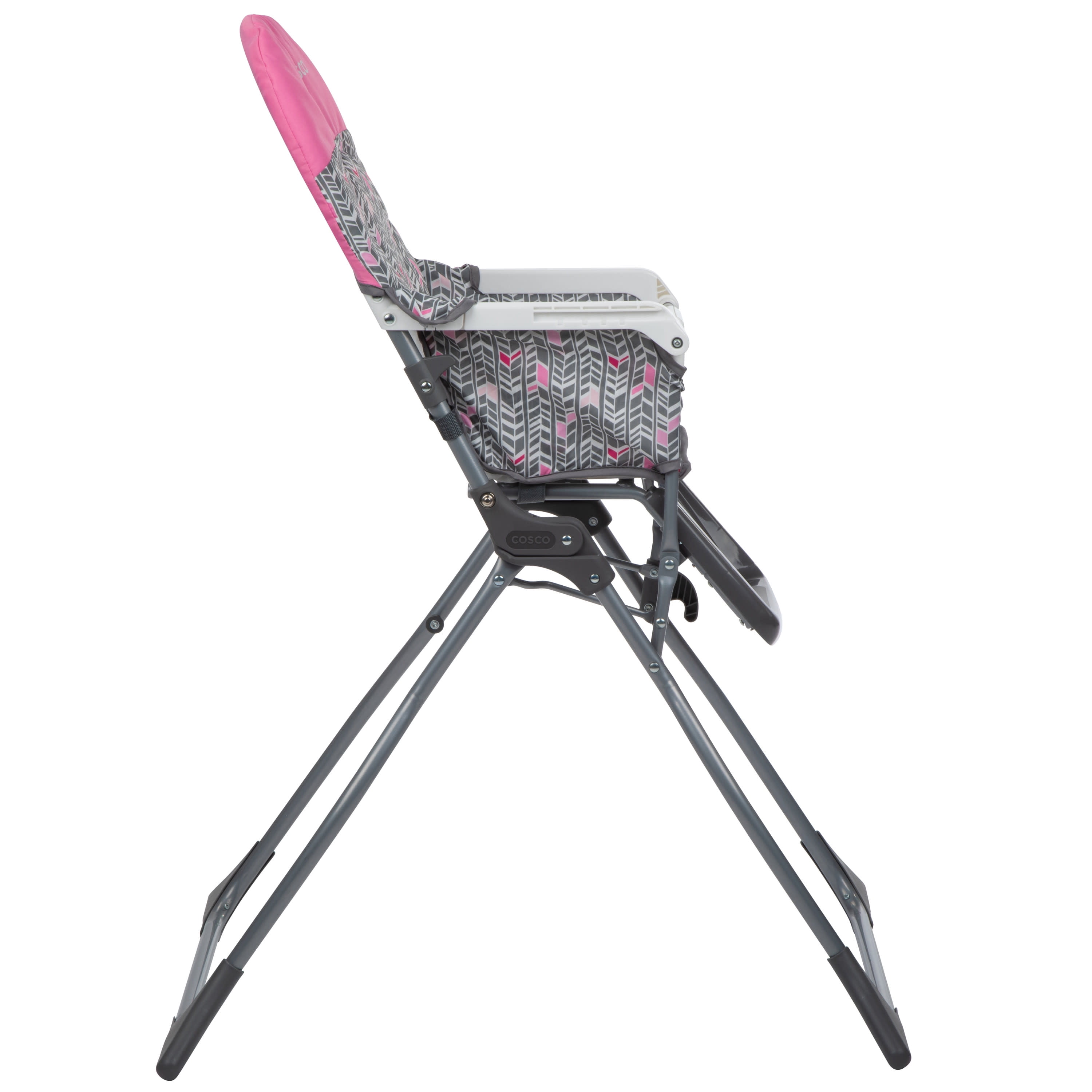 Cosco Kids Simple Fold Full Size High Chair with Adjustable Tray, Lula Easy wipe seat makes all that baby goo simple to clean Folds flat and stands on its own, making it easy to hide away Compact fold great for taking on the go No-nonsense design sets up in just seconds Full size, 3-position adjustable tray with built in cup holder Wipeable seat pad Comfortable leg rest for little feet 3-point harness for security Holds a child from 6 months and up to 50 pounds