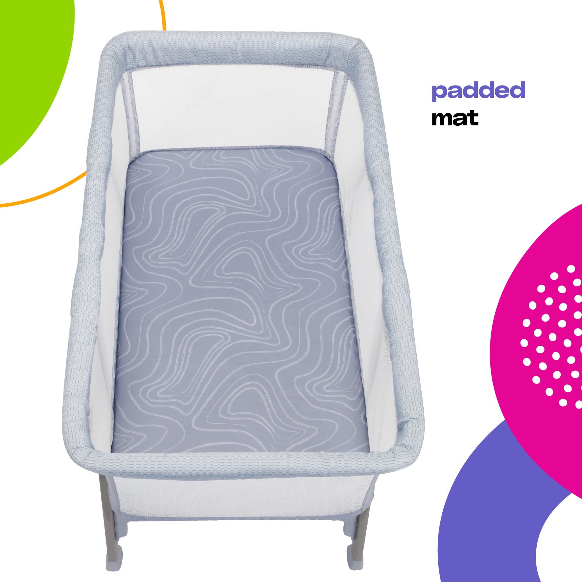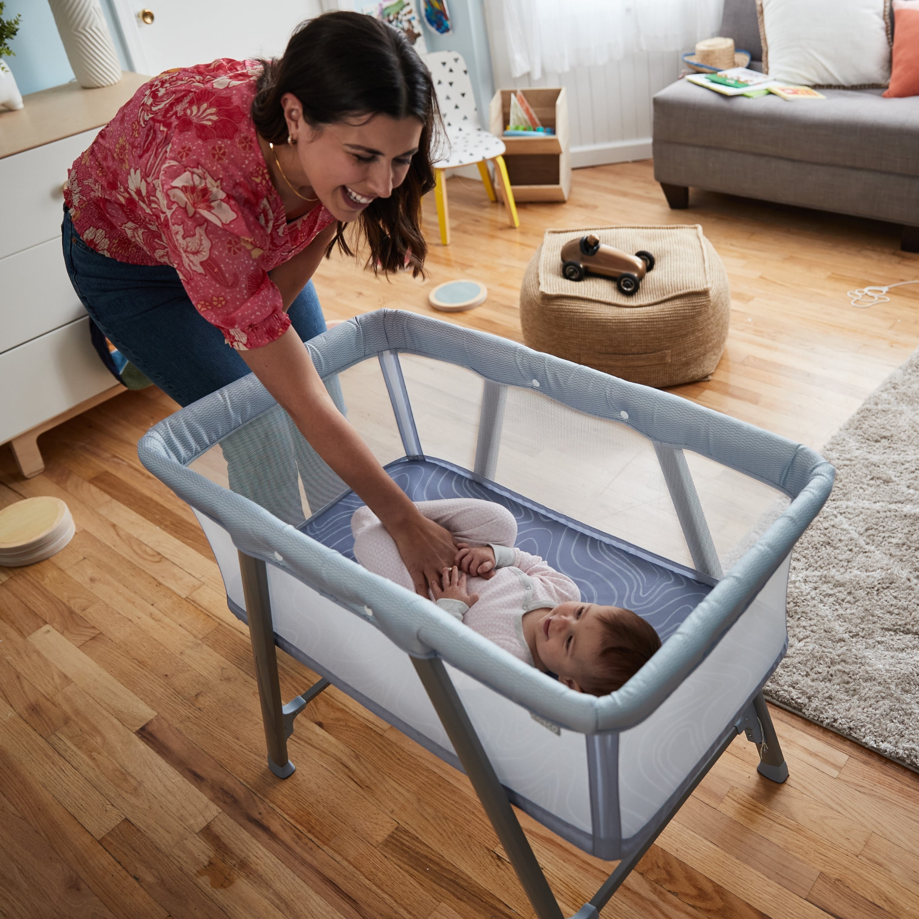 Cosco Kids SleepAway Baby Bassinet, Organic Waves Breathable mesh sides provide increased air flow and keep baby cooler Perfect size to place next to your bed, so you can keep your baby close Padded mat is designed for your baby’s comfortable and restful sleep Lightweight at 14.4 pounds Simple to transport, set up, or move from room to room with ease Color Category: Blue Designed with fabrics made using recycled materials Designed with a firm, flat sleeping surface that meets the Consumer Product Safety Commission’s recommendations for safe sleep