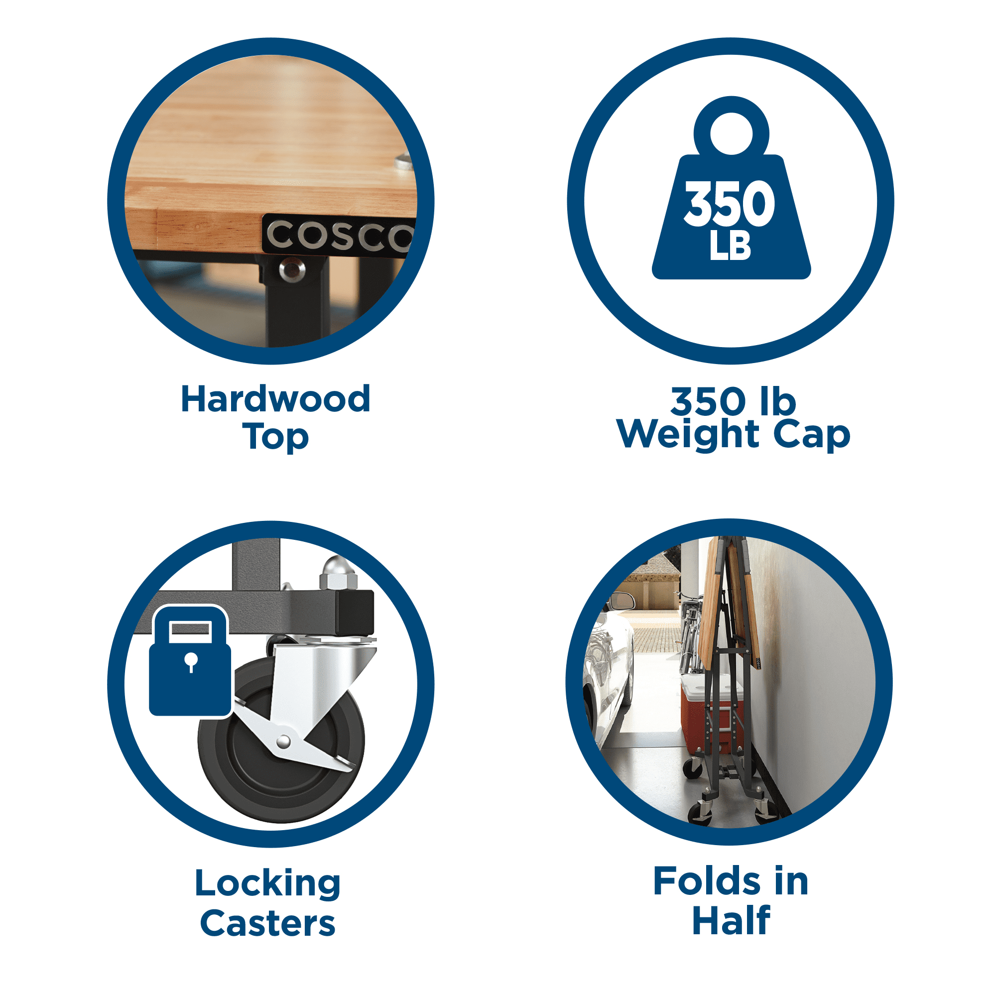 PORTABLE – Take this workbench on wheels anywhere the work is COMPACT – Easily folds in seconds for compact storage and transportation HEAVY DUTY – Made from steel, it has a weight capacity of 400 lbs on the Hardwood top shelf 4 LOCKING CASTERS – 4 locking casters keep it in place while you work
