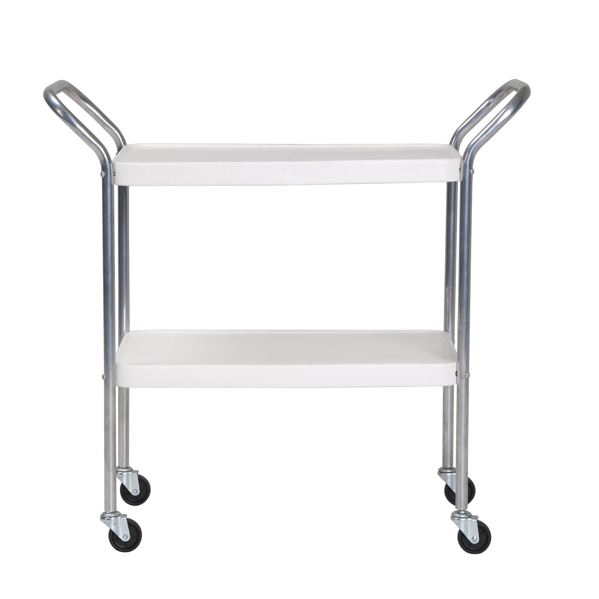 COSCO Stylaire 2 Tier Serving Cart is designed with a retro high gloss silver frame and white shelves to bring back all the nostalgia of your childhood home. The two shelves, sized 15.5″ x 25.25″, have a 25 pound weight capacity per shelf, large and sturdy enough for any need that may arise. The all steel surface and frame make for a quick cleanup for any messes that may occur, big or small, while remaining low maintenance. This cart features two locking caster wheels to lock the cart in place to prevent movement when it’s not needed. The Stylaire serving cart is a great addition to any kitchen, den, or bar for hosting or as a permanent, chic storage area. The Stylaire Collection is NEW from COSCO in celebration of our 80th anniversary. Consisting of modern updates to our classic products, this collection is centered on vintage and retro style, while honoring our roots. The Stylaire Collection has all your home needs offering step stools, chairs, tables and carts creating conversation starters. Join us in keeping the memory of our beginning with our Stylaire Collection.