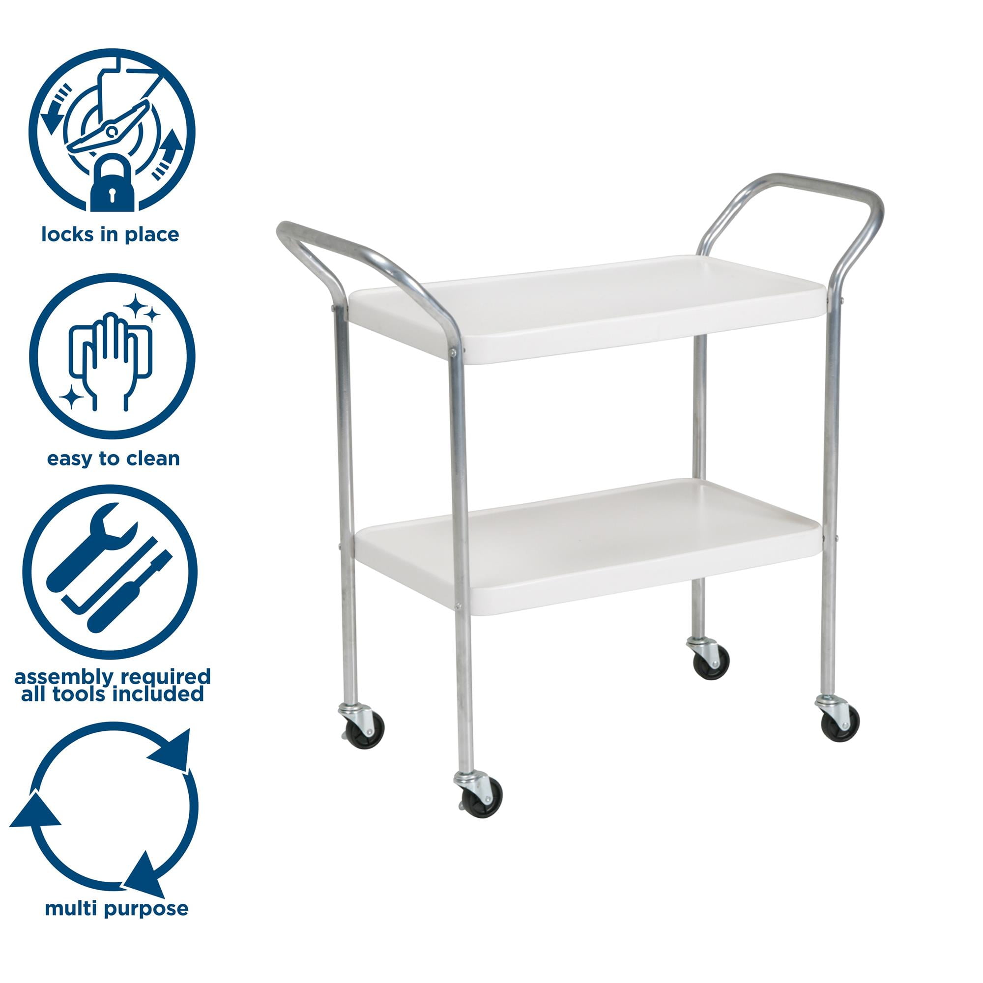 A high gloss silver frames brings back all the nostalgia of your childhood home Two locking caster wheels prevent movement of the cart when it’s not needed All steel construction makes this cart easy to clean, while remaining low maintenance Assembly Required: All tools and parts included