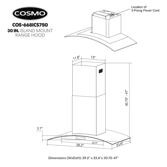 - Common Range Hood Size: 30 inch; Vent Type: Ducted; Brand: Cosmo; Mounting Type: Island Range Hood; Duct Type: 6-in round; Maximum Air Volume (CFM): 380 CFM; Appliance Color/Finish: Stainless Steel; 2 Year Limited Warranty
