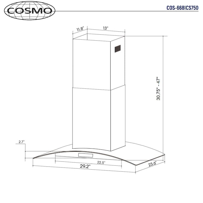 - Common Range Hood Size: 30 inch; Vent Type: Ductless; Brand: Cosmo; Mounting Type: Island Range Hood; Duct Type: 6-in round; Maximum Air Volume (CFM): 380 CFM; Appliance Color/Finish: Stainless Steel; 2 Year Limited Warranty