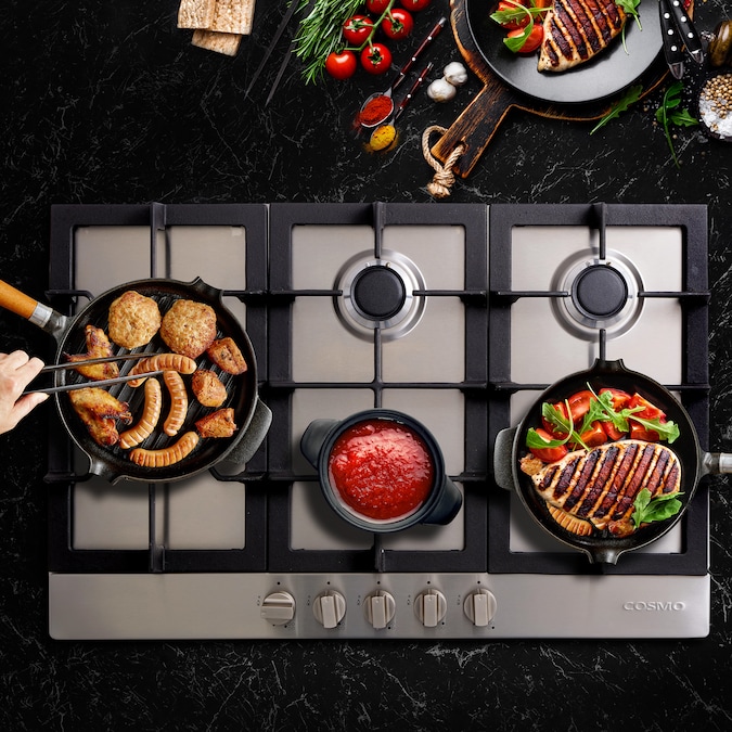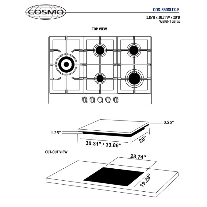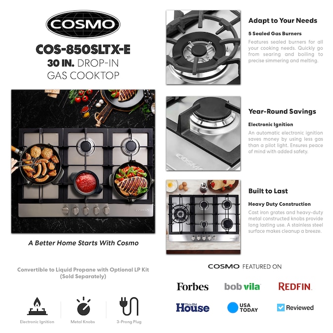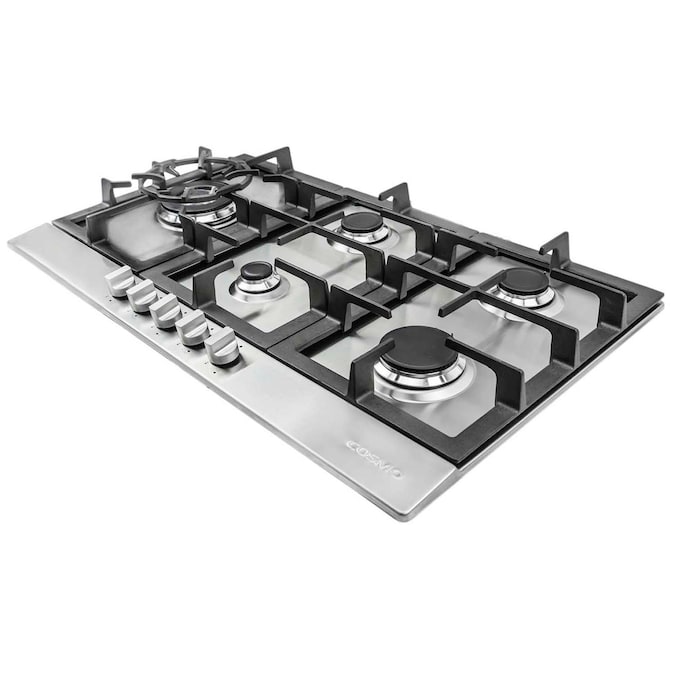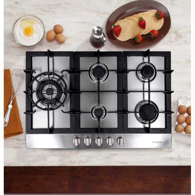 Cosmo brings you professional style and performance at home with this 30 inch drop in gas cooktop. 5 Sealed gas burners ranging from 5,000 BTU to 16,000 BTU give you the precise control demanded by serious cooks. With a stainless steel finish, heavy duty cast iron grates, and durable metal knobs, this cooktop will continue to look and perform great for years to come. A 3 prong, 120V power cord is included for ease of installation.