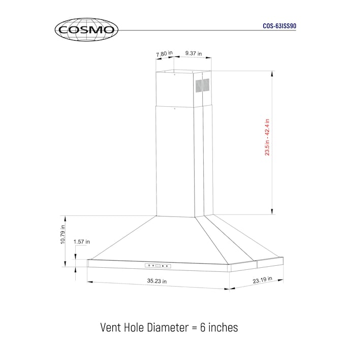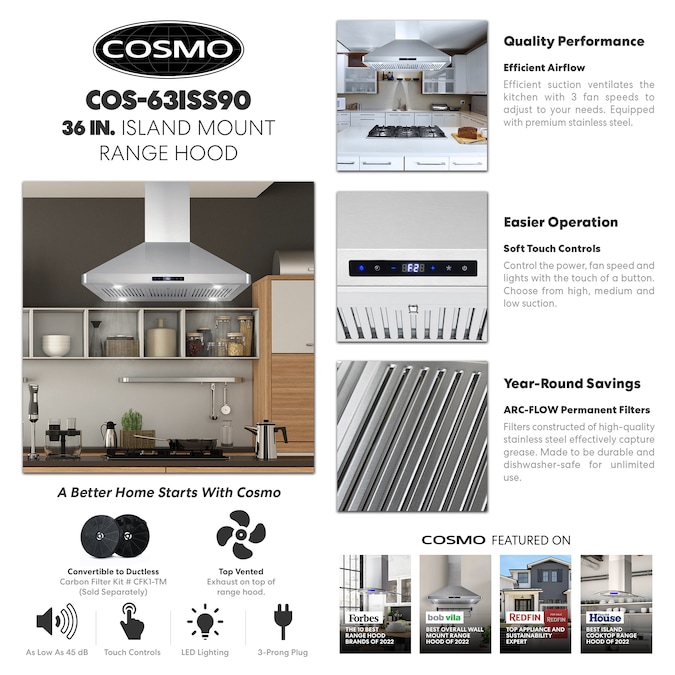 • Common Range Hood Size: 36 inch; Vent Type: Ducted; Brand: Cosmo; Mounting Type: Island Range Hood; Duct Type: 6-in round; Maximum Air Volume (CFM): 380 CFM; Appliance Color/Finish: Stainless Steel