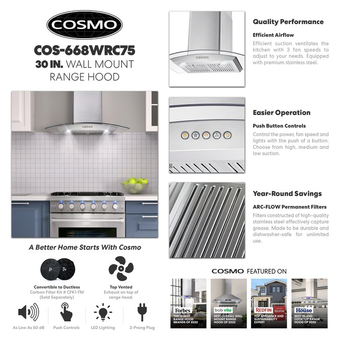 - Common Range Hood Size: 36 inch; Vent Type: Ducted; Brand: Cosmo; Mounting Type: Wall-Mounted Range Hood; Duct Type: 6-in round; Maximum Air Volume (CFM): 380 CFM; Appliance Color/Finish: Stainless Steel; 2 Year Limited Warranty