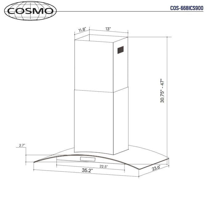 - Common Range Hood Size: 36 inch; Vent Type: Ductless; Brand: Cosmo; Mounting Type: Island Range Hood; Duct Type: 6-in round; Maximum Air Volume (CFM): 380 CFM; Appliance Color/Finish: Stainless Steel; 2 Year Limited Warranty