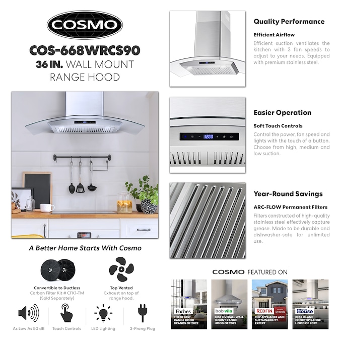 - Common Range Hood Size: 36 inch; Vent Type: Ducted; Brand: Cosmo; Mounting Type: Wall-Mounted Range Hood; Duct Type: 6-in round; Maximum Air Volume (CFM): 380 CFM; Appliance Color/Finish: Stainless Steel, 2 Year Limited Warranty
