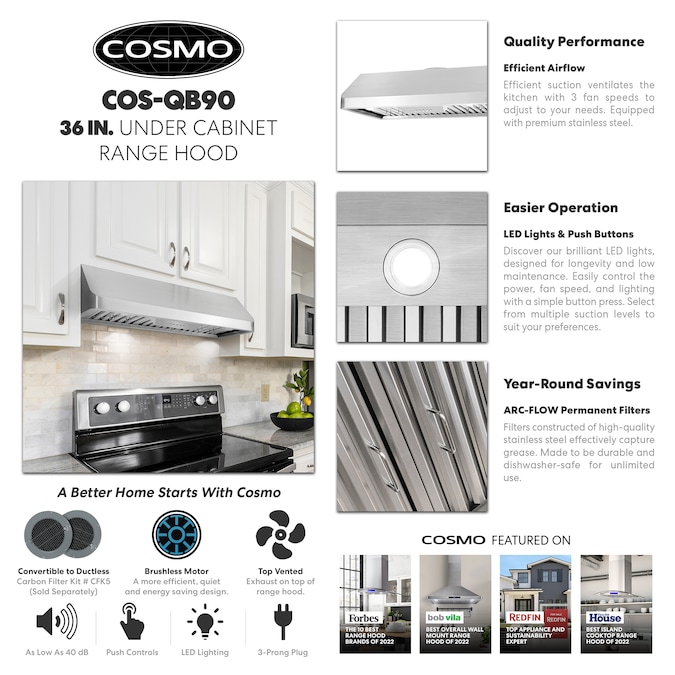 Cosmo presents a professional caliber under cabinet range hood that adds bold, distinct flair to your kitchen. This 36 inch range hood fits easily into an existing cabinet, and has premium brushed stainless steel that matches seamlessly with existing kitchen appliances for a modern upscale look. Our under cabinet range hood vents from the top and features 500 CFM high-efficiency motors with premium stainless steel baffle filters to trap grease and oil. This 36 inch under cabinet range hood is both energy efficient and quiet, utilizing bright white LED lighting for year-round cost savings. Our permanent filters will save you money year after year and are dishwasher-safe for added convenience. Under cabinet range hood comes configured for ducted use, range hood can be converted to ductless/recirculating with purchase of carbon filter kit (part # CFK5) Trust Cosmo for premium quality kitchen appliances at factory direct prices.