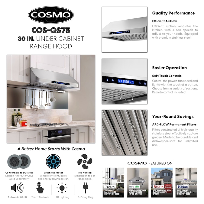 Cosmo presents a modern professional under cabinet range hood perfect for homeowners and builders with limited space. Fits easily into an existing cabinet, has premium brushed stainless steel that matches seamlessly with existing kitchen appliances for a modern upscale look. Our 30 in. under cabinet range hood features a 500 CFM high-efficiency motor with premium stainless steel baffle filters to trap grease and oil. Newly designed, this under cabinet range hood is both energy efficient and quiet, utilizing high lumen LED lighting for year-round cost savings. Our filters save you money year after year and are dishwasher-safe for added convenience. Trust Cosmo for your next kitchen appliance for premium quality at factory direct prices. Includes 3-prong power plug for easy use.