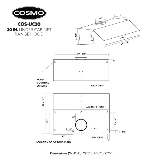 Made with professional styling, Cosmo’s under cabinet range hood has a modern and minimalist design. 3 Fan speeds, up to 380 CFM is available at your fingertips for efficient kitchen ventilation. Energy efficient LEDs can be enabled with the simple push-button controls. Clean up is a breeze with easily removable, permanent, dishwasher safe stainless steel filters. A 110V 3-prong power cord is included for easy installation. Cosmo appliances put professional quality in your home for factory direct prices.