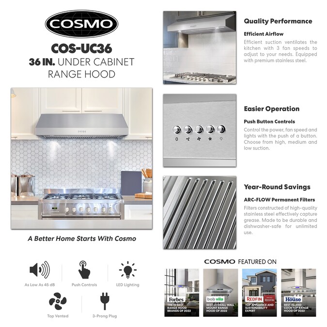Made with professional styling, Cosmo’s under cabinet range hood has a modern and minimalist design. 3 Fan speeds, up to 380 CFM is available at your fingertips for efficient kitchen ventilation. Energy efficient LEDs can be enabled with the simple push-button controls. Clean up is a breeze with easily removable, permanent, dishwasher safe stainless steel filters. A 110V 3-prong power cord is included for easy installation. Cosmo appliances put professional quality in your home for factory direct prices.
