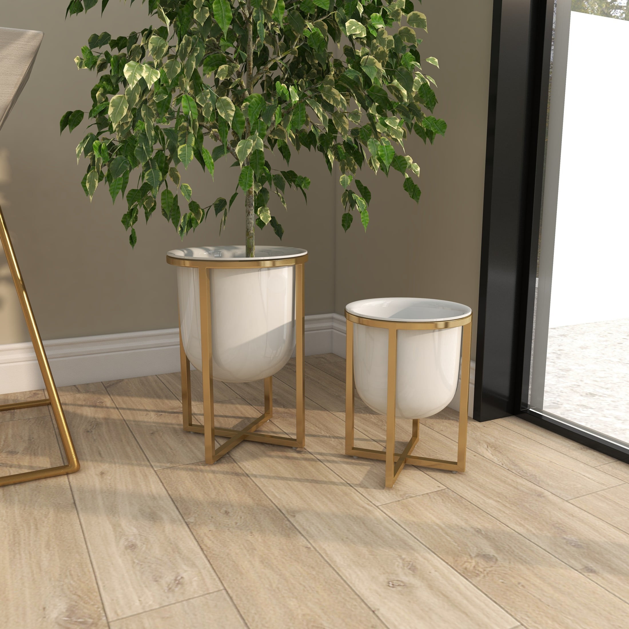 CosmoLiving by Cosmopolitan White Metal Dome Indoor Outdoor Planter with Gold X-Shaped Stands, Set of 2 12″, 10″H