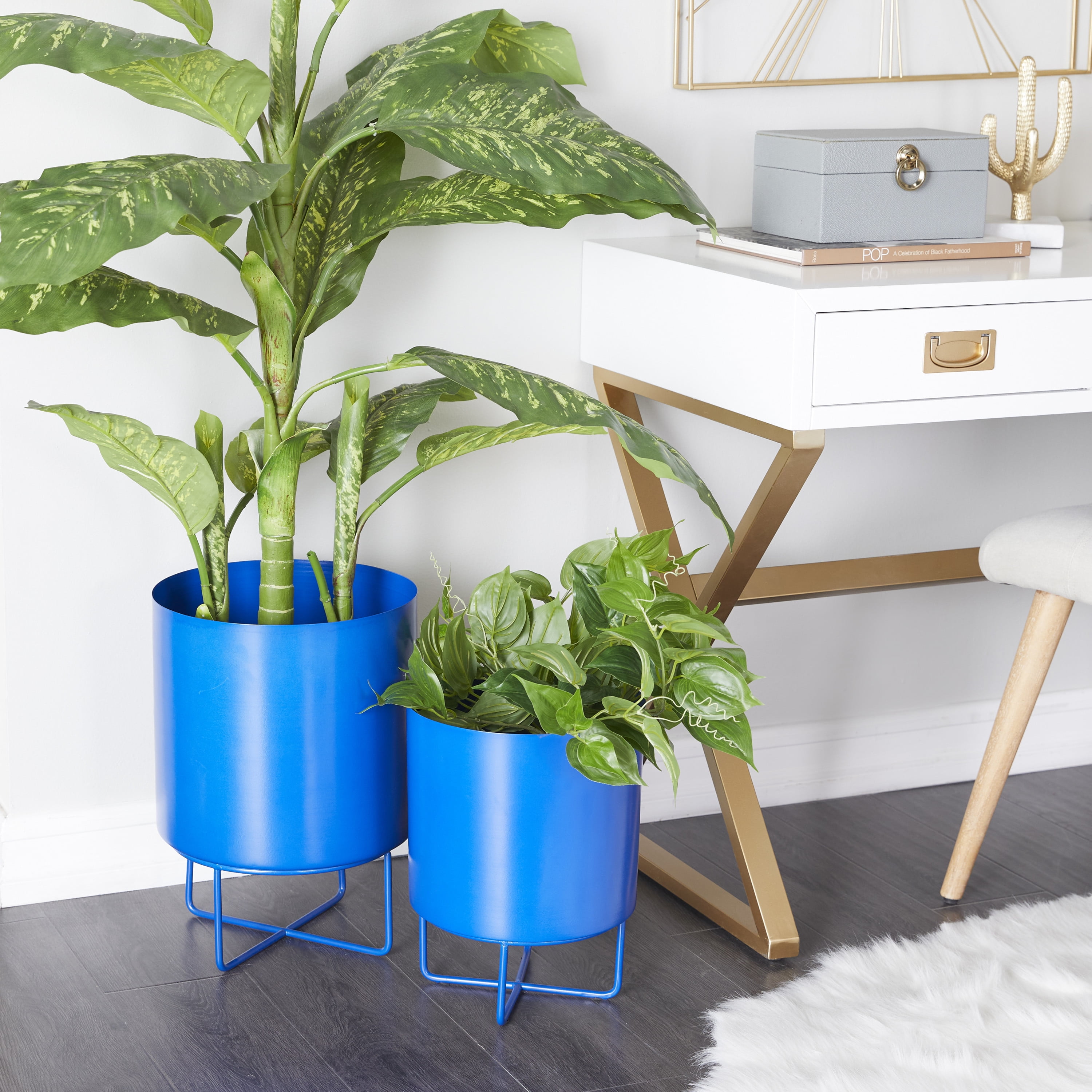 Inspired by sleek elegance and clean lines, a minimalistic design offers effortless luxury with monochromatic tones and bold, angular structures Garden planters with stands are crafted from solid iron for a sleek and durable structure Overall satin blue finish gives a chic look to these modern metal planters with stands Modern blue planters are mounted on X-shaped base stands, creating an elevated display for your indoor or outdoor garden plants Each planter measures 11.95L x 11.65W x 16.35H , 10.10L x 10W x 13.20H inches, and collectively weighs 9.28 lbs The modern design of these metal garden planters accentuate rounded cylindrical bodies with X-shaped base stands Wipe clean with a dry cloth Round metal planters are attached to X-shaped metal stands with base protectors, for a sturdy display Modern style CosmoLiving by Cosmopolitan 16″, 13″H Blue Metal Planter (2 Count) makes a perfect addition to any home