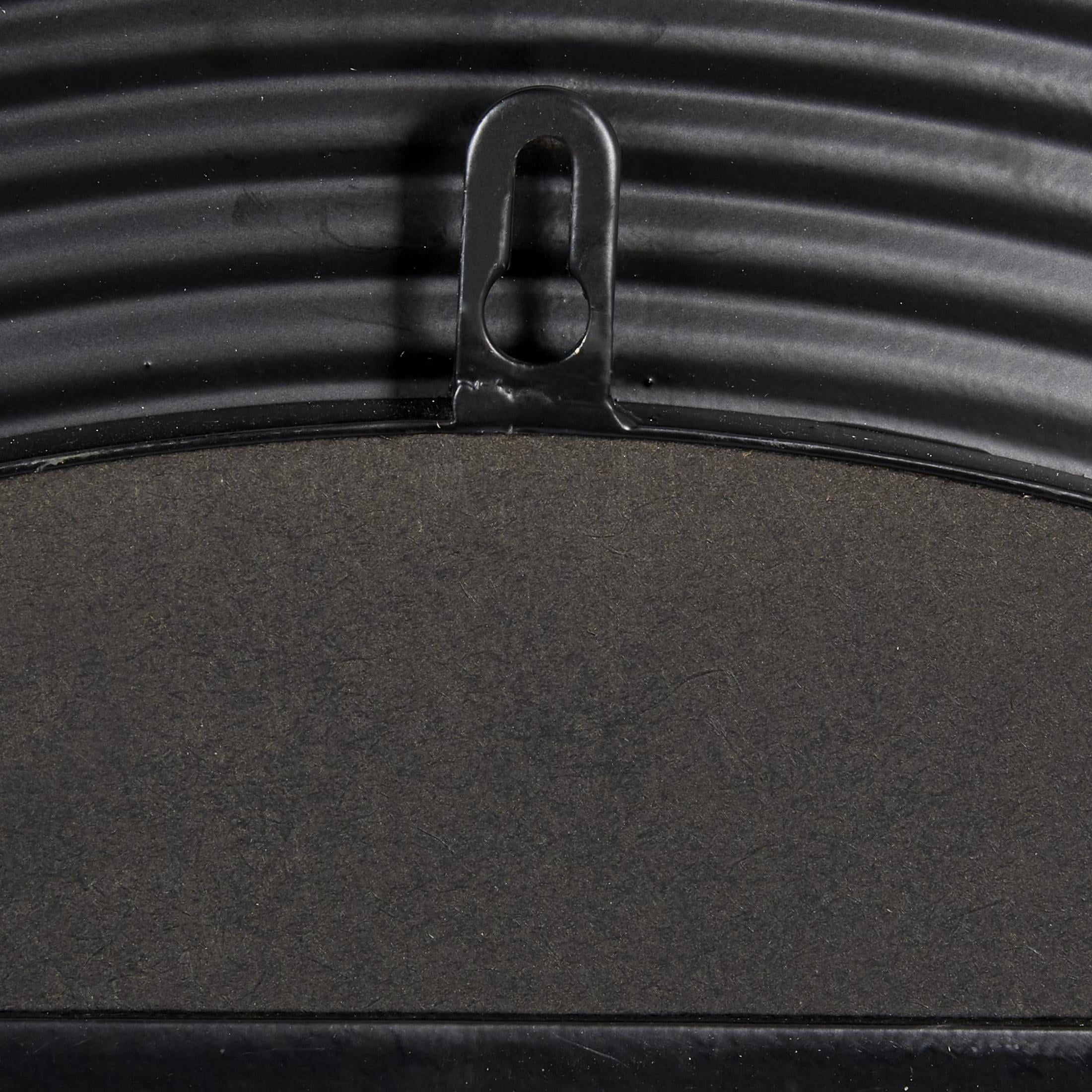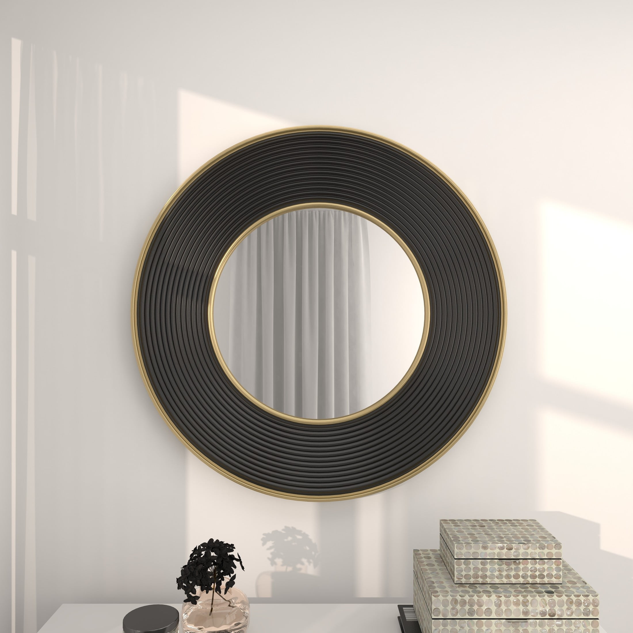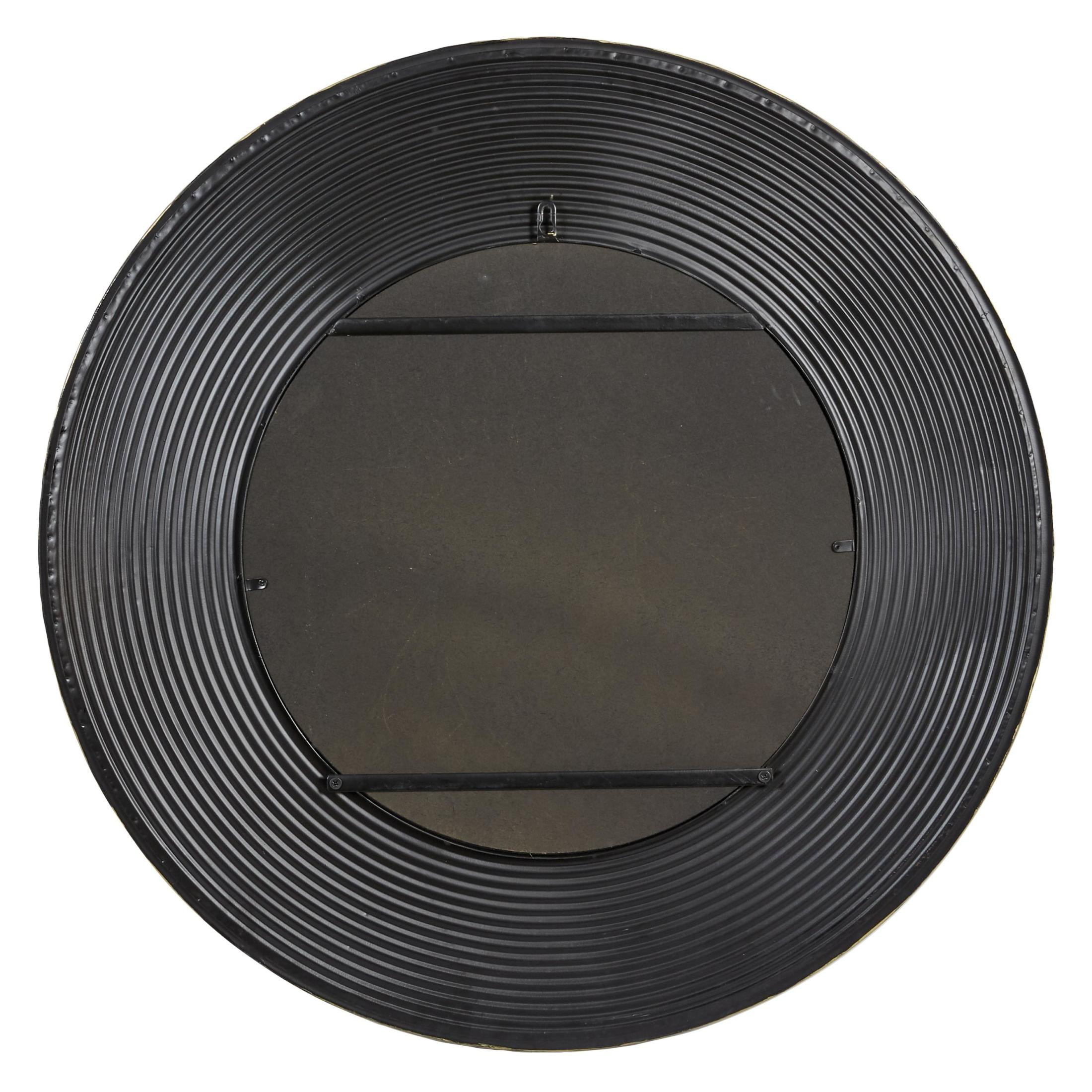 Inspired by sleek elegance and clean lines, a minimalistic design offers effortless luxury with monochromatic tones and bold, angular structures The black room wall mirror is made of solid mirror, iron, and red pine wood The round hanging wall mirror carries a matte black frame with a gold outline This metal wall mirror features a ribbed metal frame that is tapered on its edge The black metal wall mirror measures 35.0L x 1.5W x 35.0H inches, and weighs 14.0 lbs The matte black mirror for wall carries a ribbed frame with a solid black pattern and a gold outline Wipe clean with a dry cloth The modern accent wall mirror has welded iron frame that encloses the mirror, with an MDF backing for stability Modern style CosmoLiving by Cosmopolitan 35″ x 35″ Black Ribbed Wall Mirror with Gold Edges makes a perfect addition to any home