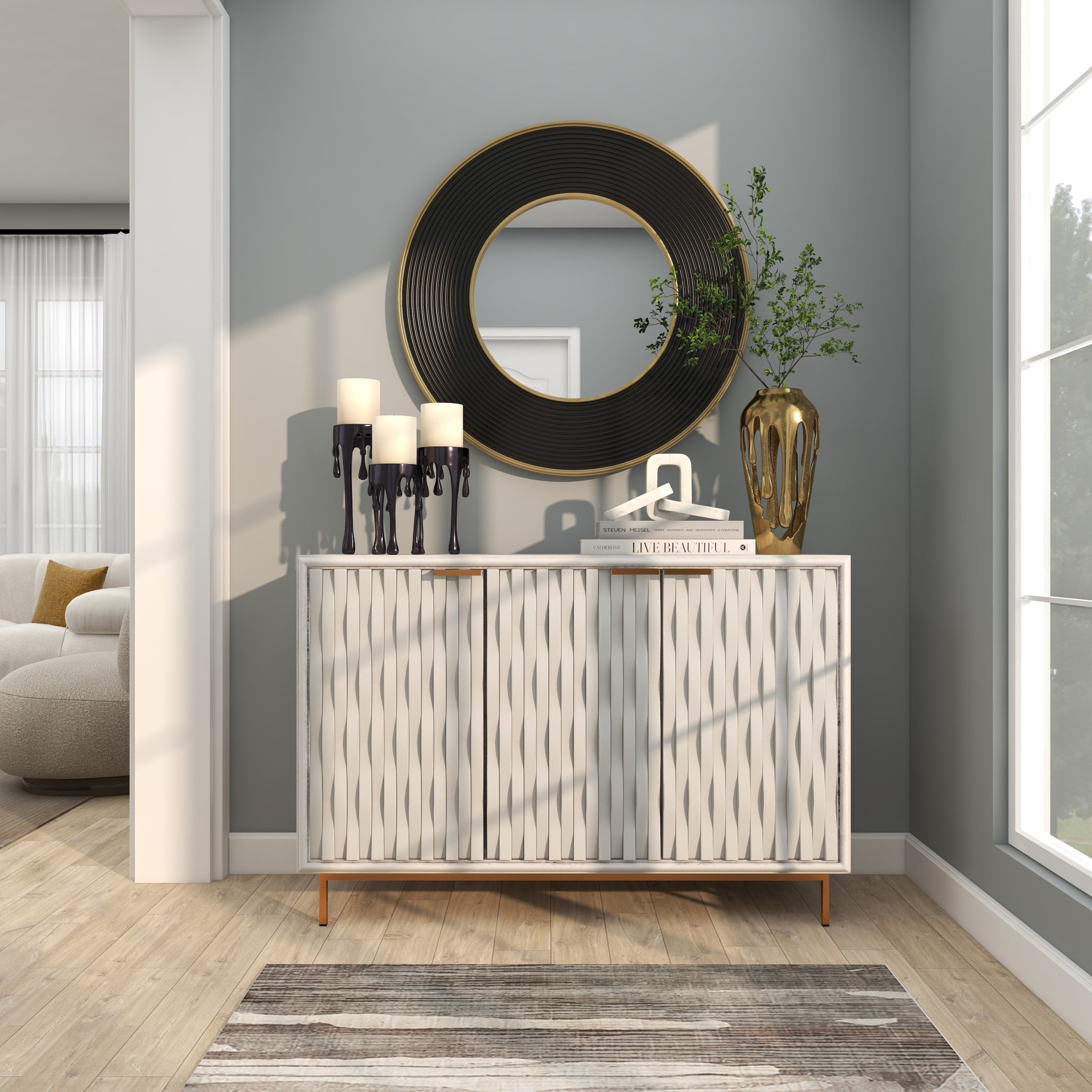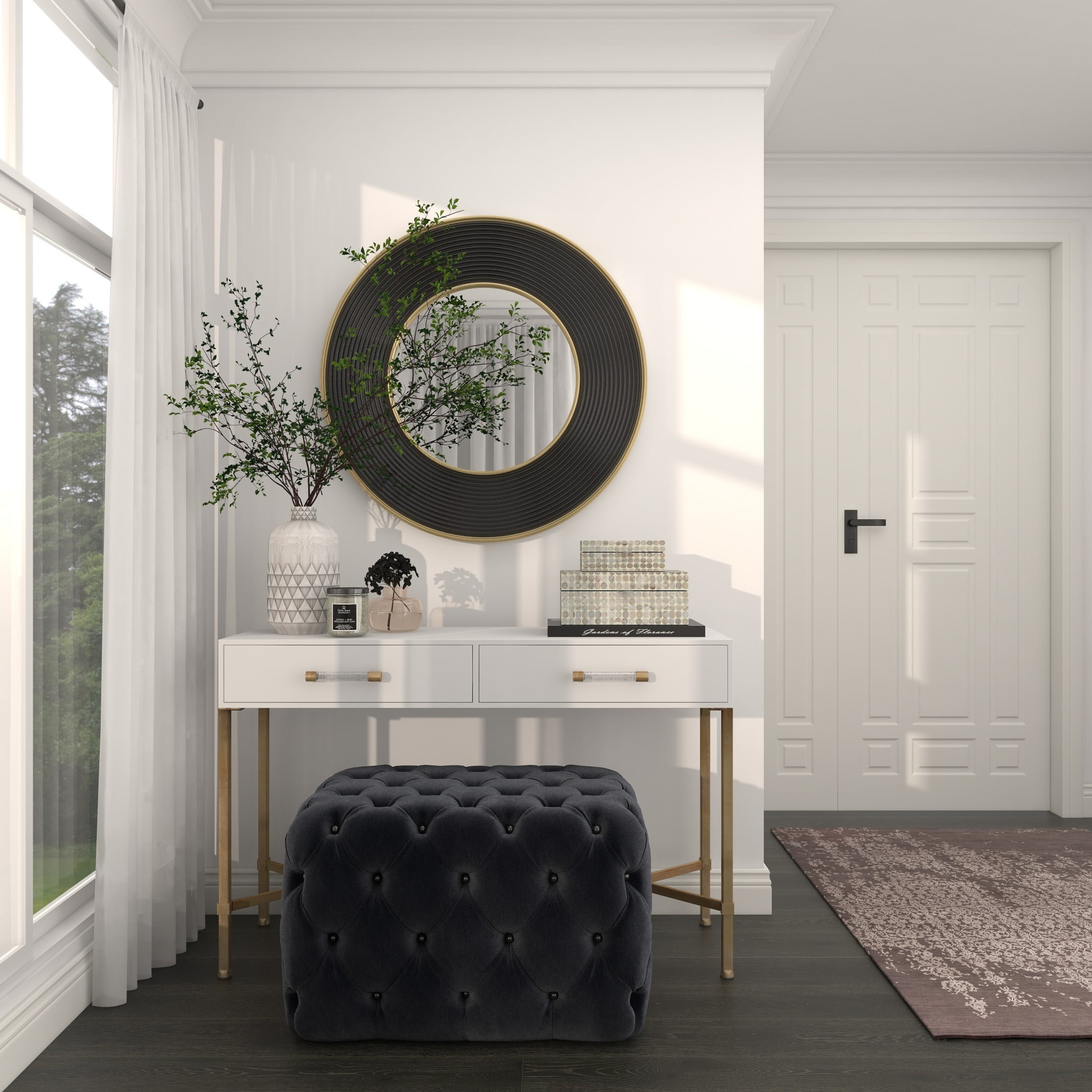 CosmoLiving by Cosmopolitan 35″ x 35″ Black Ribbed Wall Mirror with Gold Edges is a unique addition to your stylish home. Hang the black entryway mirror alone on a plain walled living room or bedroom. This item ships in 1 carton. Can be hung vertically using the keyholes; nails and screws not included. Suitable for indoor use only. This item ships fully assembled in one piece. This is a single black colored entryway mirror. Modern style.