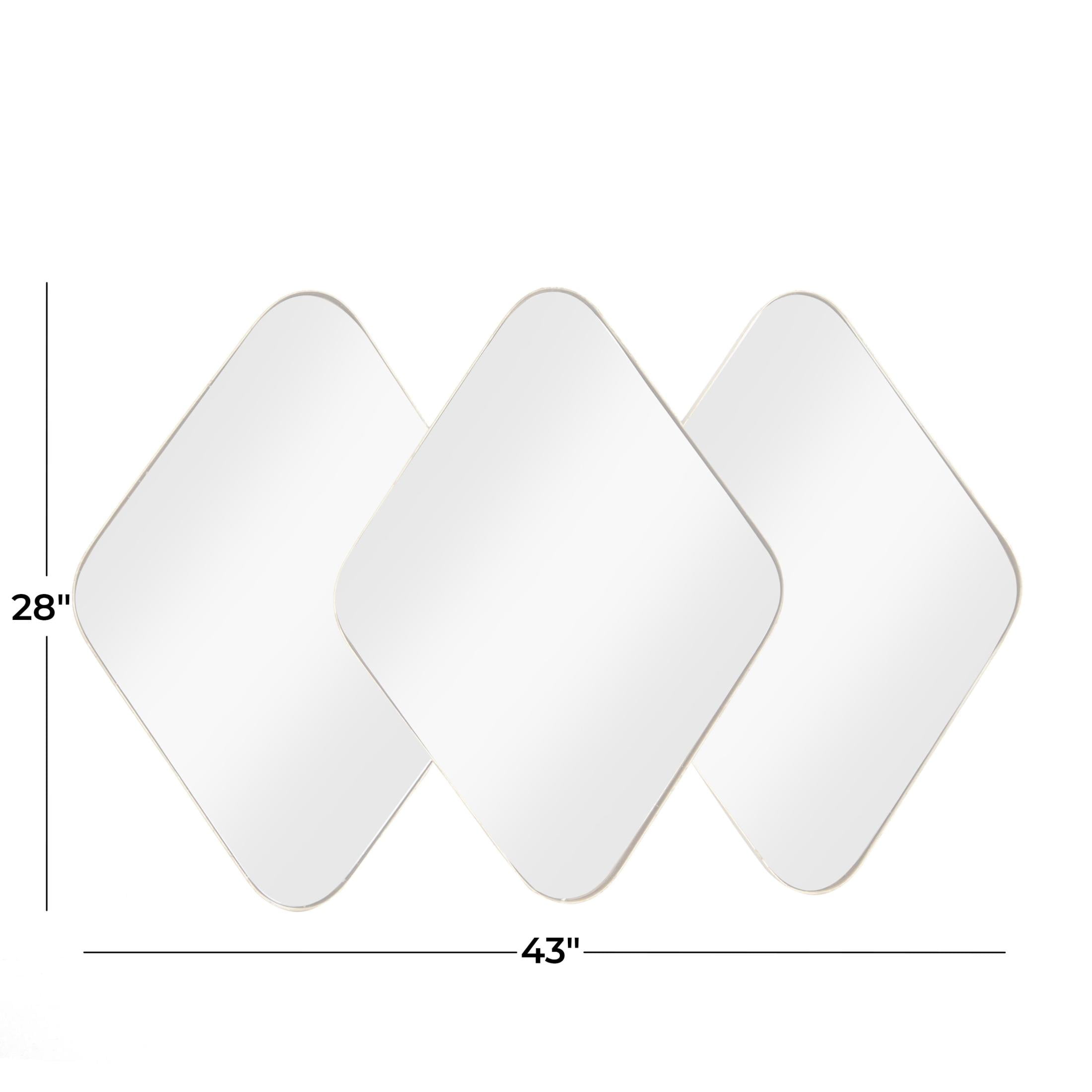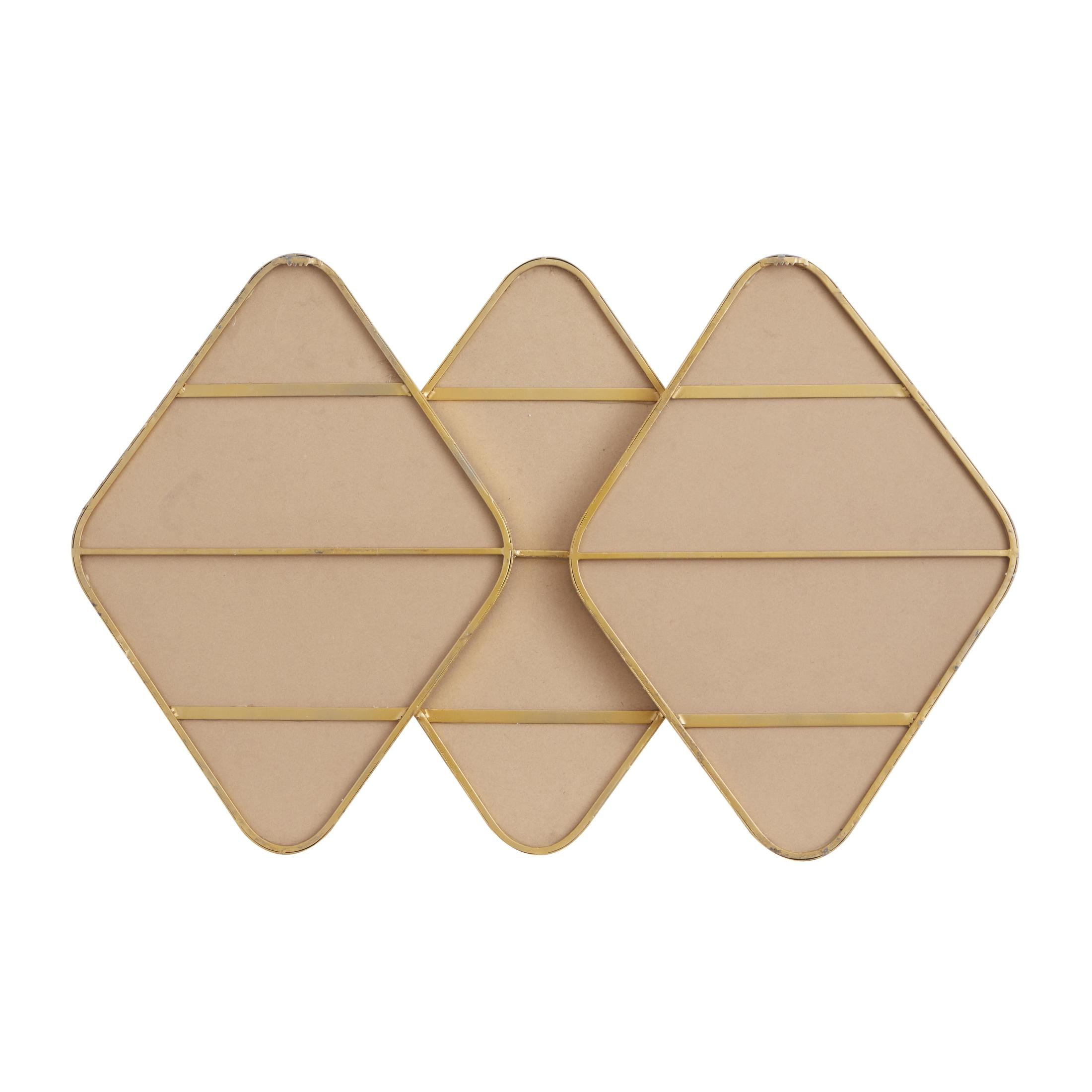 Embrace artistic expression with a style that highlights bold designs with sleek lines, neutral elements, and a minimalist aesthetic This gold room wall mirror is crafted with metal and glass mirror for a durable form with an MDF backing This cluster hanging wall mirror highlights projected frames with a satin metallic gold finish Sleek and thin metal forms the frame of this iron wall mirror that adds depth and texture to any home decor The gold metal wall mirror measures 43L x 2.50W x 27.50H inches, and weighs 26 lbs This satin gold mirror for wall accentuates a collage of three diamond-shaped frames Wipe clean with a dry cloth Welded metal frames enclose the mirror to form a collage in this contemporary accent wall mirror Contemporary style CosmoLiving by Cosmopolitan 43″ x 28″ Gold Overlapping Diamond Wall Mirror with Gold Frame makes a perfect addition to any home