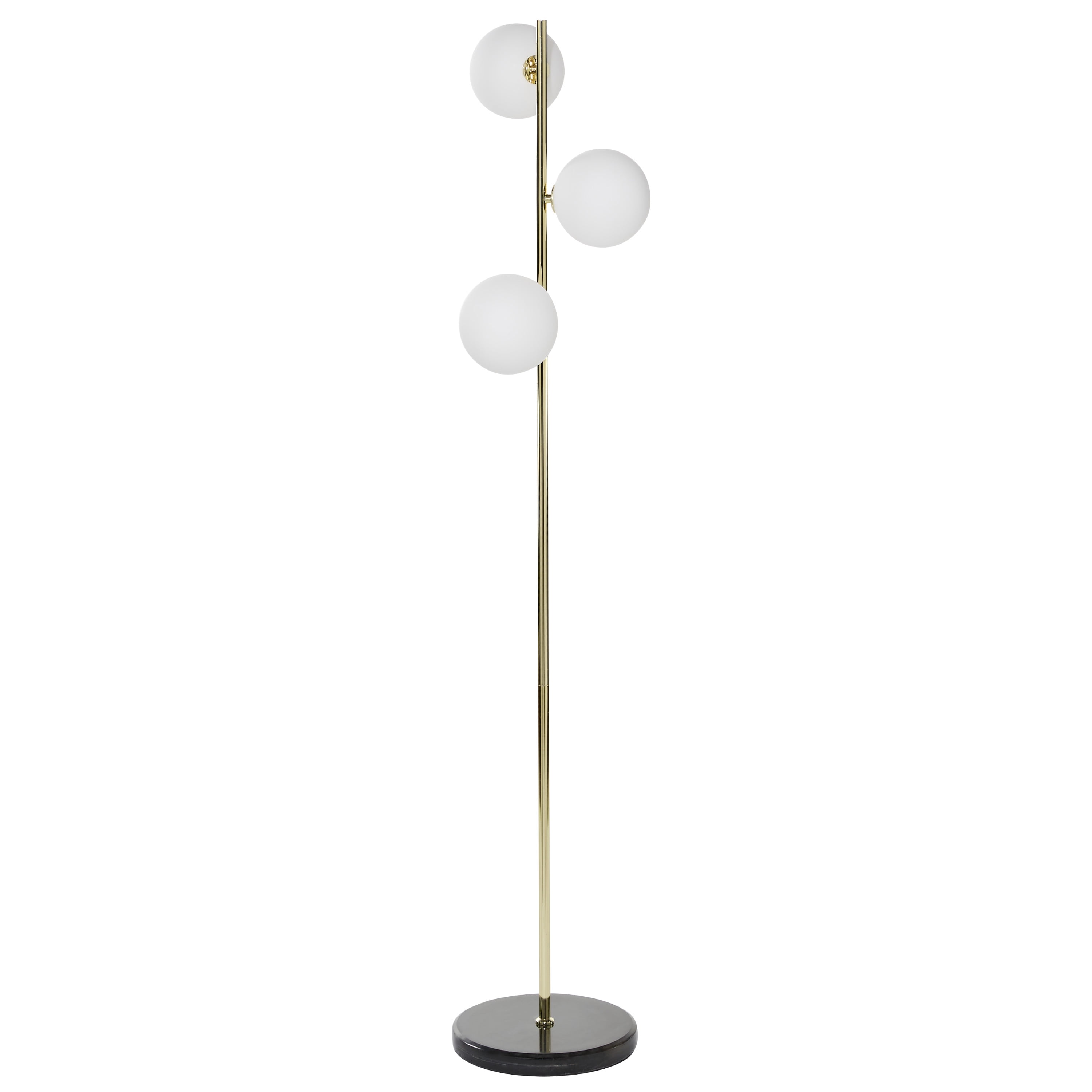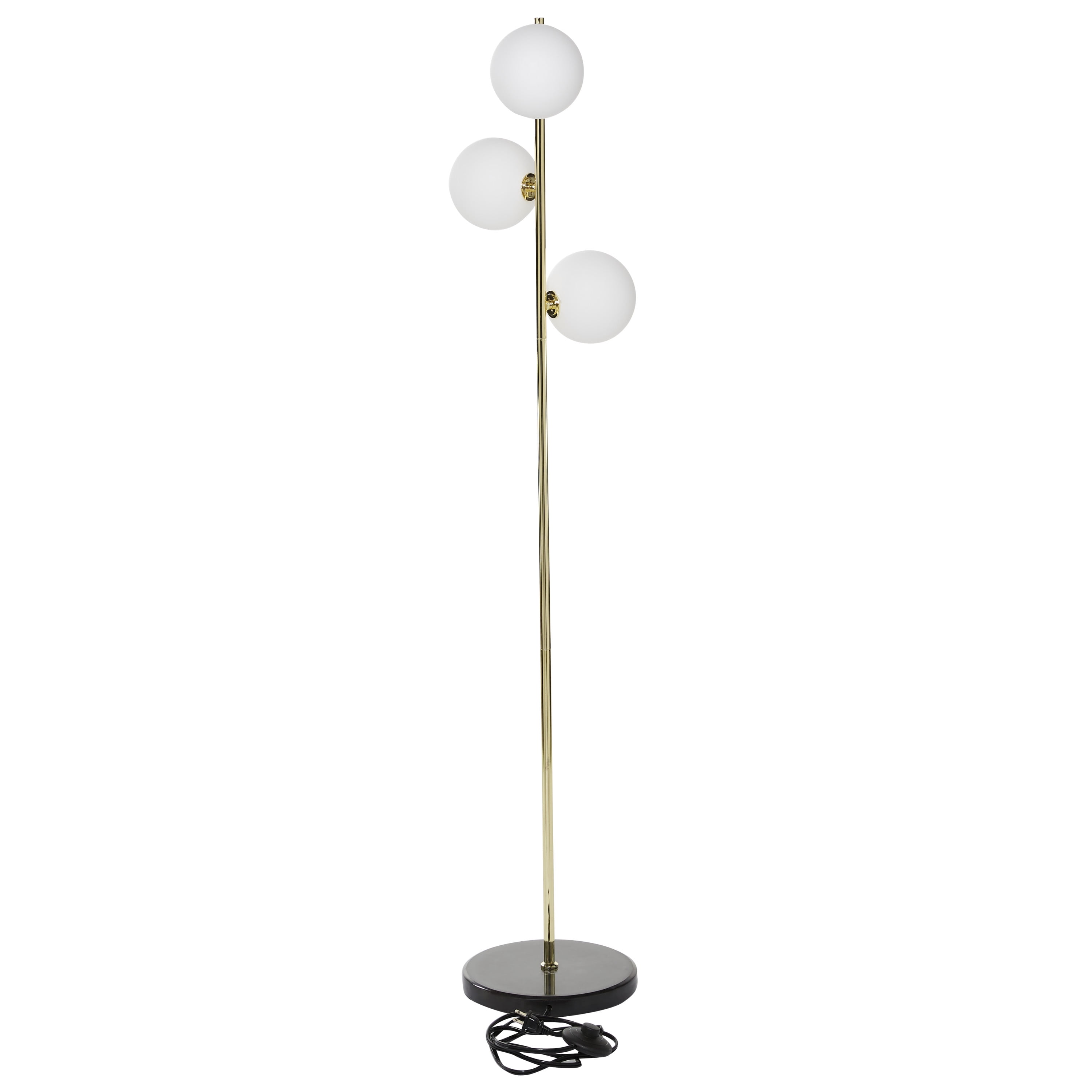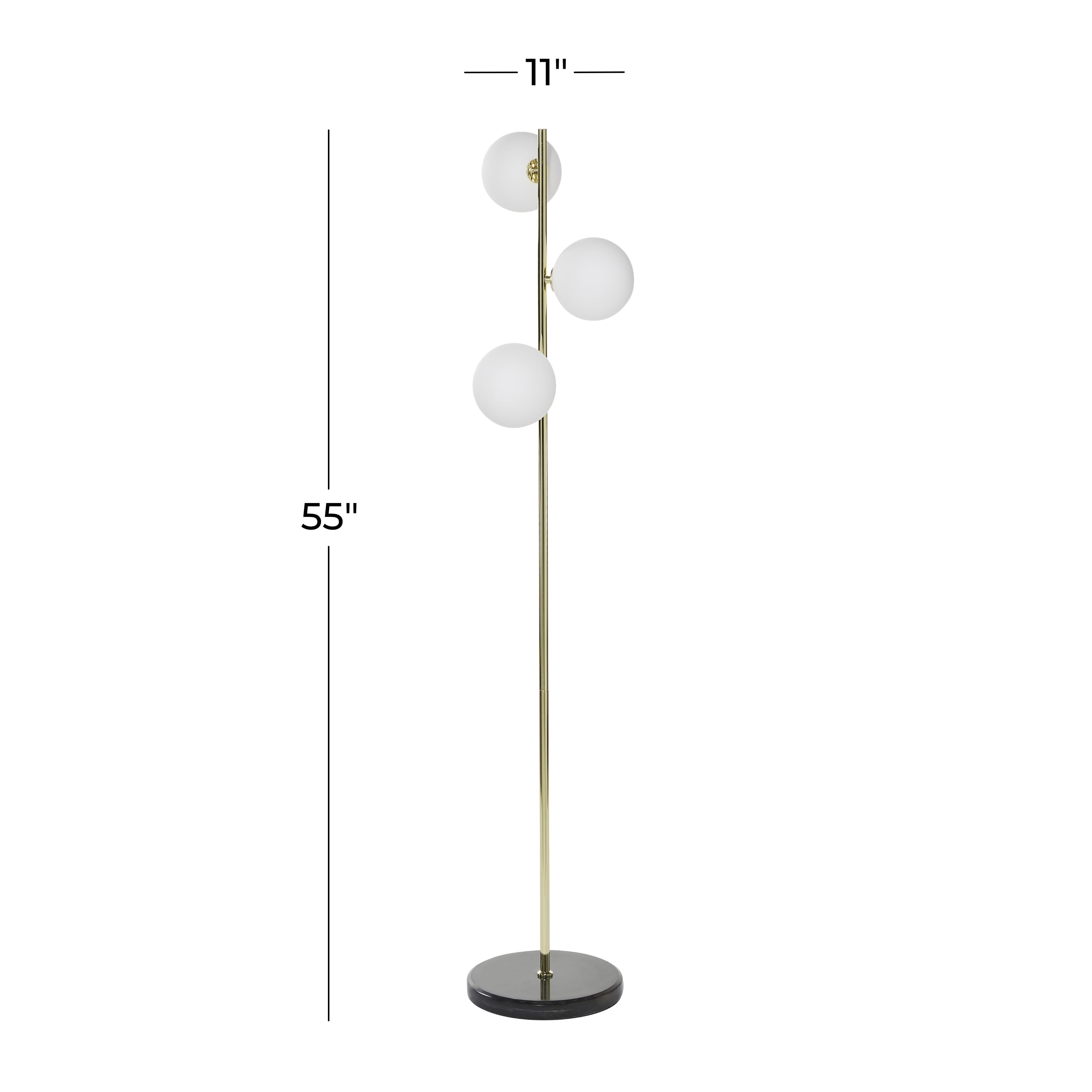 Modern style inspired by a minimalistic design with clean lines and angular structures Tall floor lamp featuring an iron stem with marble base and foot switch Modern floor lamp finished with a polished gold body, black base, and white bulb A tall design with three orbs that diffuse soft light throughout your living space This item measures 11.0L x 11.0W x 55.0H inches, and weighs 11.0 lbs This modern lamp has a slender design, round shaped bulbs with a round flat base Wipe clean with a dry cloth The modern lamp’s tall pole securely attaches to the marble base for stability Modern style CosmoLiving by Cosmopolitan 55″ 3 Light Gold Floor Lamp with White Glass Shade makes a perfect addition to any home
